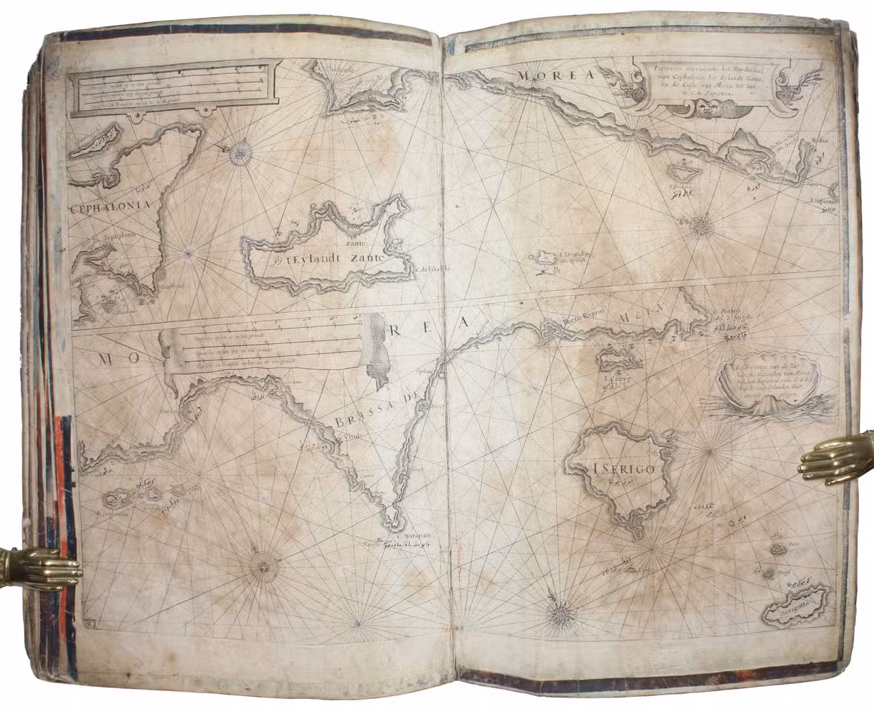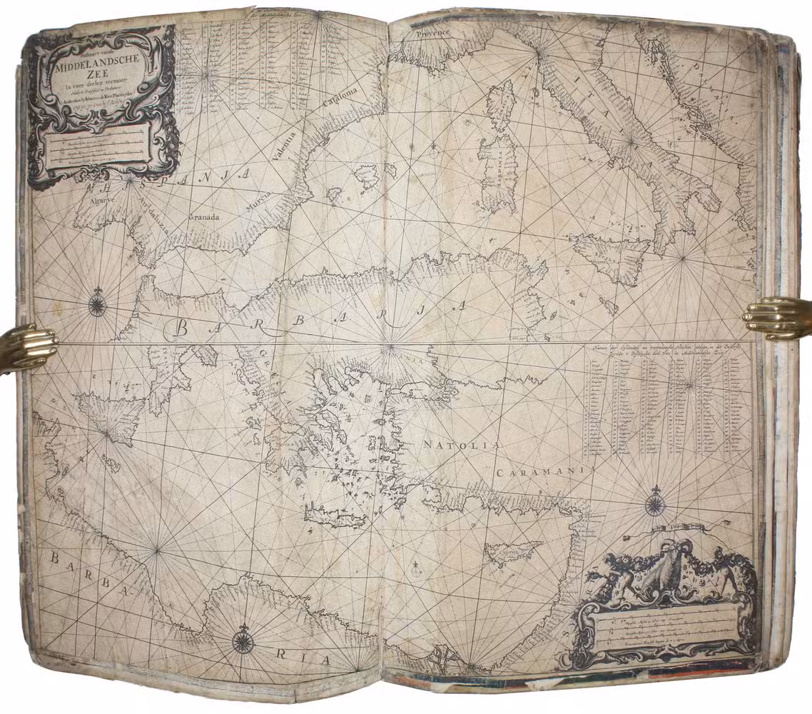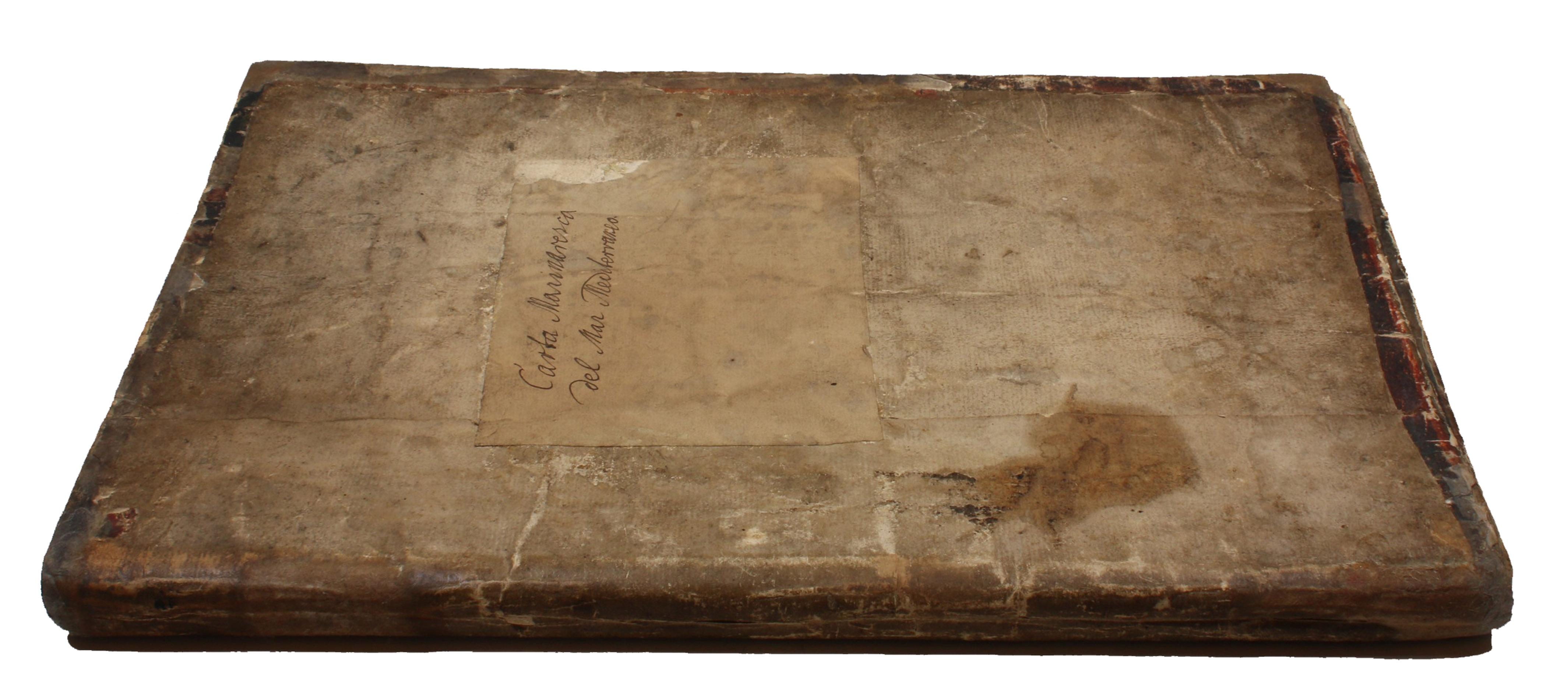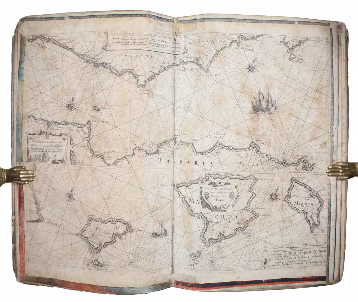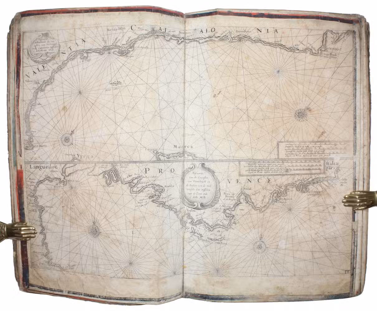 [Amsterdam, ca. 1670]. Folio (29 x 45 cm). With 9 double-page engraved charts only, each sheet ca. 44 × 55 cm, each mounted on stiff paper with maps back-to-back, with thick red and black ink borderlines. 8 of 9 maps are by Colom, numbered 2-9 in the plates from; plate 1 has been replaced with Johannes de Rams map of the Mediterranean: "Paskaart vande Middelandsche Zee In twee deelen vertoont". Contemporary stiff paper wrappers, with a manuscript label pasted upside down on the back wrapper, reading: "Carta Marinaresca del Mar Mediterraneo".