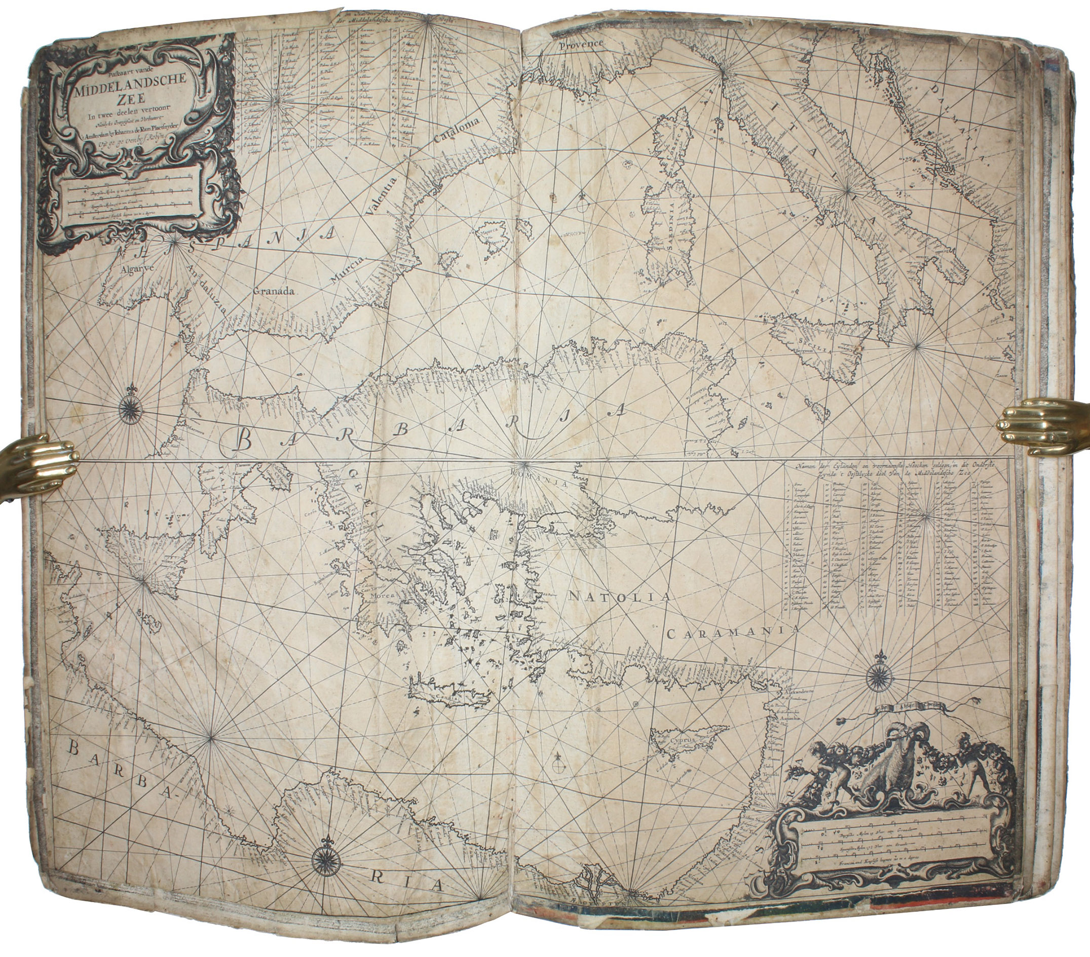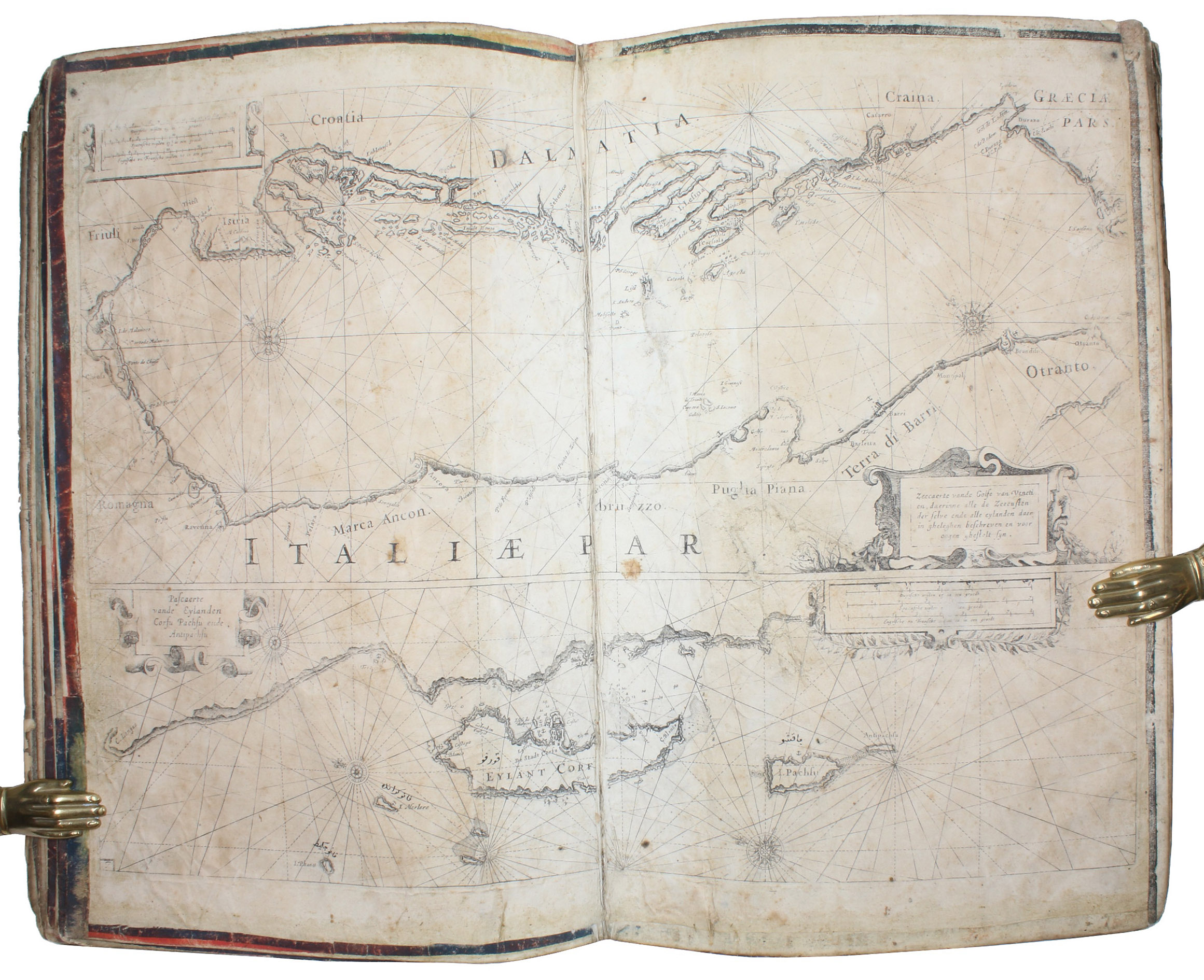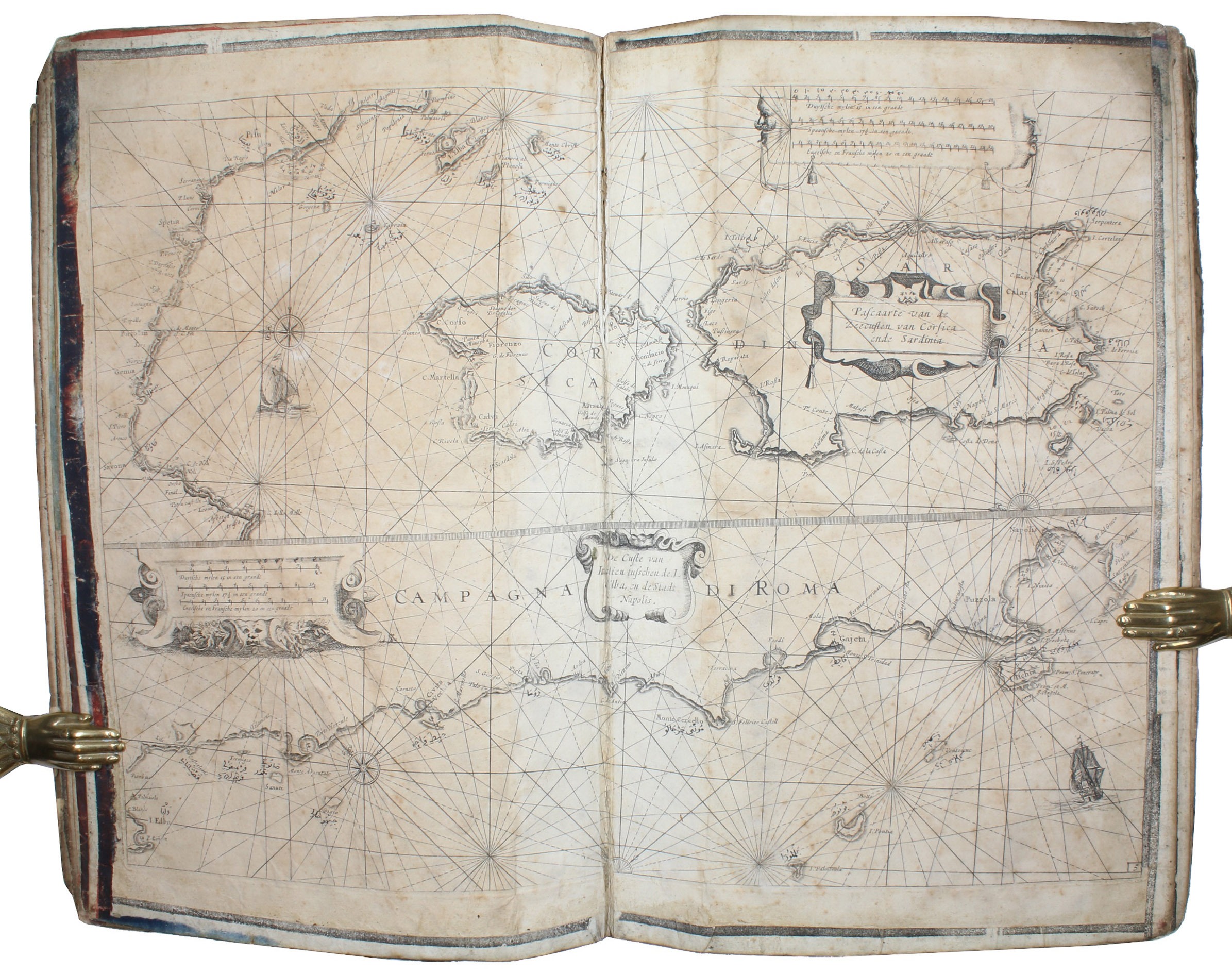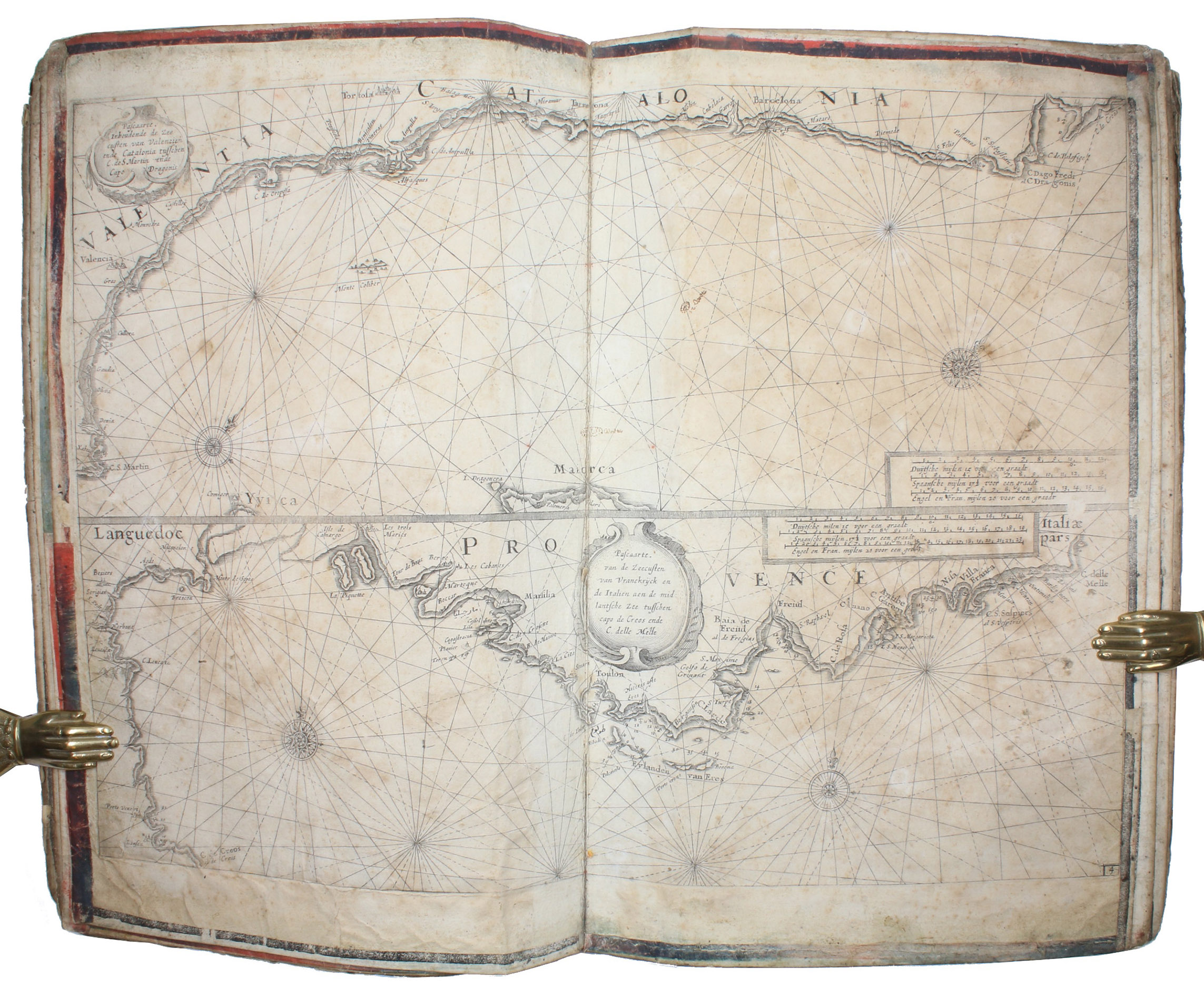 [Amsterdam, ca. 1670]. Folio (29 x 45 cm). With 9 double-page engraved charts only, each sheet ca. 44 × 55 cm, each mounted on stiff paper with maps back-to-back, with thick red and black ink borderlines. 8 of 9 maps are by Colom, numbered 2-9 in the plates from; plate 1 has been replaced with Johannes de Rams map of the Mediterranean: "Paskaart vande Middelandsche Zee In twee deelen vertoont". Contemporary stiff paper wrappers, with a manuscript label pasted upside down on the back wrapper, reading: "Carta Marinaresca del Mar Mediterraneo".