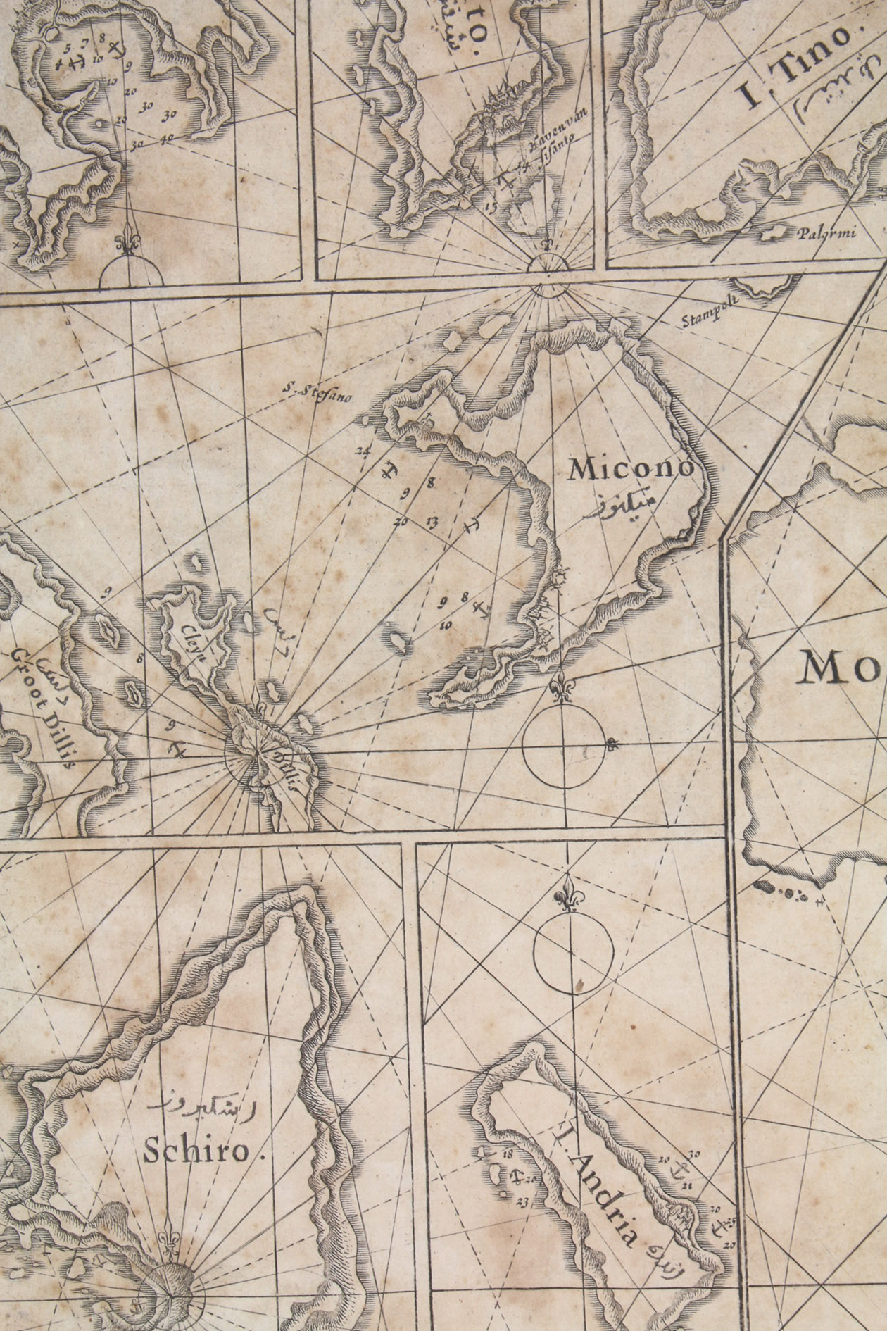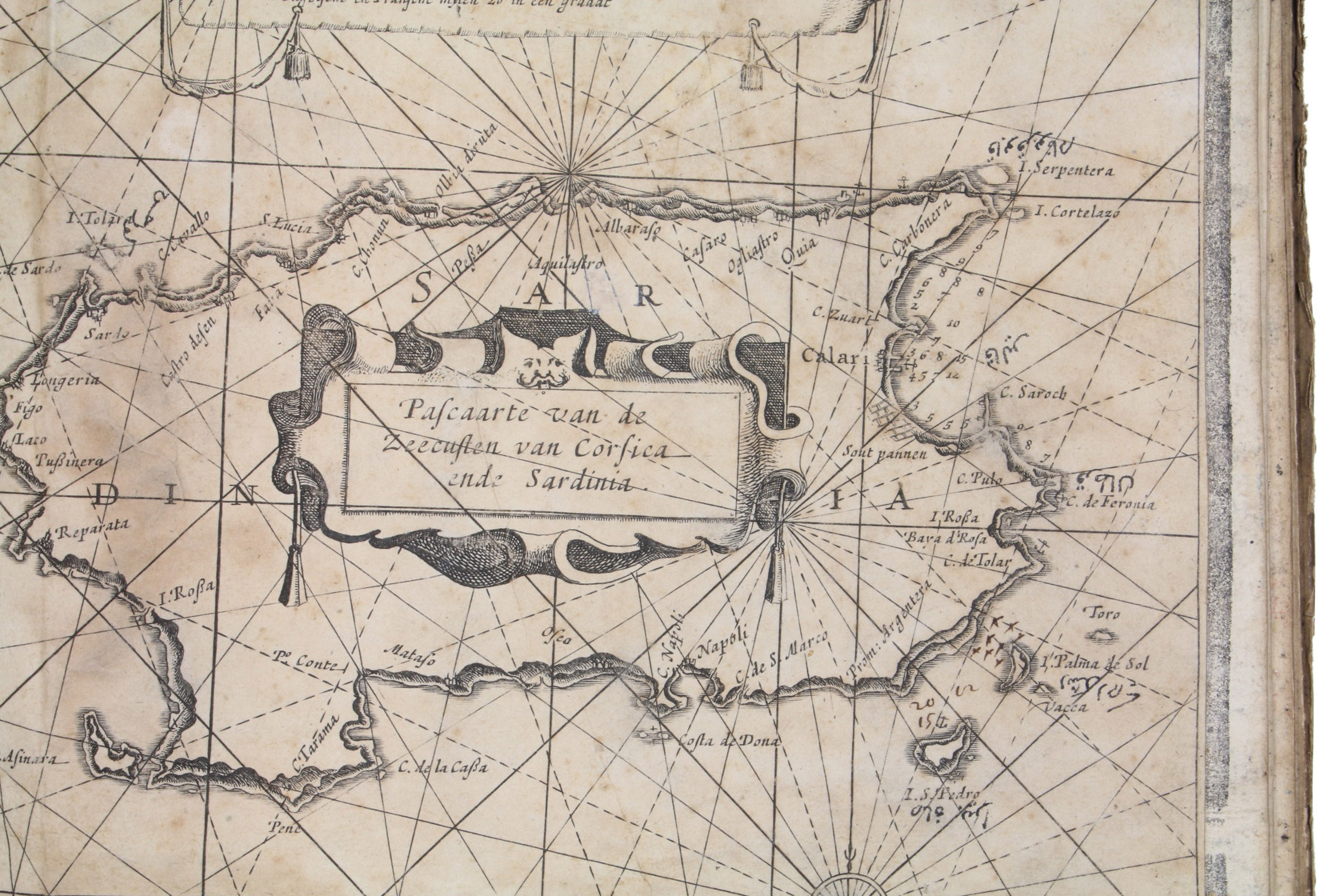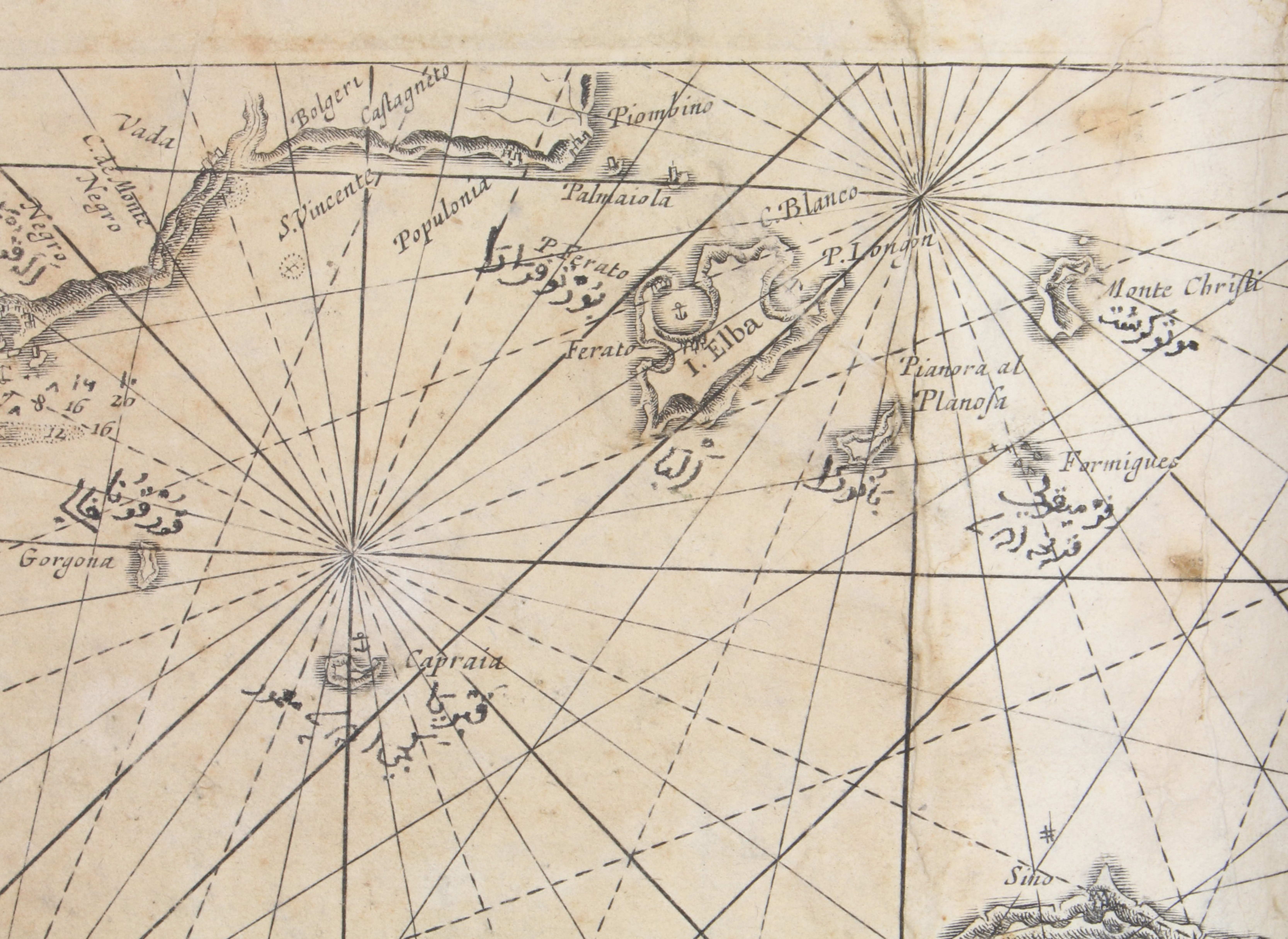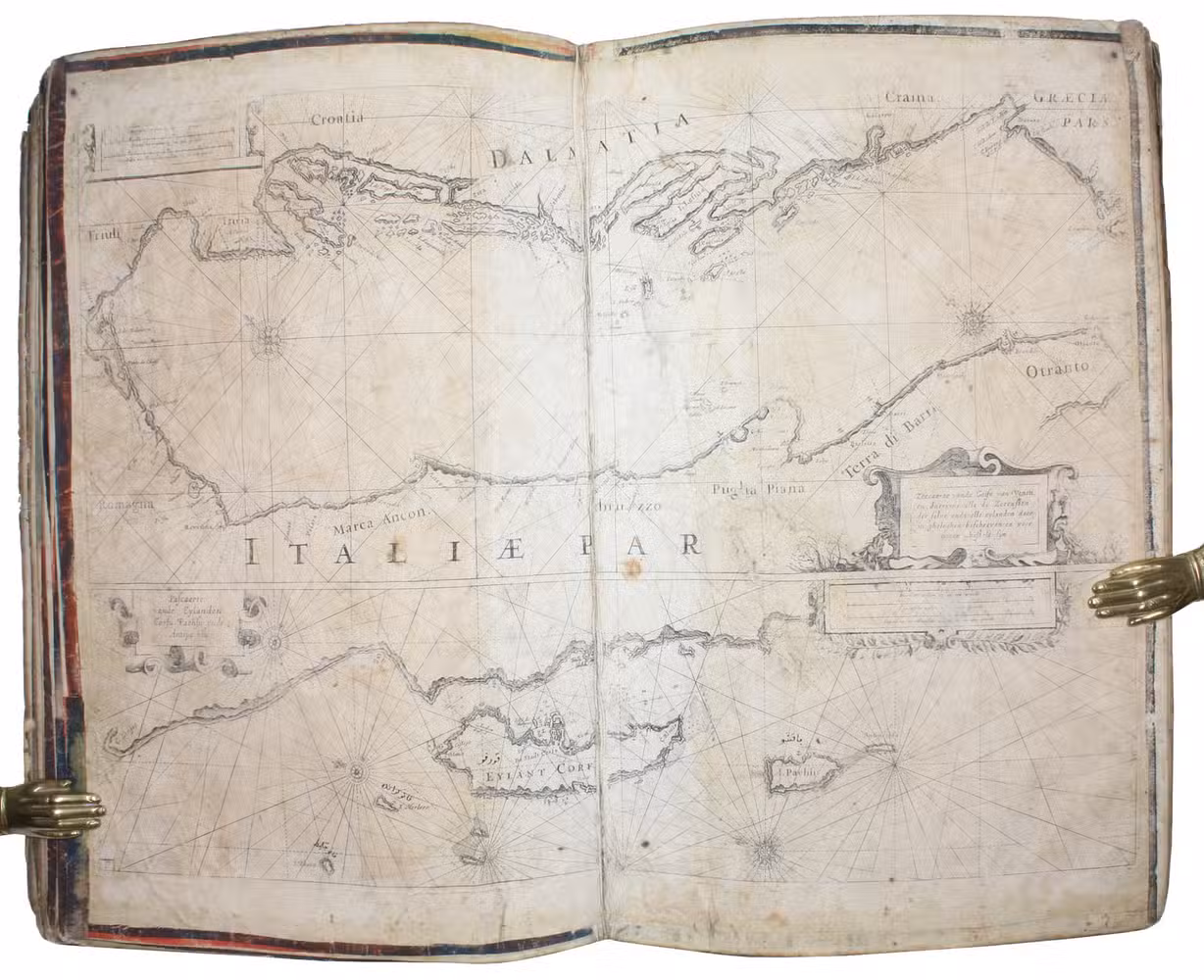 Unusual working copy of Coloms rare pilot, owned by an Ottoman Turkish mariner with his Osmanli inscriptions transliterating the location names throughout. Coloms charts cover the Straits of Gibraltar, the Barbary Coast, Mallorca, the coastline around Barcelona, Nice, Corsica, Sardinia, Southern Italy, Sicily, and Croatia. Koeman highlights the rarity of all of Coloms pilot books and notes that despite "thousands of copies [having been] circulated [...], only a score have survived".