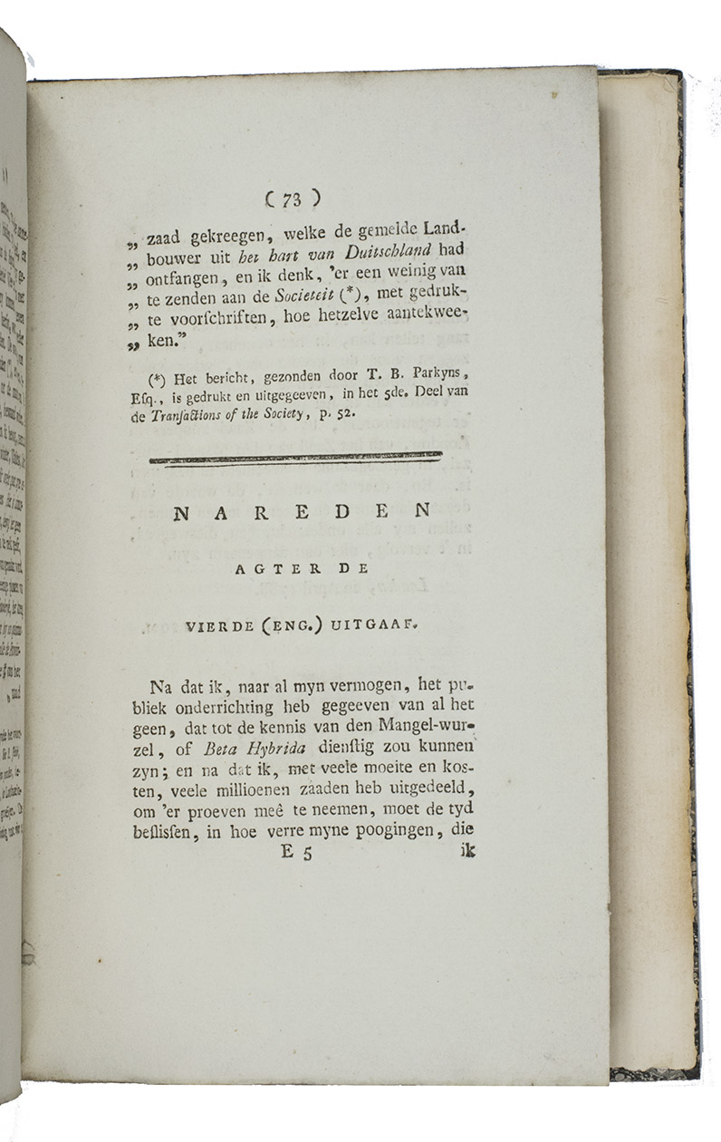 First edition of the Dutch translation of Instruction sur la culture, l'usage, et les avantages de la betterave champêtre ... by Abbé de Commerell (Paris, 1786), after the 4th edition of the English translation by John Coakley Lettsom. Translated into Dutch by Jan Christiaan Sepp. The mangel beet, a cultivar of the common beet Beta vulgaris, is now grown primarily as cattle fodder, but was formerly eaten by people and used to make a fermented drink.