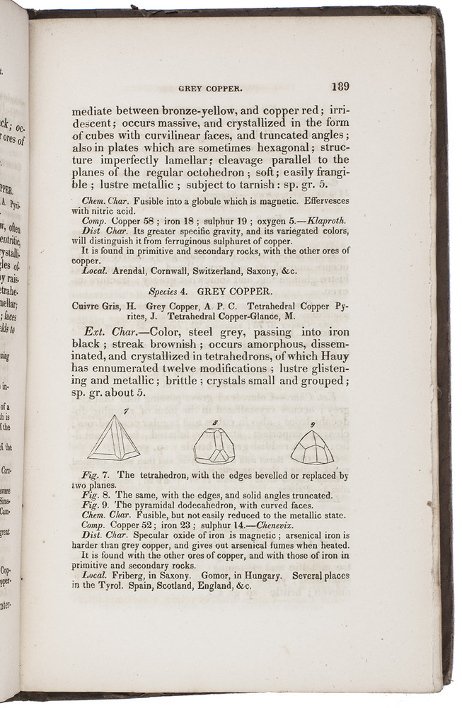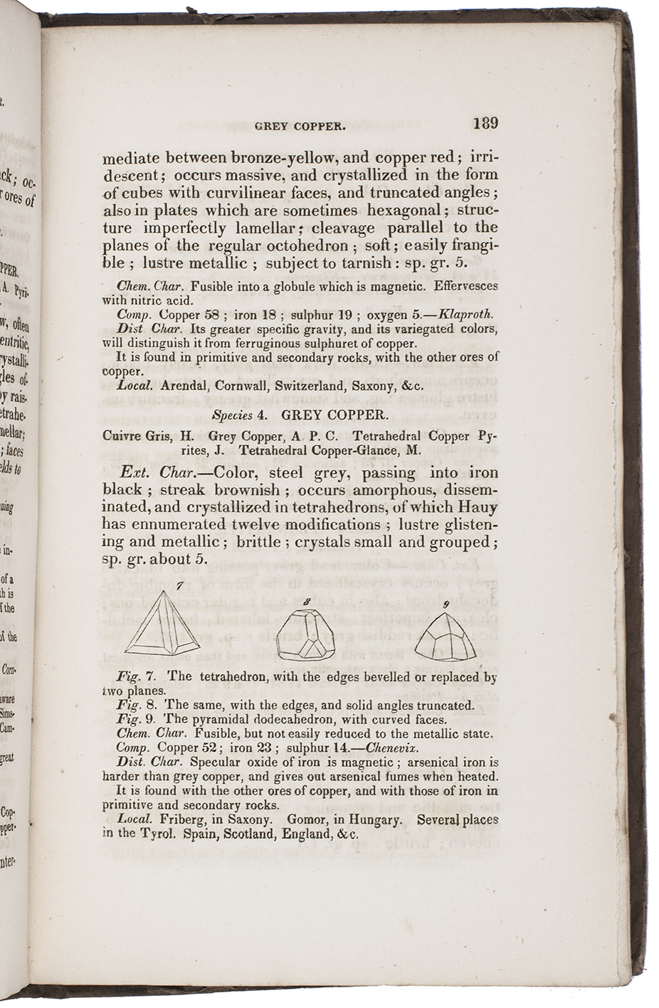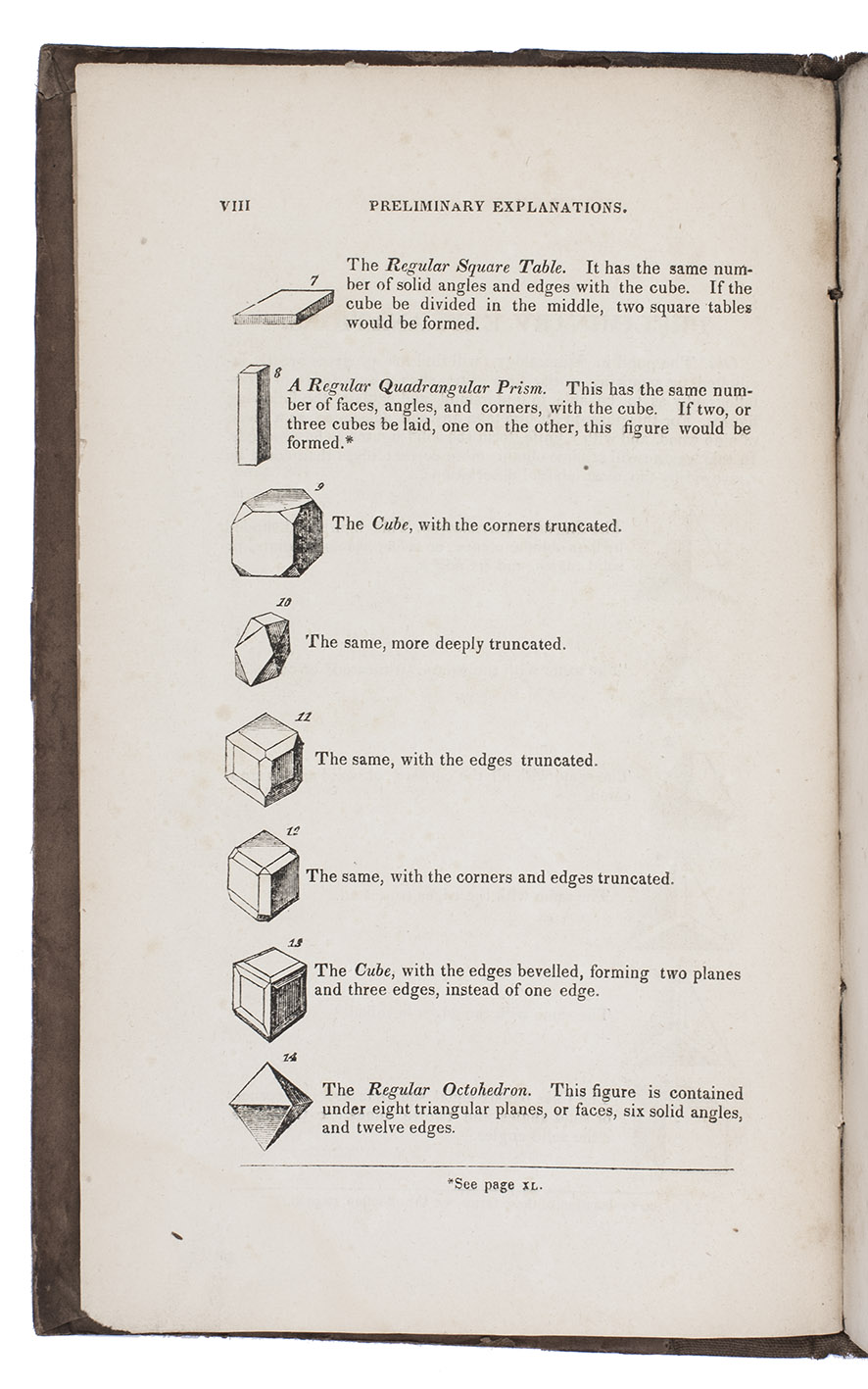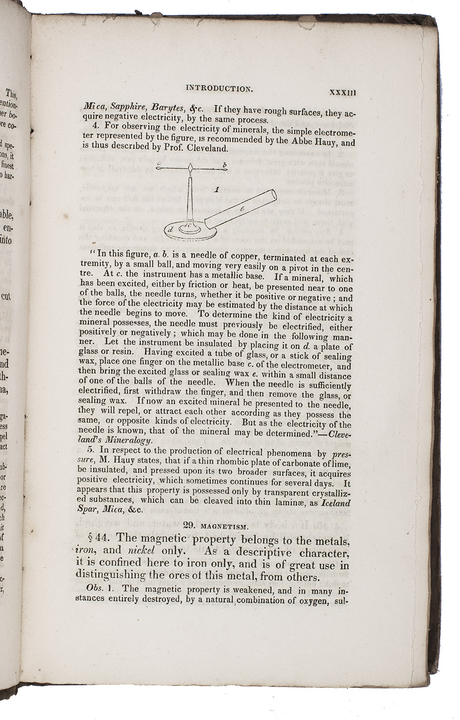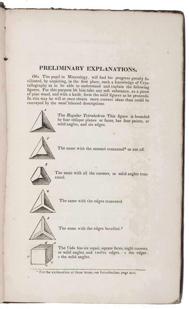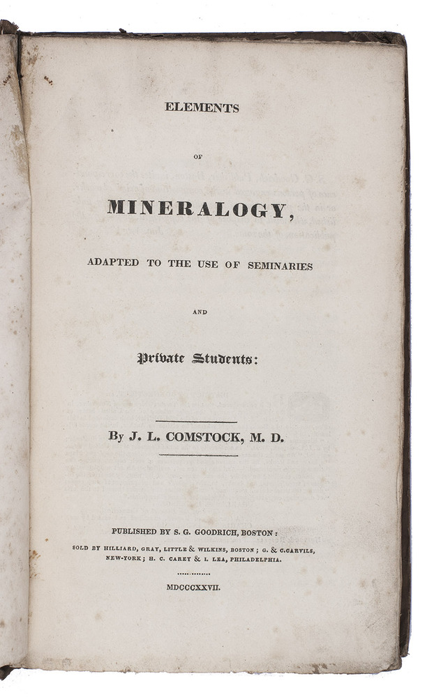 First edition of an introduction to mineralogy by the American surgeon John Lee Comstock (1789-1858), who wrote textbooks on chemistry, natural history, geography and physiography for American schools. "Elements is a volume that was designed as a less expensive and weighty alternative to Parker Cleaveland's landmark Treatise. It was intended to be used as a textbook in the schools and higher seminars in America, which were instructing students in mineralogy. Therefore, Comstock begins the volume with the basics, including preliminary definitions of mineralogy and geology and the characters of minerals, and continues into slightly expanded definitions of external characters, color, luster, cleavage, transparancy, etc. The greater majority of the volume is then given over to the describing of specific mineral species" (Schuh).