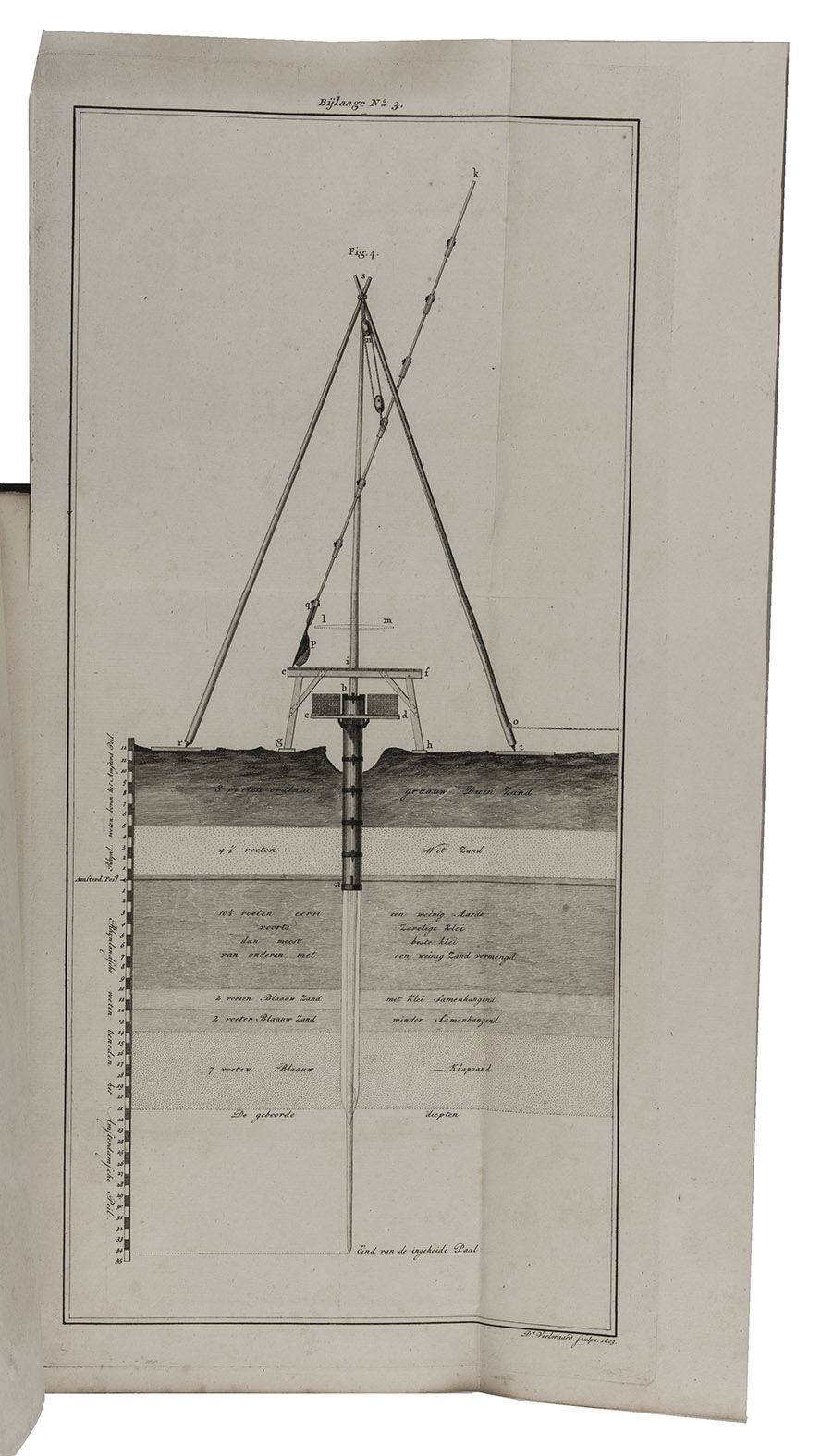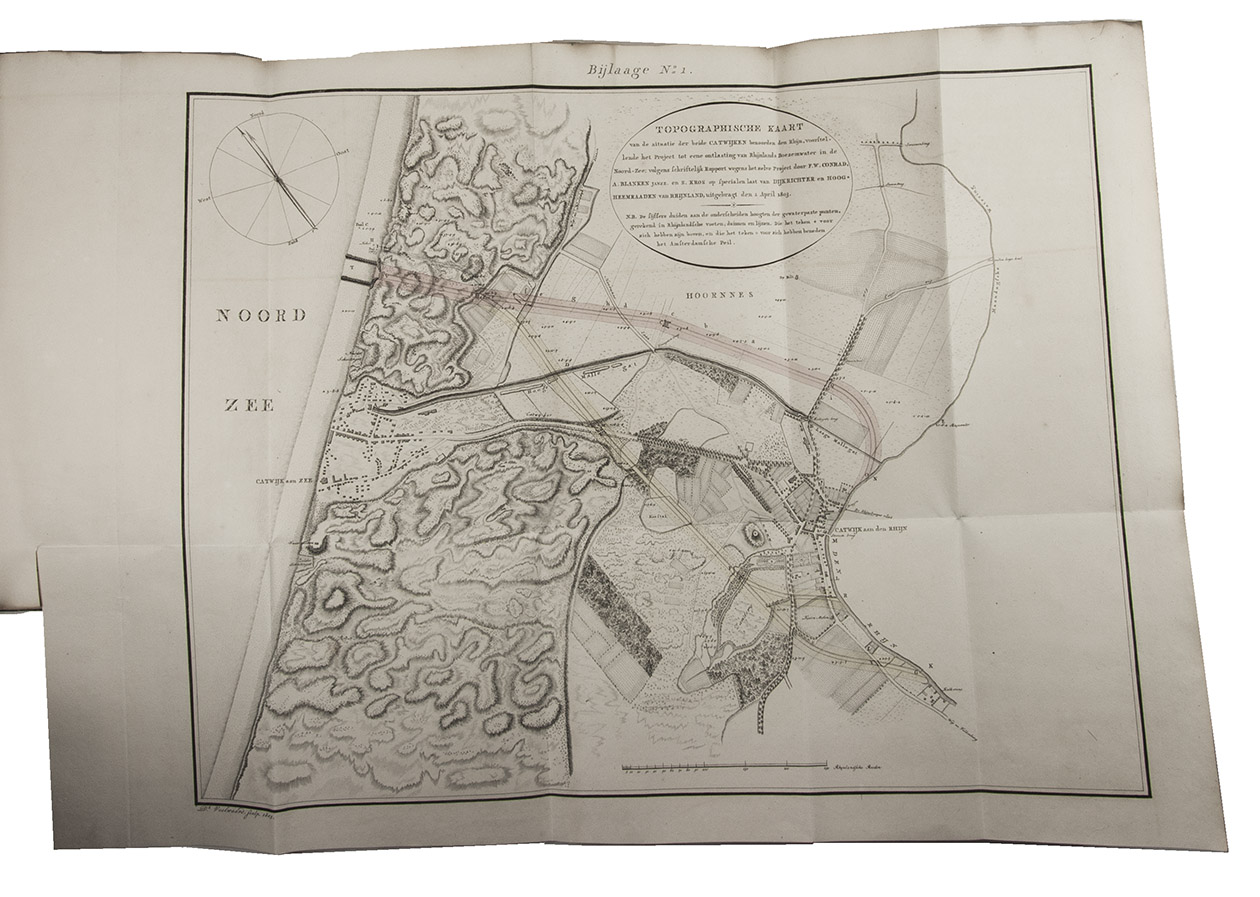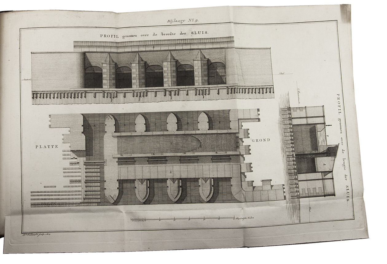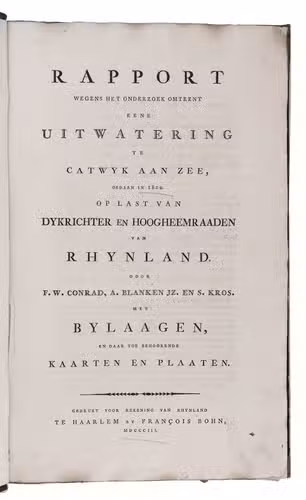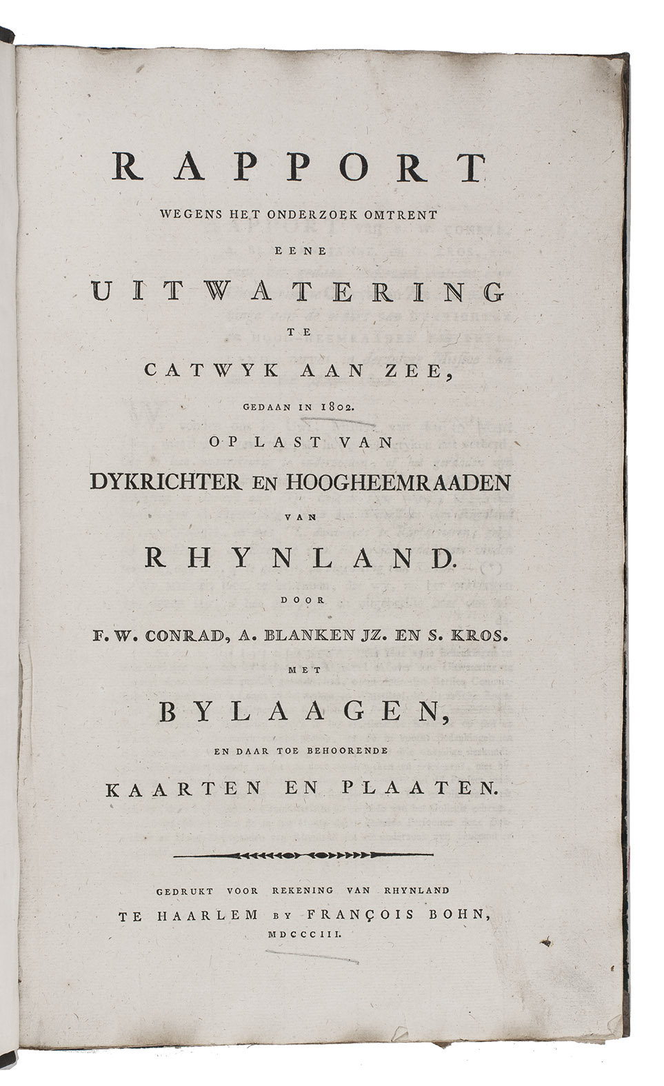 First edition of an illustrated report on water management, published by three leading technical officers on behalf of the water board of Rijnland, here complete with all four appendices, sometimes lacking. In their report, Frederik Willem Conrad (1769-1805), Arie Blanken Jansz. (1766-1824) and Simon Kros (1746-1813) evaluate the several possibilities of connecting the river Oude Rijn with the North Sea. In 1803 a research commission chaired by Conrad came up with the present report, providing a definite scheme and an acceptable calculation of the costs. The water board accepted the proposals later that year and preparations for realizing the drainage canal commenced. In 1807 the outlet was completed, providing Rijnland with an excellent facility that proved its great benefits in the long term. The report includes several printed appendices and 18 engraved maps, profiles and technical drawings. Besides 2 overview maps, they include engravings showing several tracks of the proposed channel, detailed cross-sections, and profiles of soil test bores and the instruments used.