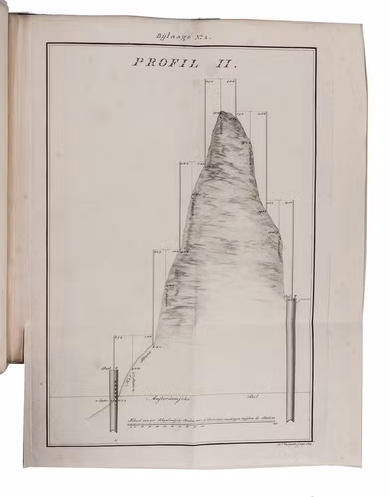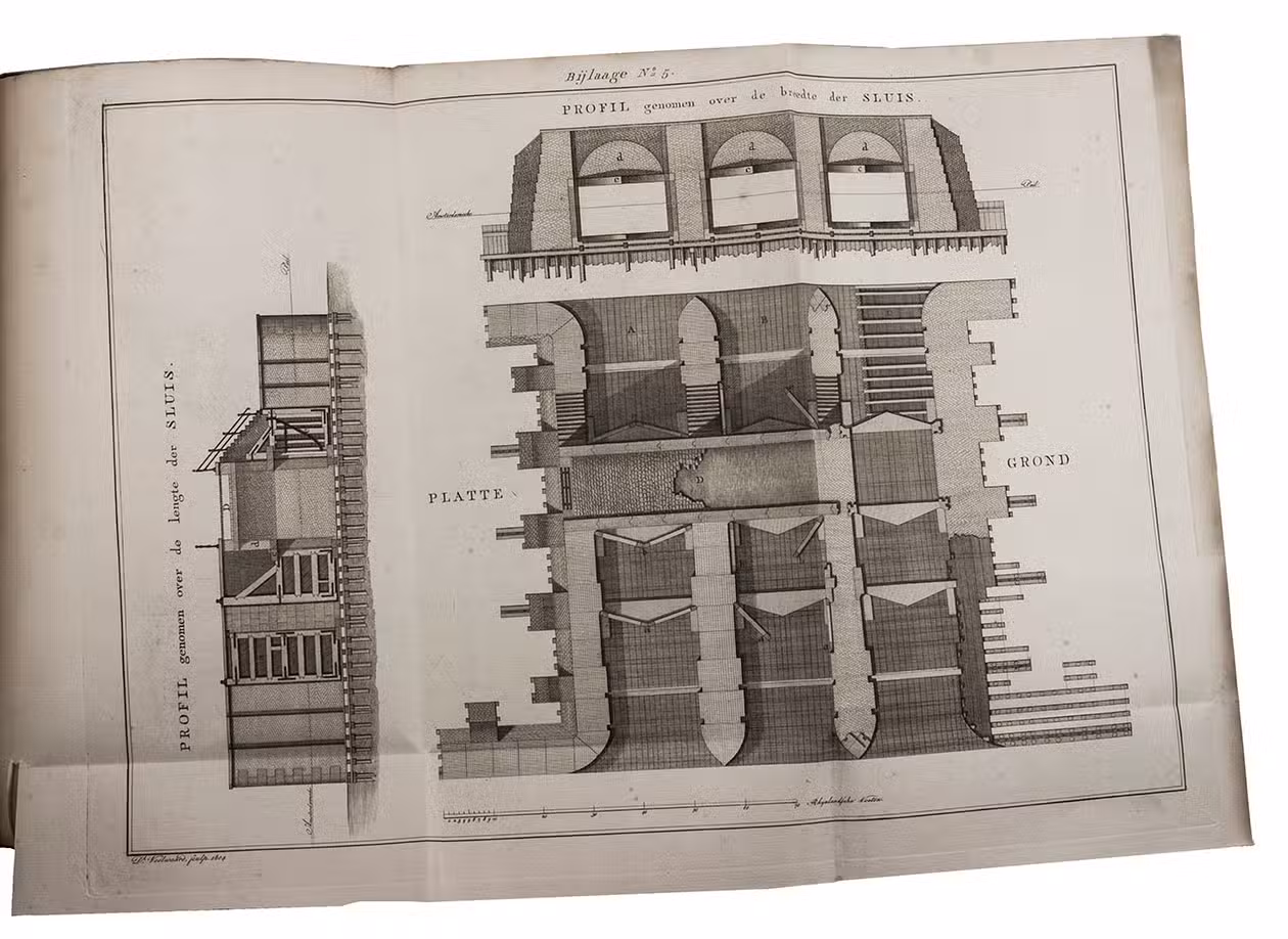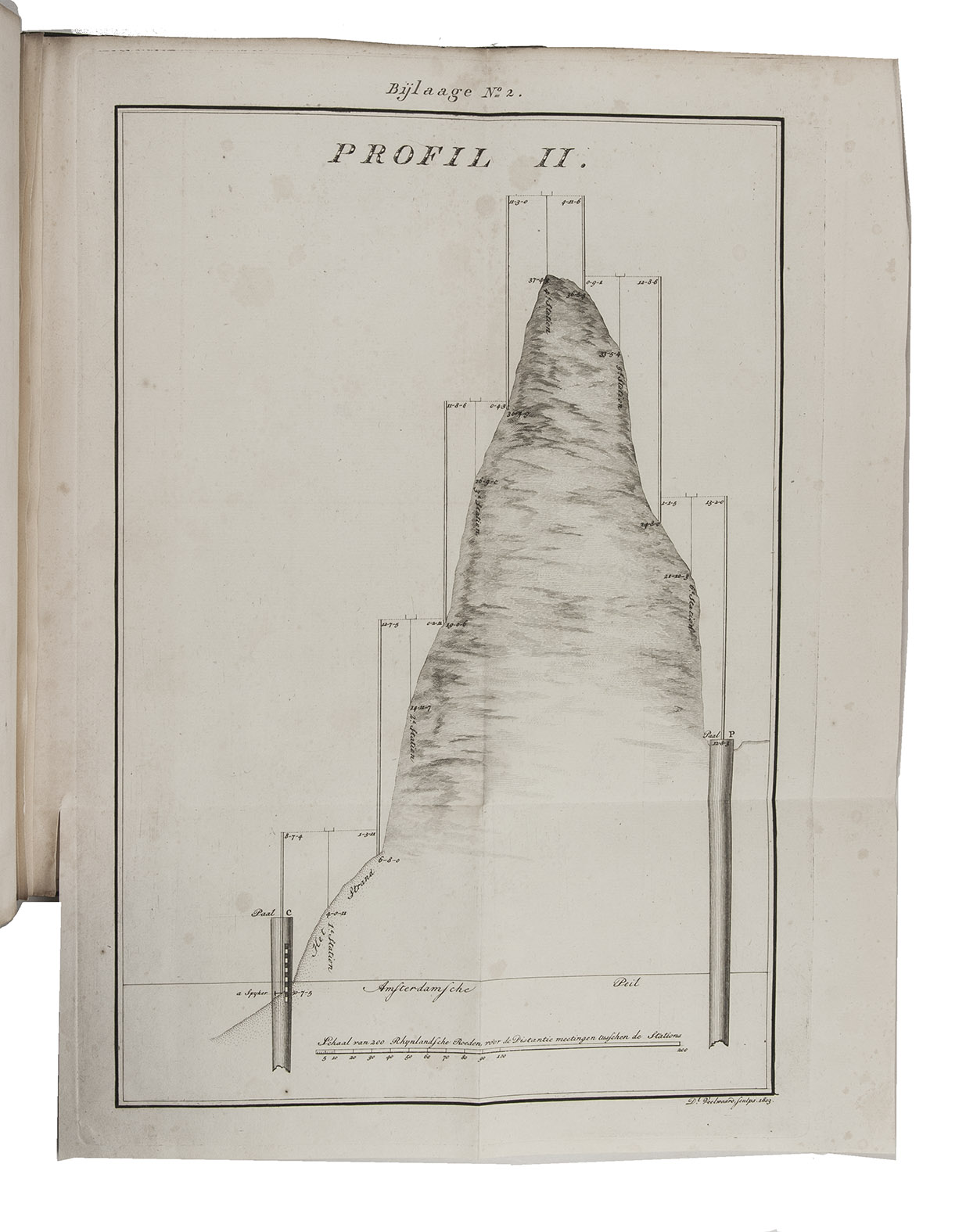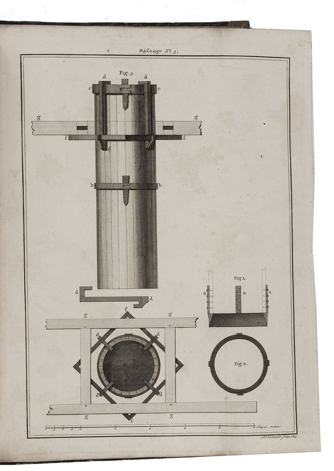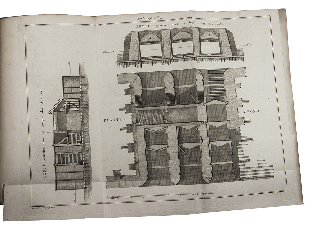 First edition of an illustrated report on water management, published by three leading technical officers on behalf of the water board of Rijnland, here complete with all four appendices, sometimes lacking. In their report, Frederik Willem Conrad (1769-1805), Arie Blanken Jansz. (1766-1824) and Simon Kros (1746-1813) evaluate the several possibilities of connecting the river Oude Rijn with the North Sea. In 1803 a research commission chaired by Conrad came up with the present report, providing a definite scheme and an acceptable calculation of the costs. The water board accepted the proposals later that year and preparations for realizing the drainage canal commenced. In 1807 the outlet was completed, providing Rijnland with an excellent facility that proved its great benefits in the long term. The report includes several printed appendices and 18 engraved maps, profiles and technical drawings. Besides 2 overview maps, they include engravings showing several tracks of the proposed channel, detailed cross-sections, and profiles of soil test bores and the instruments used.
