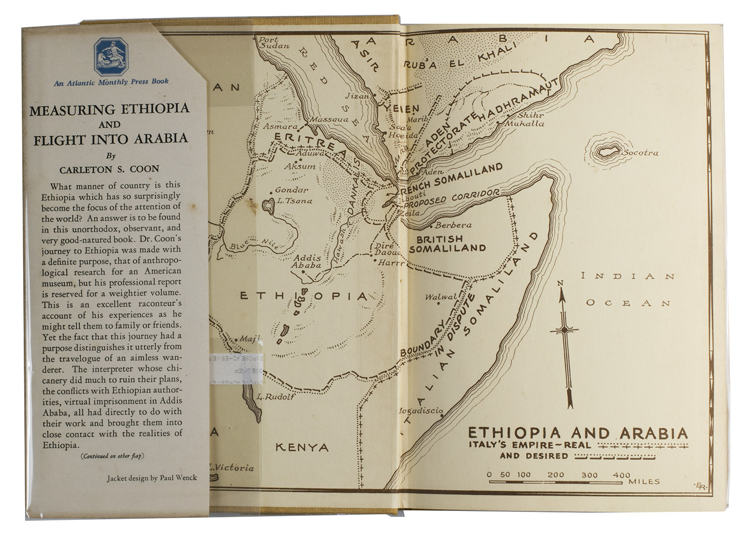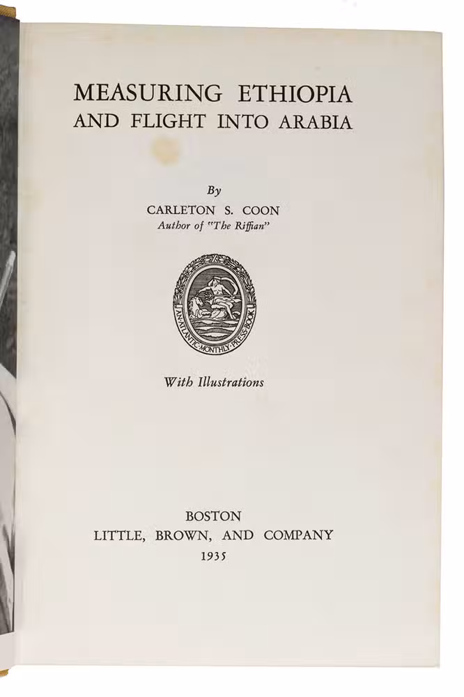 First edition of Carlton S. Coon's account of his experiences in Ethiopia and Arabia. From 1933 to 1934 he travelled through Ethiopia to conduct physical anthropological research, but after conflicts with the authorities he had to escape to Arabia. Coon states in his foreword that the purpose of the present work is a memoir, since it was not meant to "impress the public with our scientific findings, for, interesting as these results may or may not be, they are reserved for more formal publication", but simply to tell what he and two others did during the expedition. Carleton Stevens Coon (1904-1981) was an American anthropologist and professor of anthropology at Harvard University and the University of Pennsylvania, who spoke 10 languages. He made notable contributions to the fields of cultural and physical anthropology and archaeology. He was the author of multiple works, including highly controversial works on race, such as The origin of races (1962). His theories on race were widely disputed in his lifetime and are considered pseudoscientific in modern anthropology.