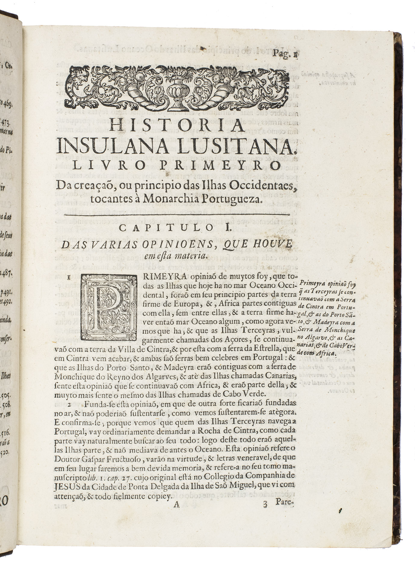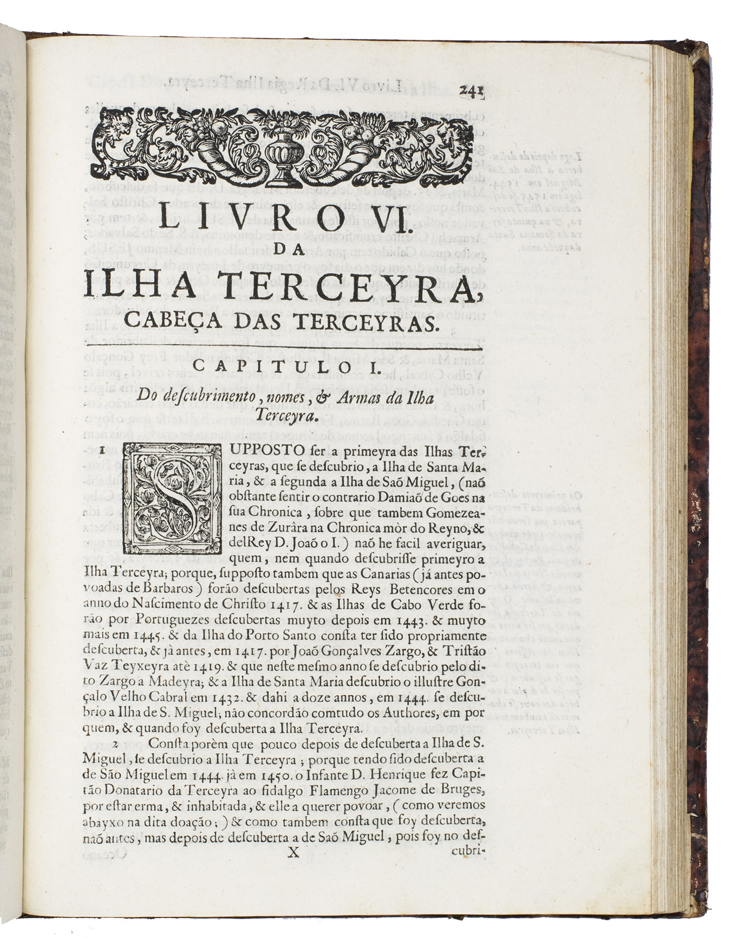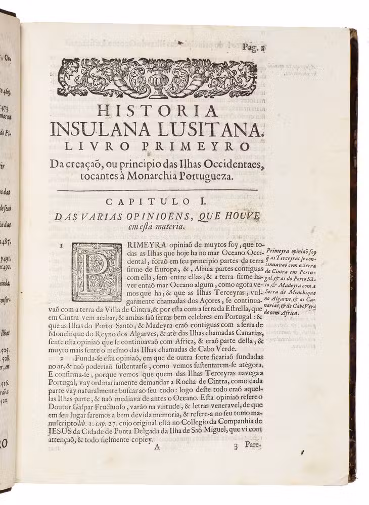 First edition of a history of the collection of four archipelagos in the North Atlantic, off the coasts of Africa and Europe, called Macaronesia, and the Azores in particular, written by a native of Terceira. The work describes each island separately, focussing on its history, discovery, natural resources and inhabitants. It also gives important information on prominent Azorean families, including the author's own. These parts are preceded by shorter parts about the history of Portugal, the Canaries, Cape Verde and Madeira, with references to Brazil and the Americas. This work rarely appears on the market.