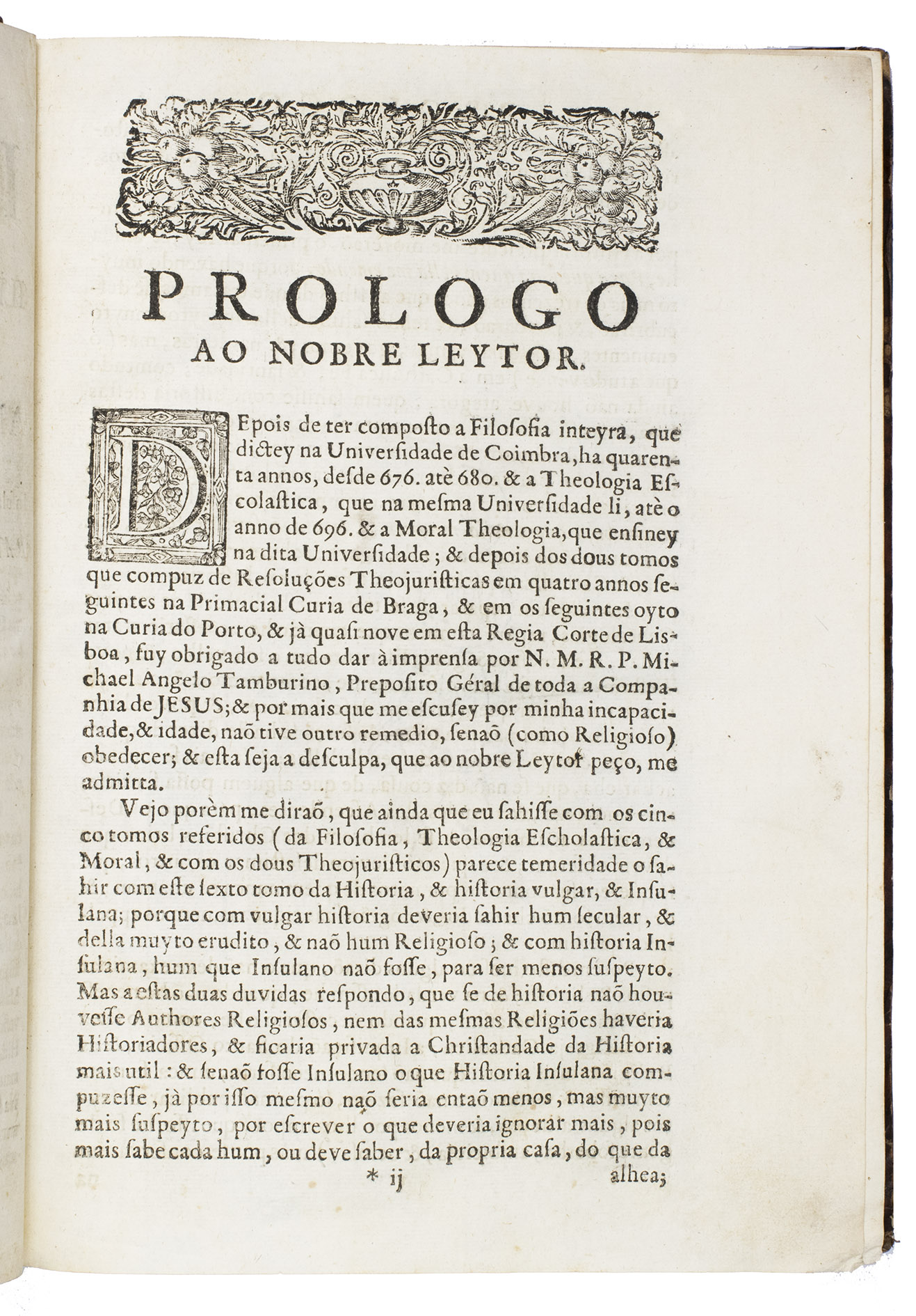 Lisboa occidental, Na officina de Antonio Pedrozo Galram, 1717. Small folio (ca. 28 x 21 cm). With a woodcut printer's device on the title-page, woodcut decorated initials, and woodcut head- and tailpieces. Gold-tooled brown calf from the first half of the 19th century. [1], [1 blank], [14], 528 pp.