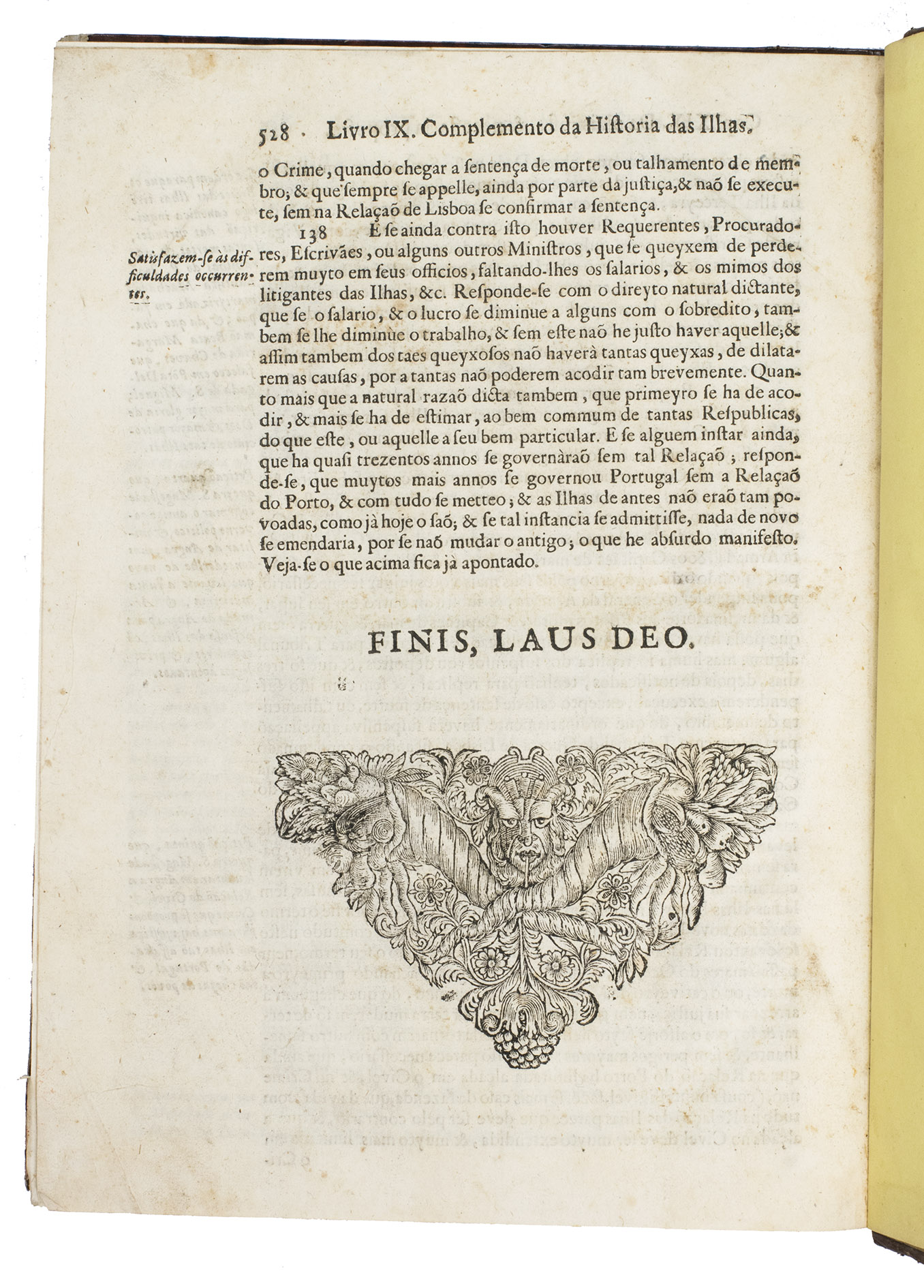 With a manuscript number on the front pastedown ("6770"), a round sticker underneath ("66"), and remnants of a paper label. The edges and corners of the boards are somewhat scuffed and creased. The binding is somewhat scratched, with some loss of material on the back board. The first few leaves are slightly browned. Otherwise in very good condition. De Backer/Sommervogel II, 1436; Innocencio I, pp. 114; Leclerc 632; Porbase 765570 (10 copies); Sabin 16759; Schäffer, Portuguese exploration to the West, p. 14; not in USTC.