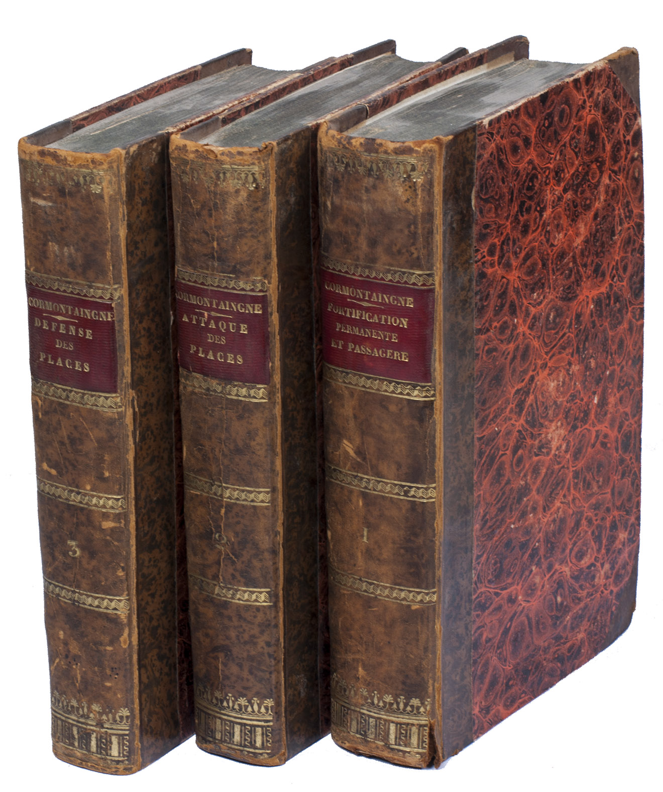 The complete posthumous works of Louis de Cormontaingne (ca. 1696-1752), the leading French fortifications engineer of his day and from 1748 Maréchal de Camp in the French army. The three volumes form a complete handbook of fortification, with the first devoted to the design and construction of permanent and temporary fortifications, the second to offense in siege warfare and the third to defence. All three are extensively and clearly illustrated. Cormontaingne joined the Corps du Génie less than a decade after the death of Sébastien Le Prestre de Vauban (1633-1707) and is regarded as his successor, establishing his reputation with the fortifications of Metz in 1728. Vauban completely dominated French and to some degree international fortification for decades after his death, but offensive tactics steadily gained ground while defensive tactics remained largely the same, so Cormontaigne introduced some improvements into Vauban's methods.