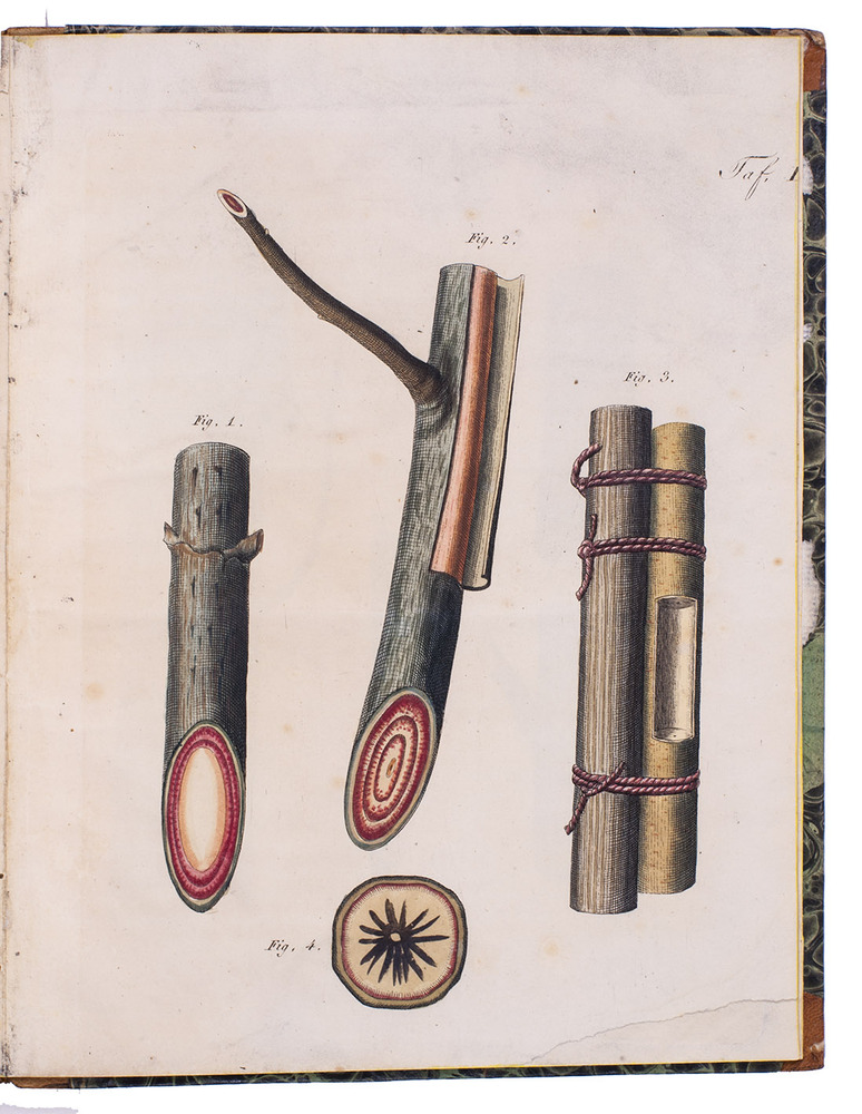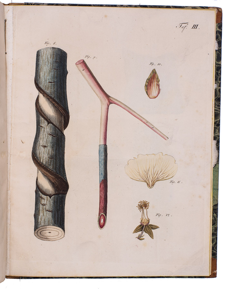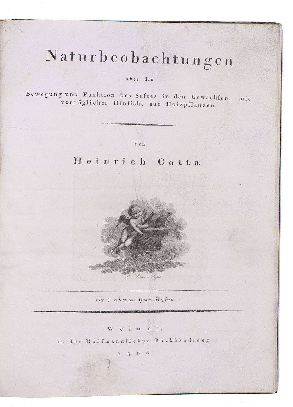 First edition of an early work on endosmosis (the movement of the sap in the stem) by the German silviculturist Heinrich Cotta (1763-1844), with 7 hand-coloured engraved plates of tree branches and bark. Active research on endosmosis was done in Germany by vegetable physiologists between 1804 and 1840. The work opens with a preface, introduction and table of contents, followed by the main text discussing the movement of sap in woody plants and its function. It is "in many respects an instructive work" (Sachs).