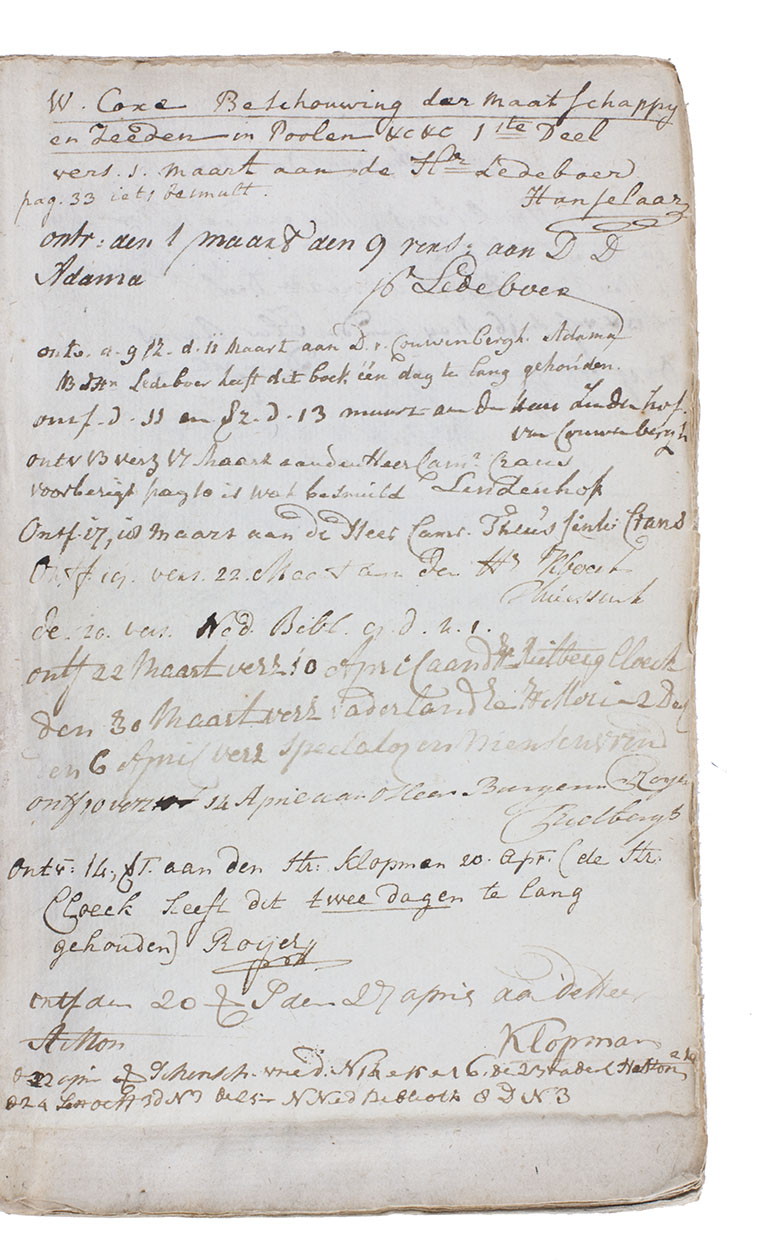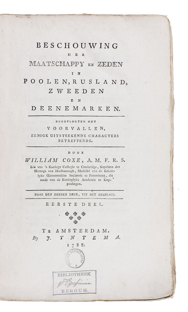 Dutch adaptation of Travels into Poland, Russia, Sweden and Denmark. William Coxe (1748-1828), Anglican priest, historian and tutor to various young noblemen, travelled extensively in northern Europe as tutor and companion to George Herbert (1759-1827), son of the Earl of Pembroke, who was to succeed to his father's title in 1794. The account of his travels, containing first-hand observations and gleanings from local contacts, together providing "a vast amount of historical and cultural material" (Van Gestel-Van het Schip), proved very popular and was reprinted several times.