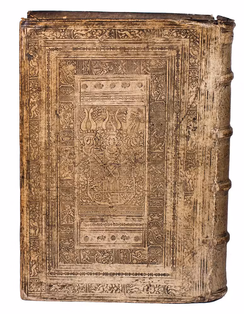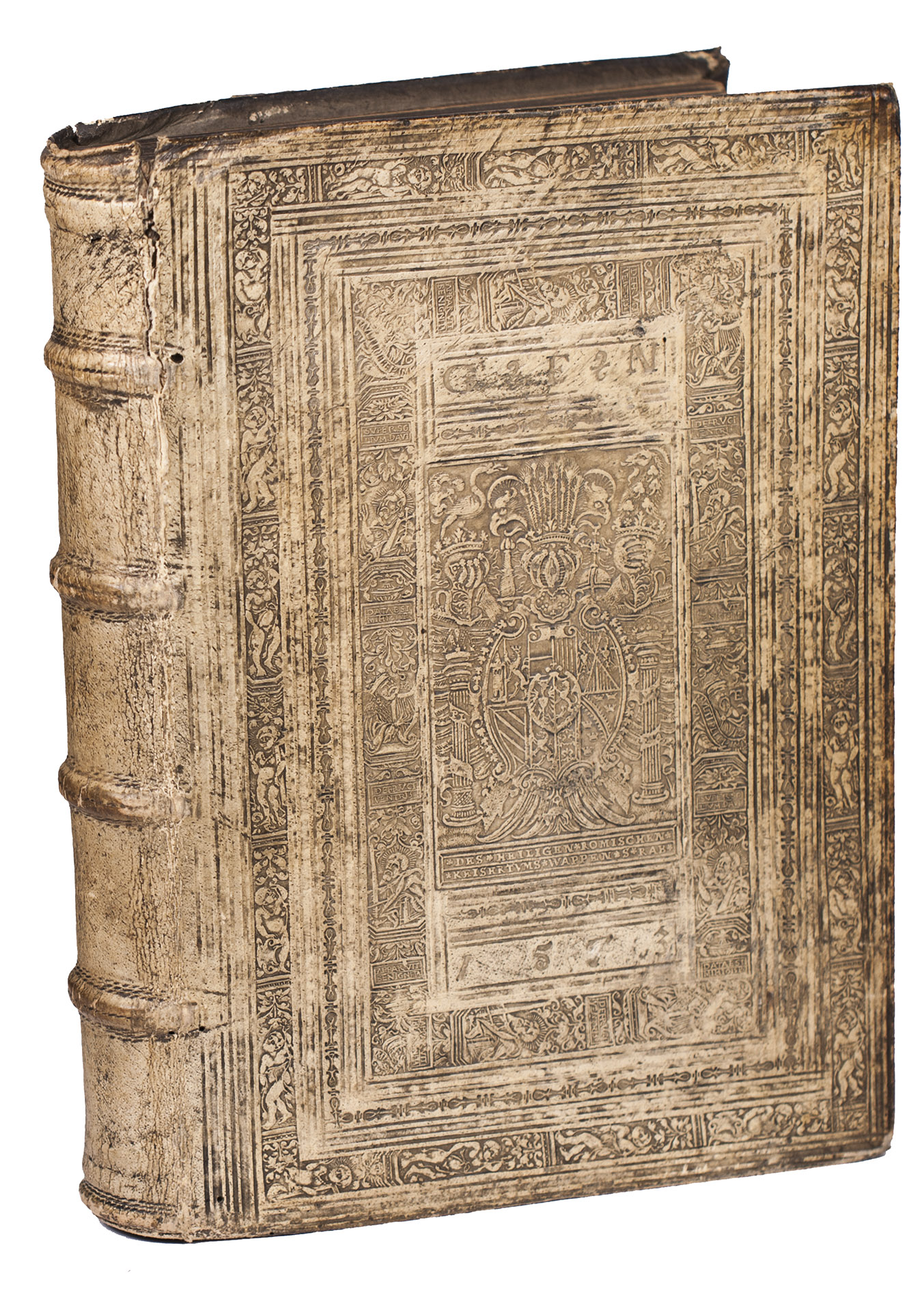 1572. 3 works in 1 volume. 4to. With a woodcut printer's device on the title page of ad 1, several decorated woodcut initials. Contemporary richly blind-tooled panelled pigskin, with the arms of the Holy Roman Empire in the central panel on the front, and the arms of August of Saxony on the back, surrounded by two figurative and one ornamental border, the initials G.F.N. and the date 1573 on the front, signed by bookbinder S. Rab(e). [18], 321, [1] ll.; 102, [2 blank]; [1], [1 blank], 5, [1 blank] pp.