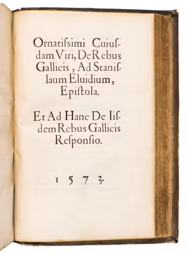 With: (2) [PIBRAC, Guy du Faur, seigneur de]. De rebus Gallicis, ad Stanislaum Elvidium, epistola. Et ad hanc de iisdem rebus Gallicis responsio.