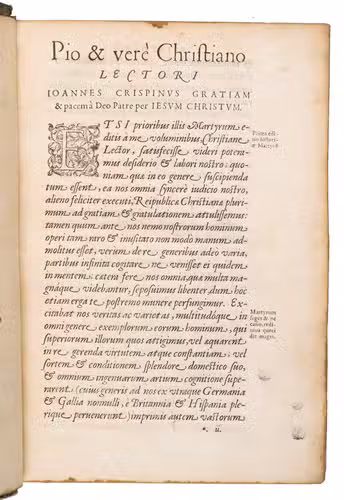 Jean Crespin (ca. 1520-1572) was born in Arras, but studied law in Leuven, where he learned about the Reformation, and became a sympathiser. When this was discovered, he had to give up his career as a lawyer and flee to Geneva, where he set up a printing-press. He published numerous works by Genevan reformers as Calvin, Beza and Bullinger, promoting the Protestant cause. As an author, Crespin's greatest work is unquestionably the present martyrology which considerably contributed to influence the spread of Calvinism.