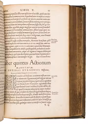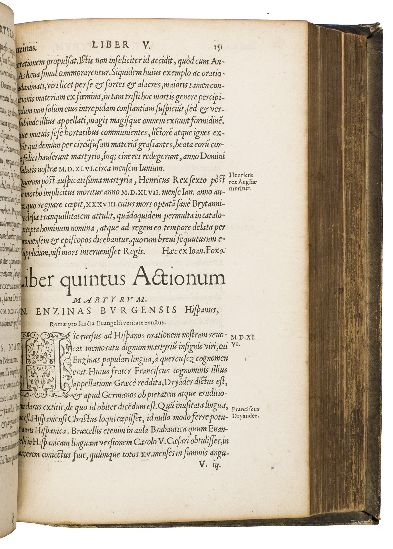 Extended Latin edition of a celebrated Protestant martyrology, in a beautiful contemporary blind-stamped pigskin binding, which has been signed by the binder. The work comprises descriptions of the lives and works of early Reformers as Wyclif, Hus, and Jerome of Prague as well as of many lesser known martyrs of later times who entertained Nonconformist or heretical views. It contains the texts of numerous contemporary documents, including confessions of faith, court reports, eye witness accounts, and letters to and from the prisoners, and is therefore an important source on the Reformation.