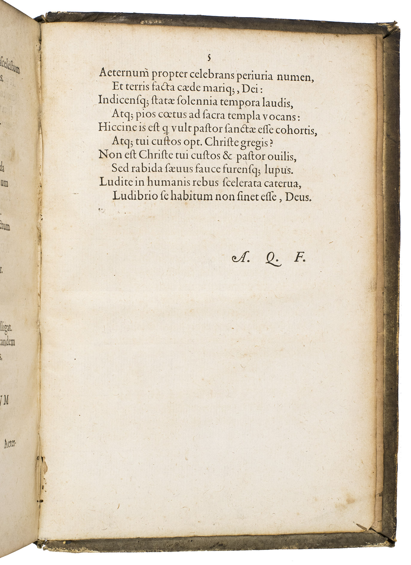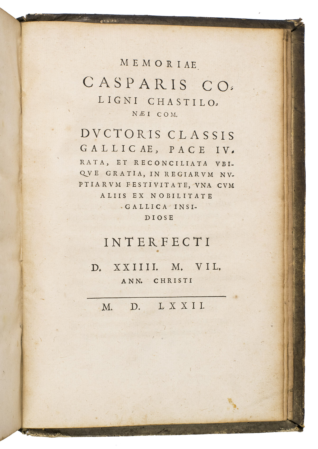 Ad 3: Apparently unrecorded pamphlet containing four Latin elegiac poems to the memory of Gaspard de Coligny, the admiral leader of the Huguenots under Charles IX, and a prominent victim of the St. Bartholomew's Day Massacre. The edition is without name of place or printer; at the end appear the initials A.Q.F. An impressive gathering of texts relating to the Calvinist movement.