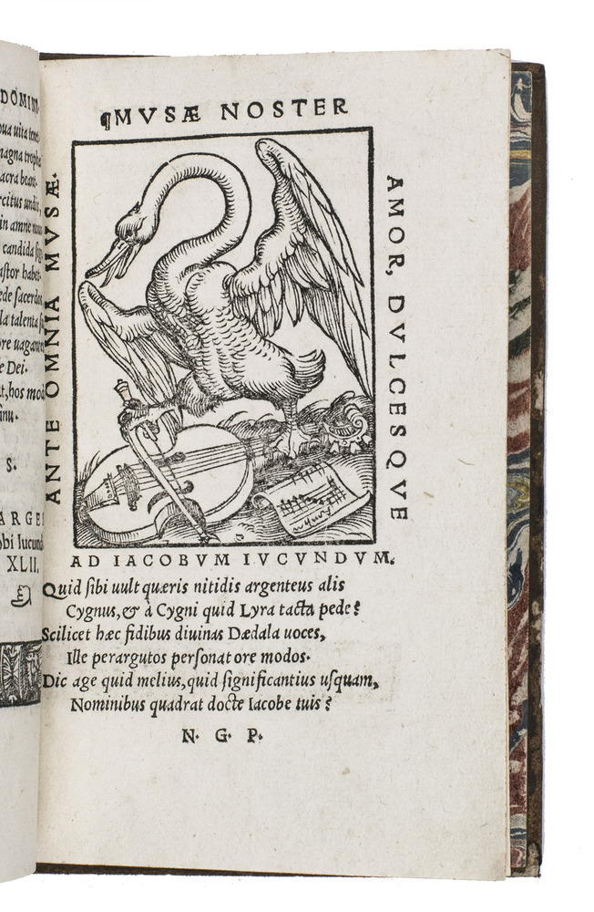 Strasbourg, Jacobi Jucundi [=Jakob Frölich], 1542. 8vo. With a printer's device on the title page and final page, two decorated woodcut initials, a woodcut headpiece, and three woodcut tailpieces. Early 18th-century gold tooled mottled brown calf. [40] ll.