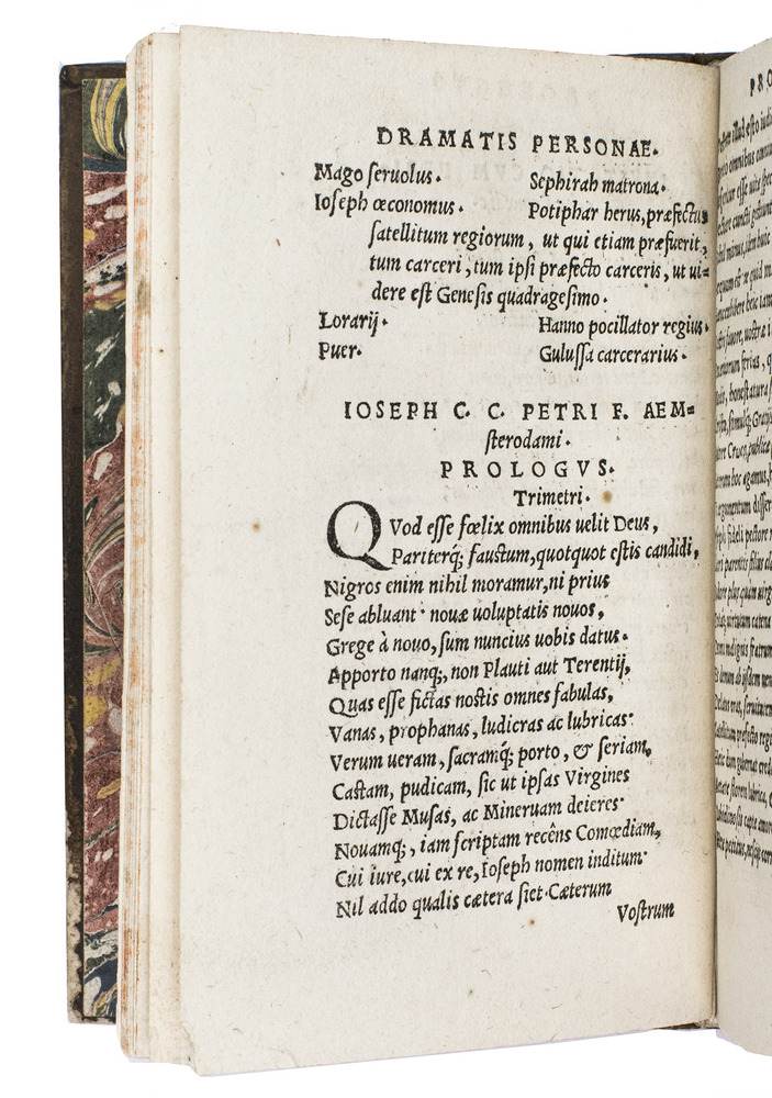 Second Strasburg edition of a popular "sacred comedy", or school play, written by one of the first and most important Neo-Latin poets and humanists of the Northern Netherlands. The work tells the story of Joseph in Egypt, and focuses in particular on Joseph's resistance to the advances of Potiphar's wife. The choice to dramatize this scene was seen as both innovative and controversial at the time. The play became incredibly popular, since 17 editions have been recorded. The present edition, however, is relatively scarce.