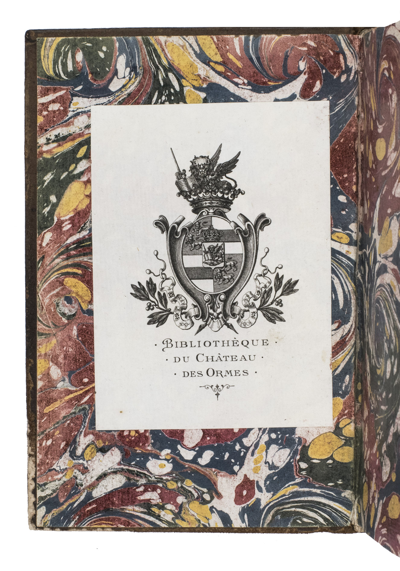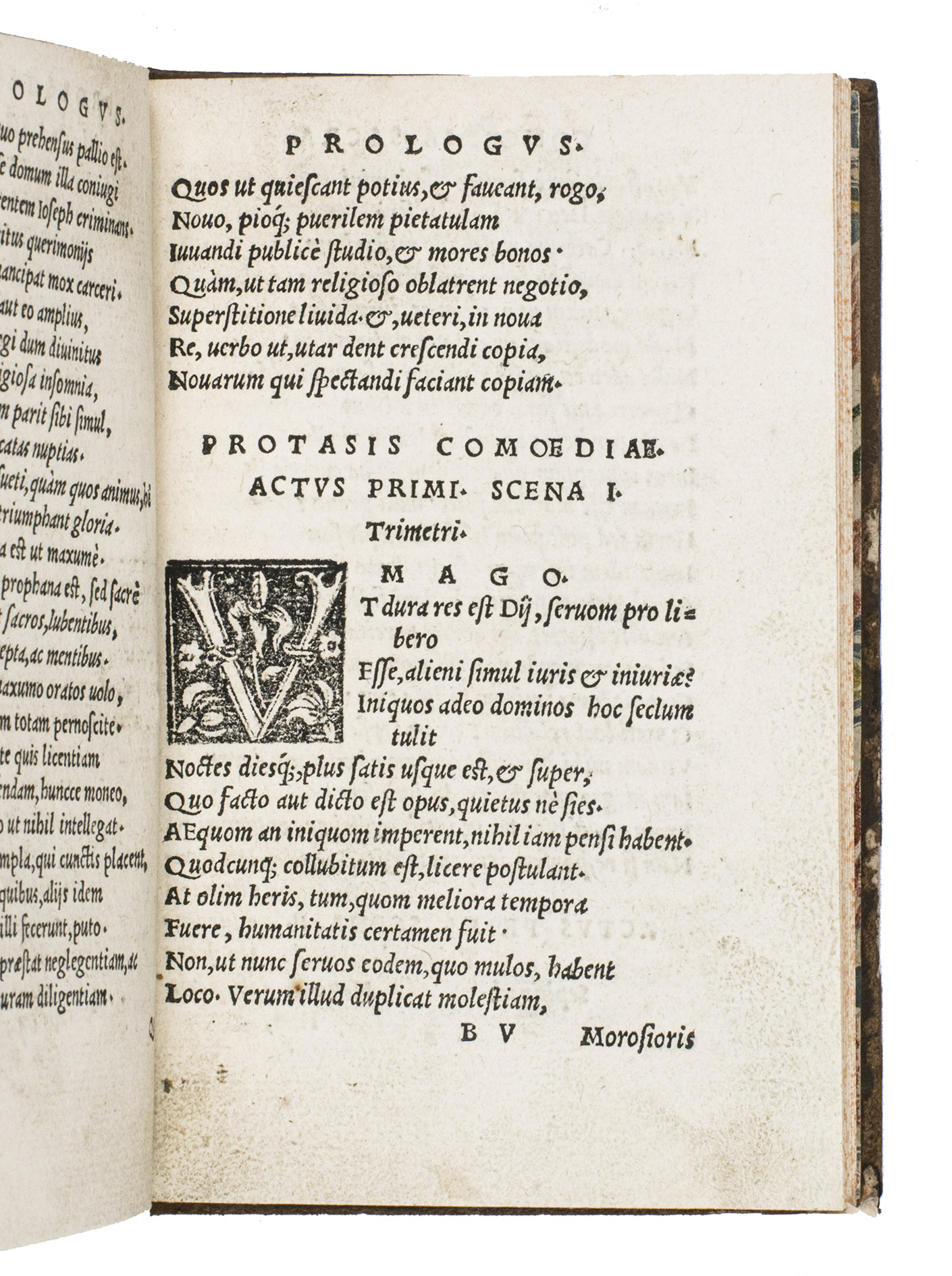 With the bookplate of the Bibliothèque du Château des Ormes mounted on the front pastedown. The edges and corners of the boards are somewhat scuffed, the boards are somewhat rubbed. The title page is slightly soiled, a small tear in the outer margin of leaf [33]. Otherwise in good condition. USTC 622917 (5 copies); VD16 C 6047; cf. Spies, M., 'A chaste Joseph for schoolboys.' In: Education and learning in the Netherlands 1400-1600 (2004), pp. 223-233; Wouters, D., Comoedia sacra and comedia nueva: defending innovation in comedy from the northern humanists to Lopez de Vega. In: Medievalia et Humanistica, 47 (2023), pp.19-39.