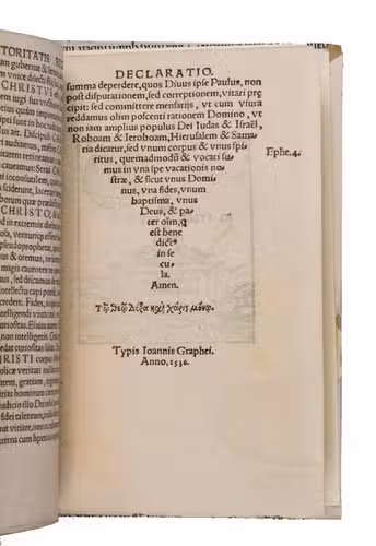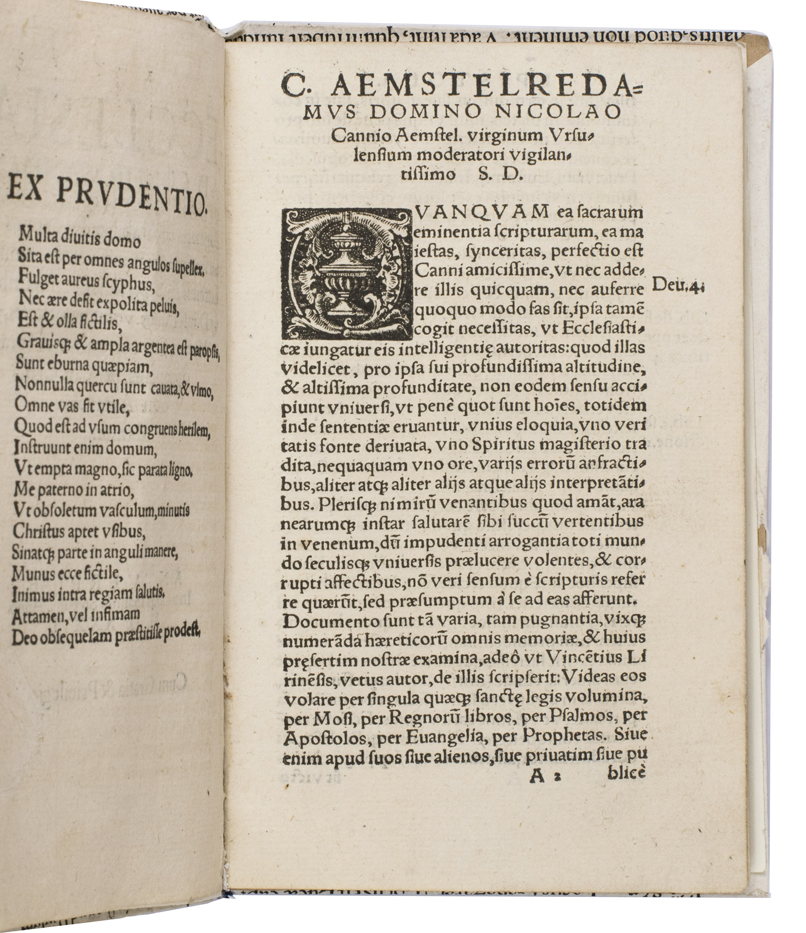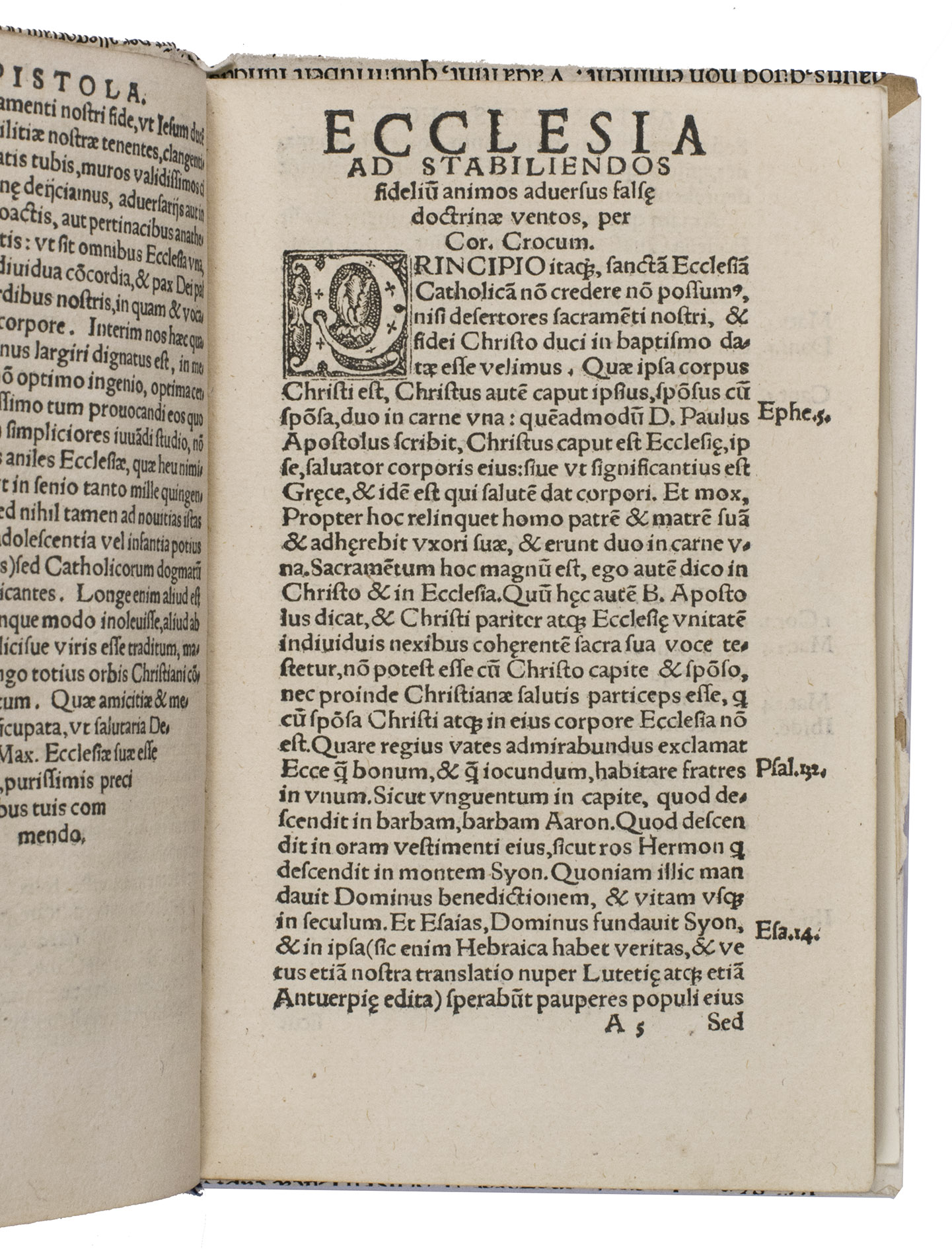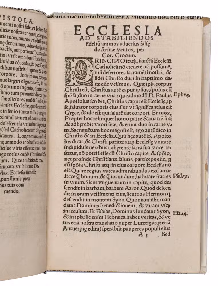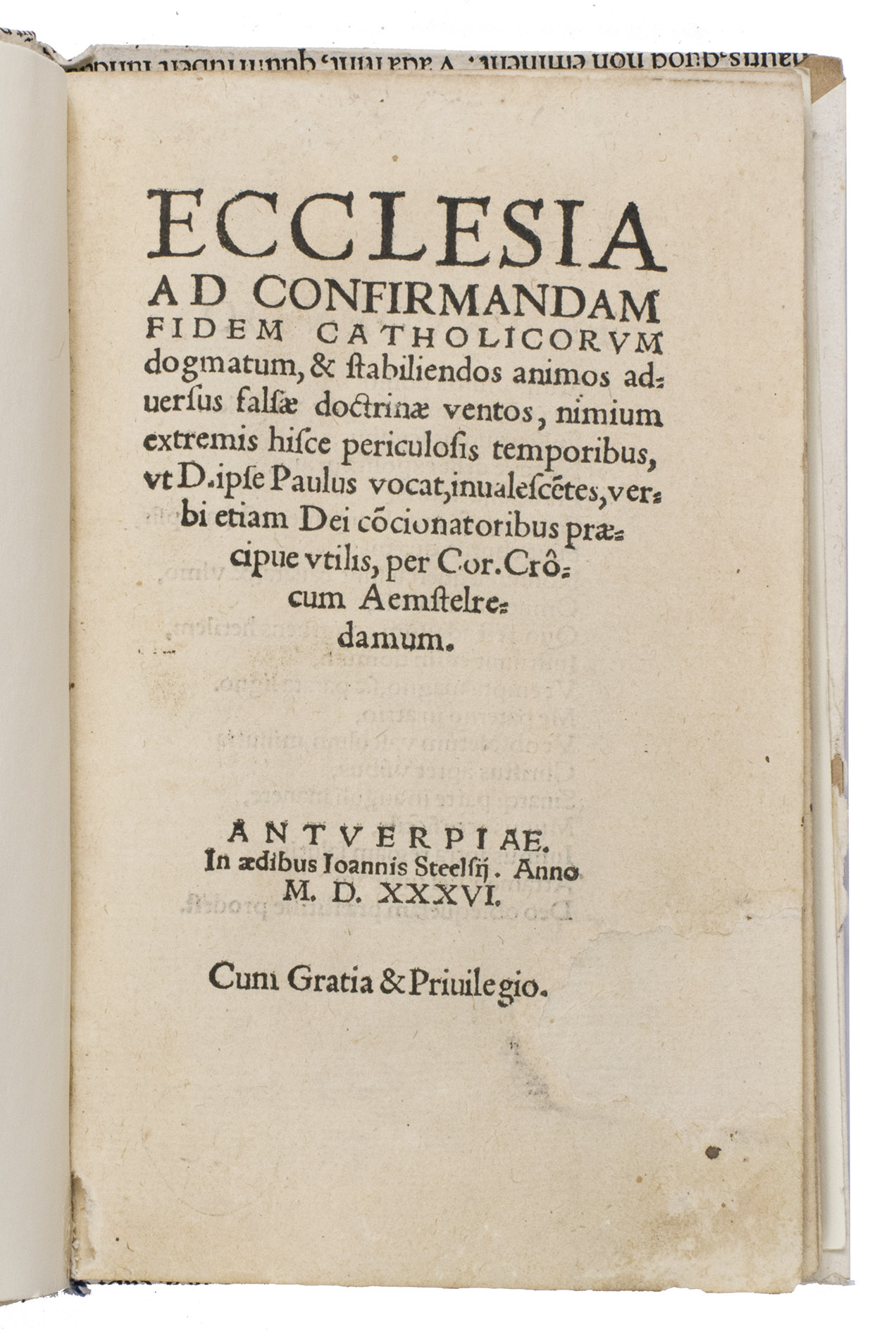 Rare first edition of Cornelius Crocus (ca. 1500-1550) major apologetic work Ecclesia, on the authority of the Catholic Church, an impassioned response to the winds of false doctrine that swept through the Low Countries in the turbulent 1530s. The book is prefaced by a six page dedicatory letter to his fellow citizen Nicolaus Cannius (1504-1555), rector of the Ursuline convent in Amsterdam. In this preface Crocus frames the central problem of his age: although Scripture is perfect and complete, its interpretation is endlessly contested. Only the Churchs divinely guided magisterium, he argues, can anchor the faithful amidst doctrinal turmoil.