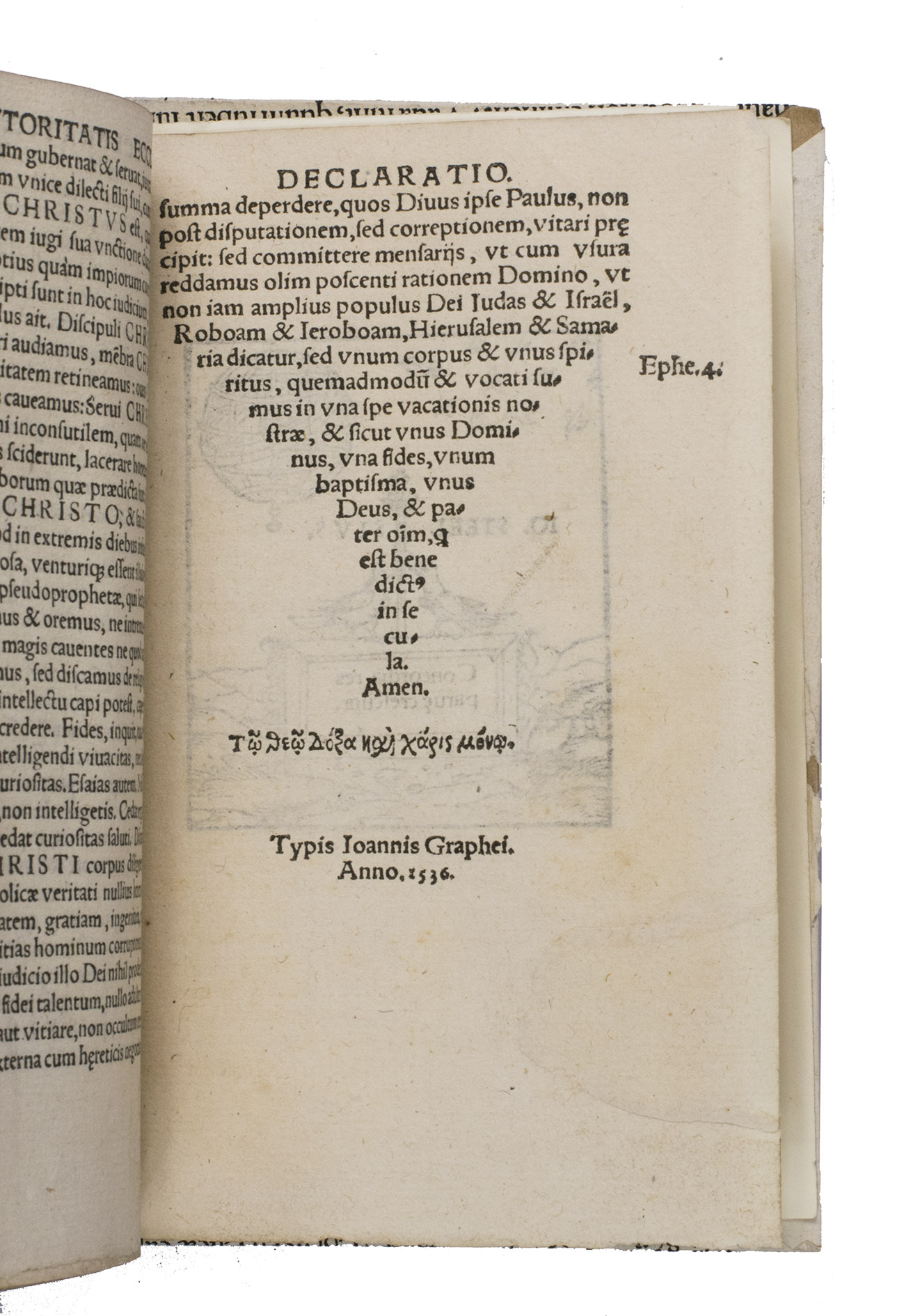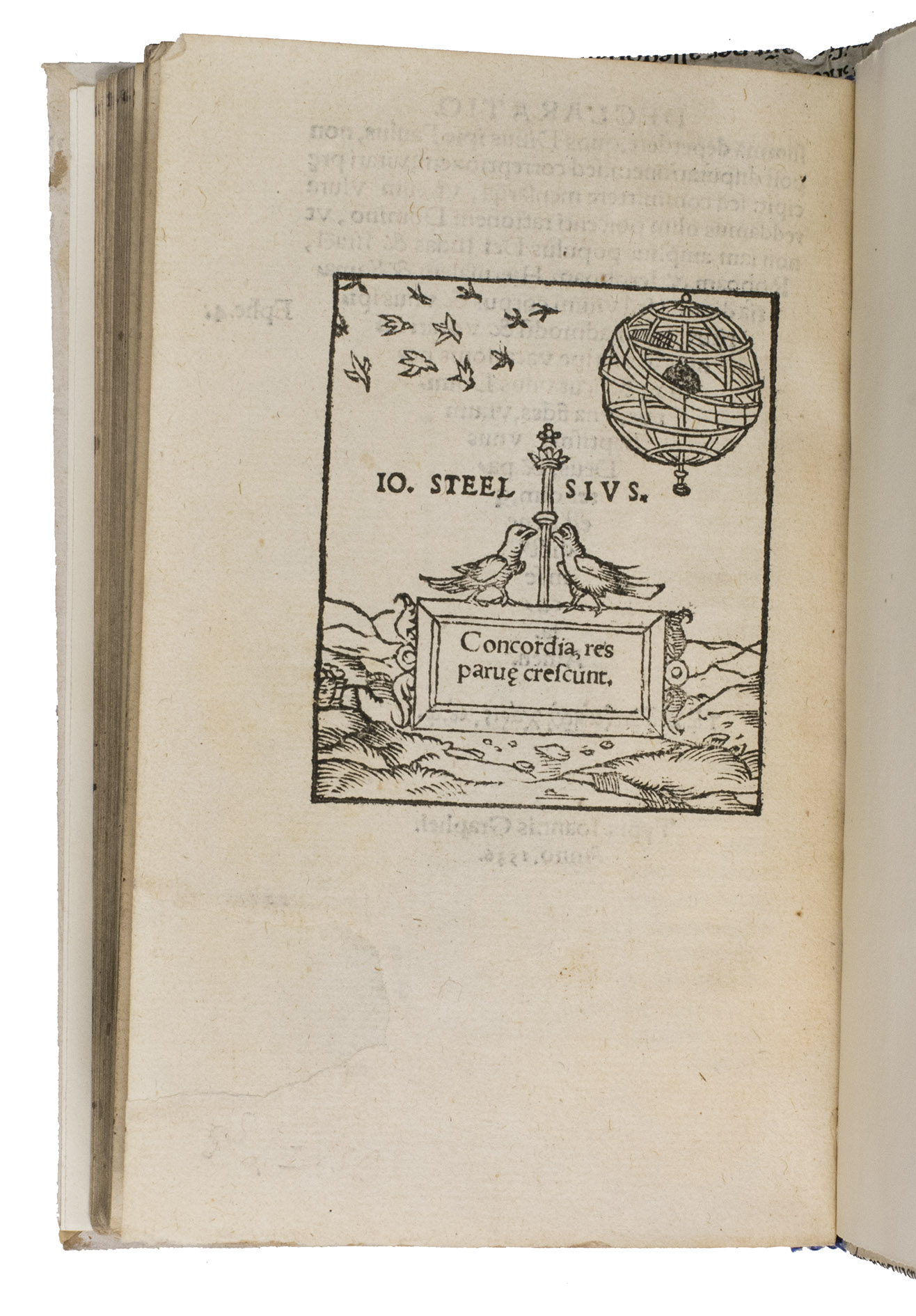 Antwerp, Joannes Grapheus (colophon:) for Joannes Steelsius, 1536. 8vo (15.3 x 8.5 cm). With a full page woodcut illustration incorporating Steelsius' device at the end, and with 1 woodcut decorated initial. Modern printer's waste paper binding. [55] ll.