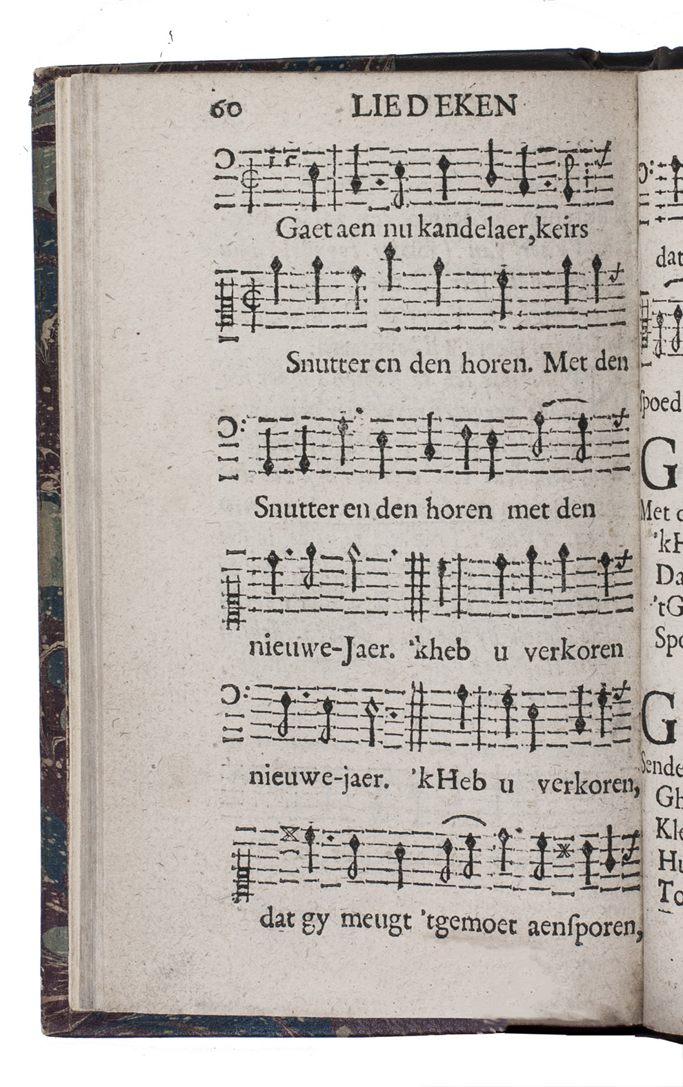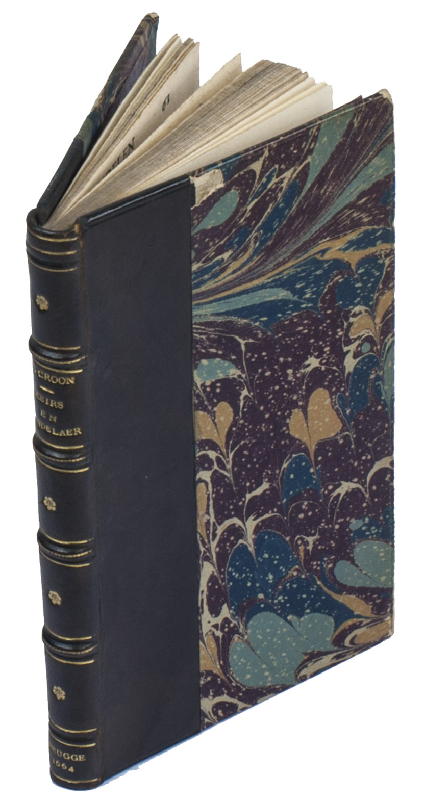 Bruges, widow of Joannes Clouwet, 1664. 12mo. With (letterpress?) diamond-head music notes. 19th-century gold-tooled half calf, marbled paper sides, with the title lettered in gold on the spine, marbled endpapers. "67" [= 77], [4], [3 blank] pp.