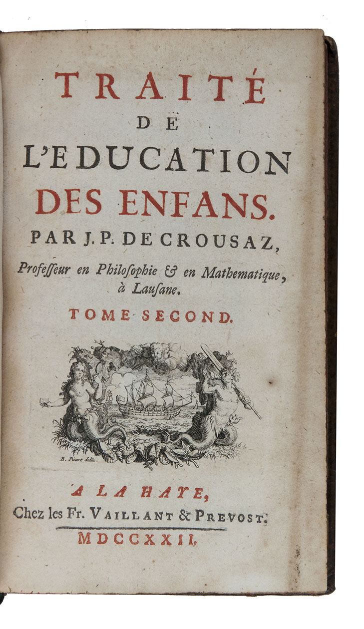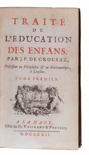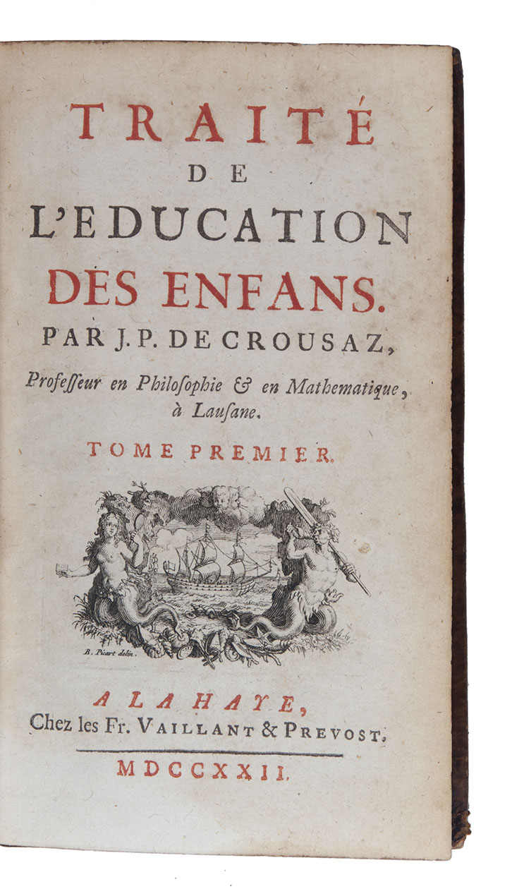 First edition of an influential, but now nearly forgotten, scientifically grounded monograph on the education of children by the Swiss philosopher and mathematician Jean-Pierre de Crousaz (1663-1750). This systematic work forms an important link between pedagogy in the 17th and in the 18th century.