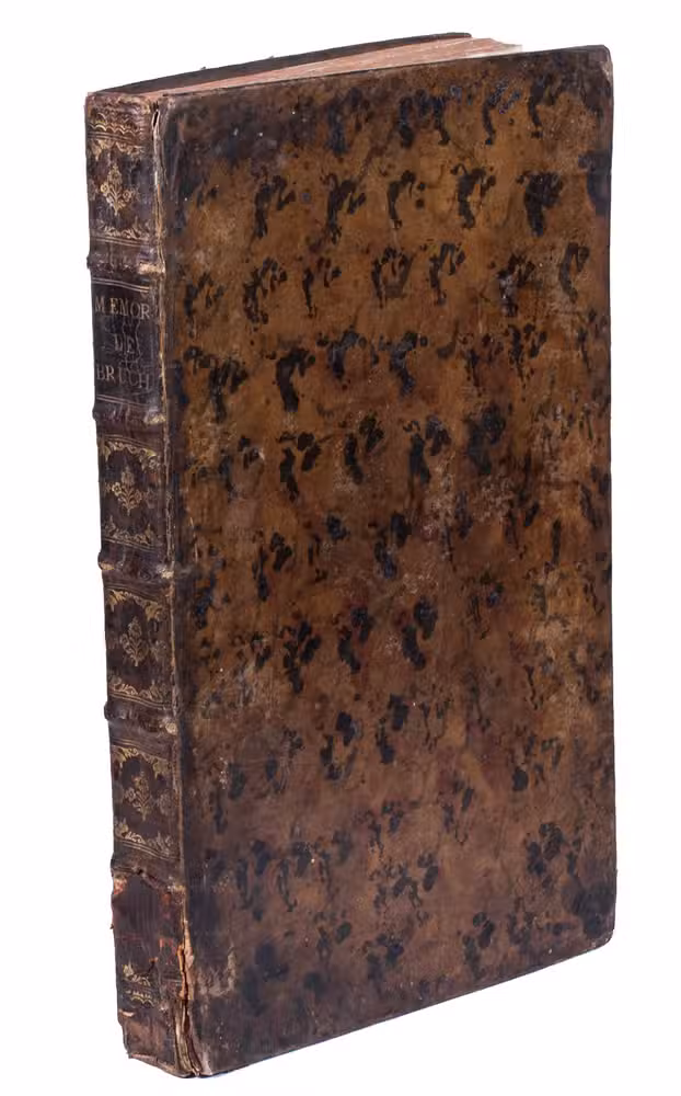 The edges and corners of the boards are scuffed, the front hinge has partially cracked at the head and foot of the spine, and the back hinge at the foot, resulting in some loss of material at the foot of the spine, the boack board has a few rubbed spots around the edges. The flyleaves have been replaced by a mid-19th century marbled paper, but the 18th-century marbled pastedowns have been kept. The title-page is slightly soiled. Otherwise in good condition. Cf. Castro Pereira Gomes, A. L. de, José da Cunha Brochado: de secrétario de embaixada a embaixador extraordinário. In: Tempo, vol. 22 (39), 2016, pp. 72-87.