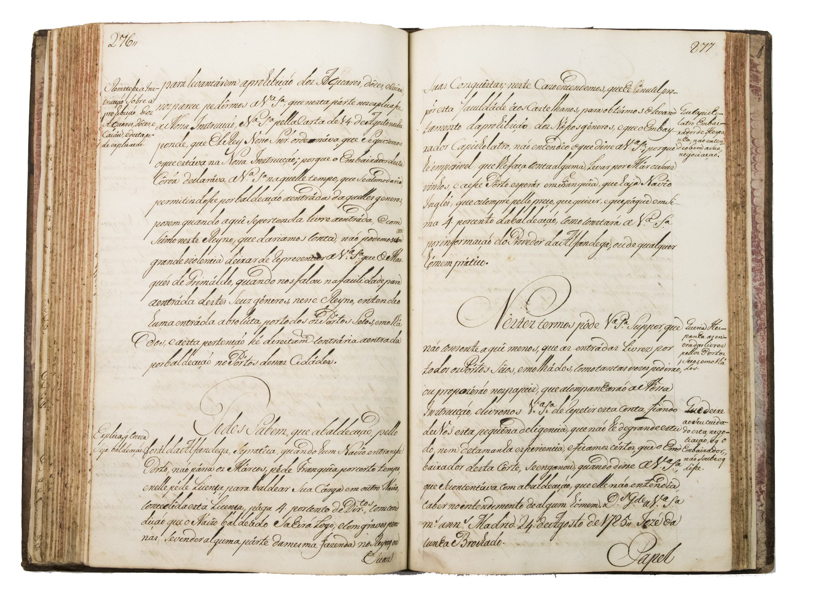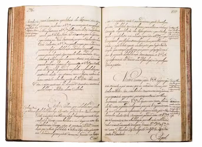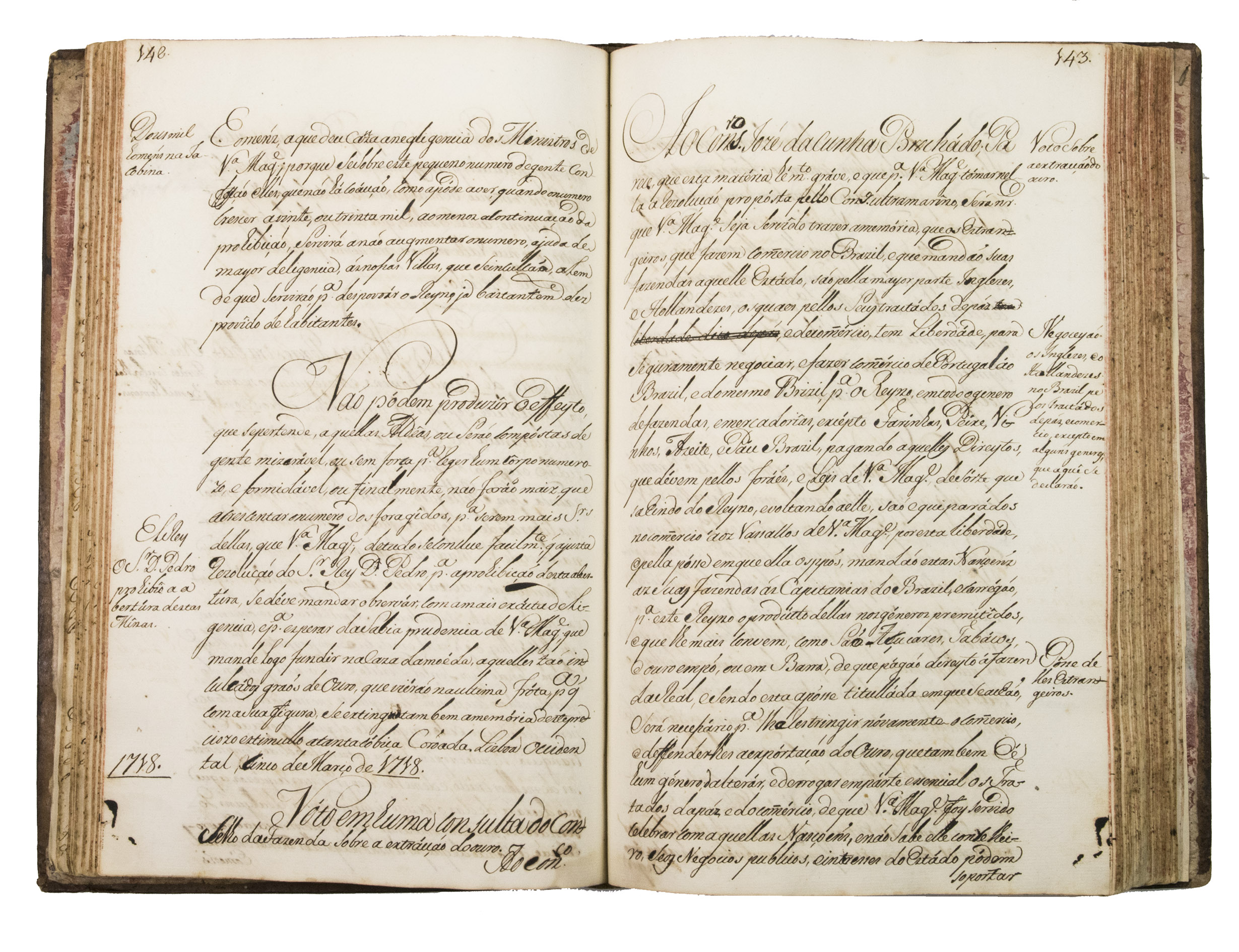 Cunha Brochado was sent to Versailles in 1695, as a secretary to the Portuguese ambassador. In 1699, he became the envoy extraordinary, the rank below the ambassador, until he left Versailles in 1704 to perform other diplomatic duties. In the present manuscript, he describes the events at the French court during this time, as well as his personal impression of the court, the audience and the other diplomats. He also provides a number of diplomatic letters and articles from other negotiations, including the Treaty of Utrecht (1713), which he personally participated in, and some treaties concerning Brazil.