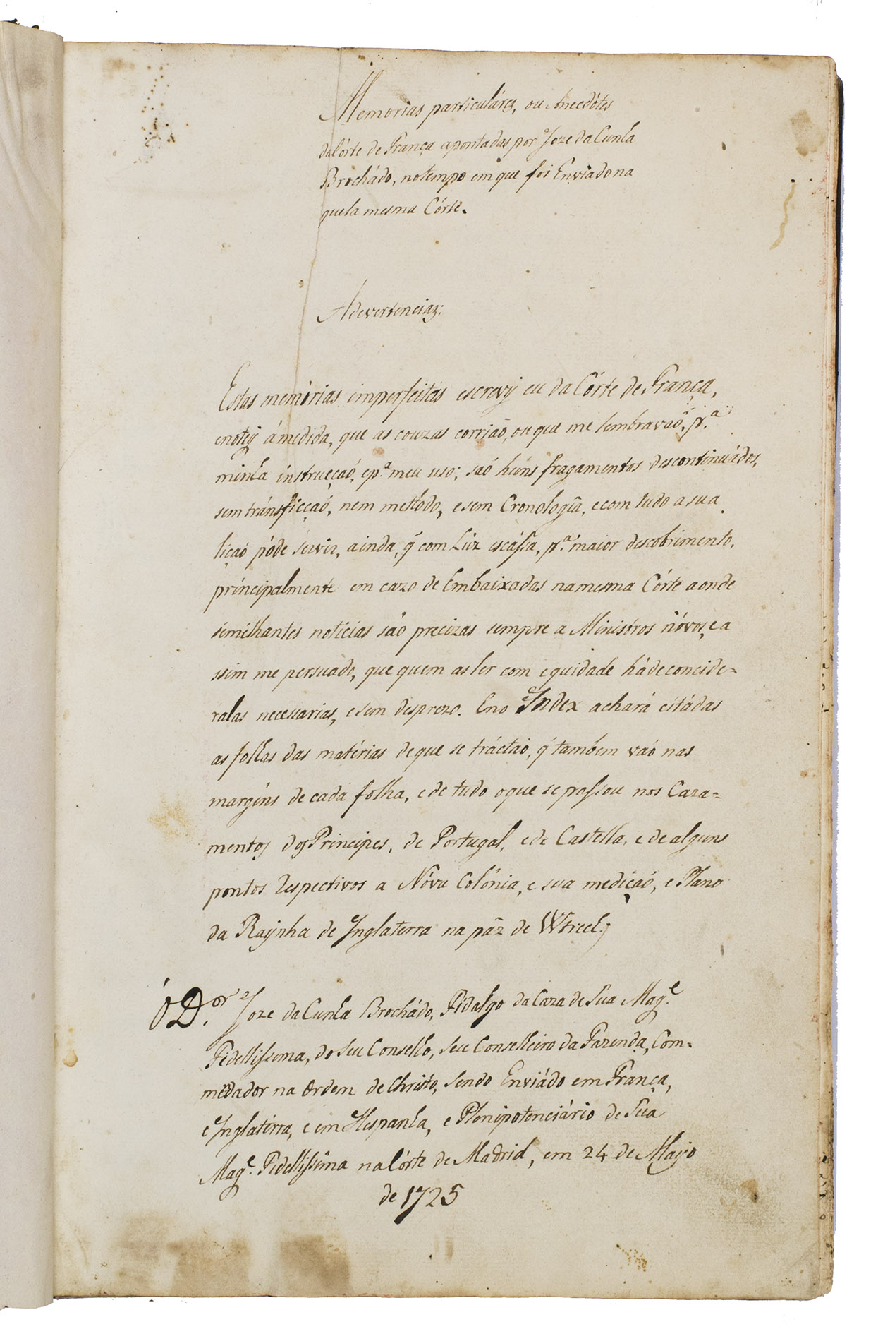Historically important contemporary manuscript with the recollections of a Portuguese diplomat during his stay at the court of king Louis XIV (r. 1643-1715). The manuscript contains the memoirs of José da Cunha Brochado (1651-1733) between 1696-1725. The present manuscript is written in two different hands. The writing on the title-page is likely by Cunha Brochado himself. Cunha Brochado was one of the most prominent figures in 18th-century Portuguese politics. He is relatively well-known, because multiple letters and manuscripts with his memoirs have survived. However, most of those documents can only be found in libraries and archives, specifically in the Bibliotheca Nacional de Portugal and the Arquivo Nacional Torre do Tombo. The present manuscript is the only document by Cunha Brochado that has been on the market in the past 100 years.
