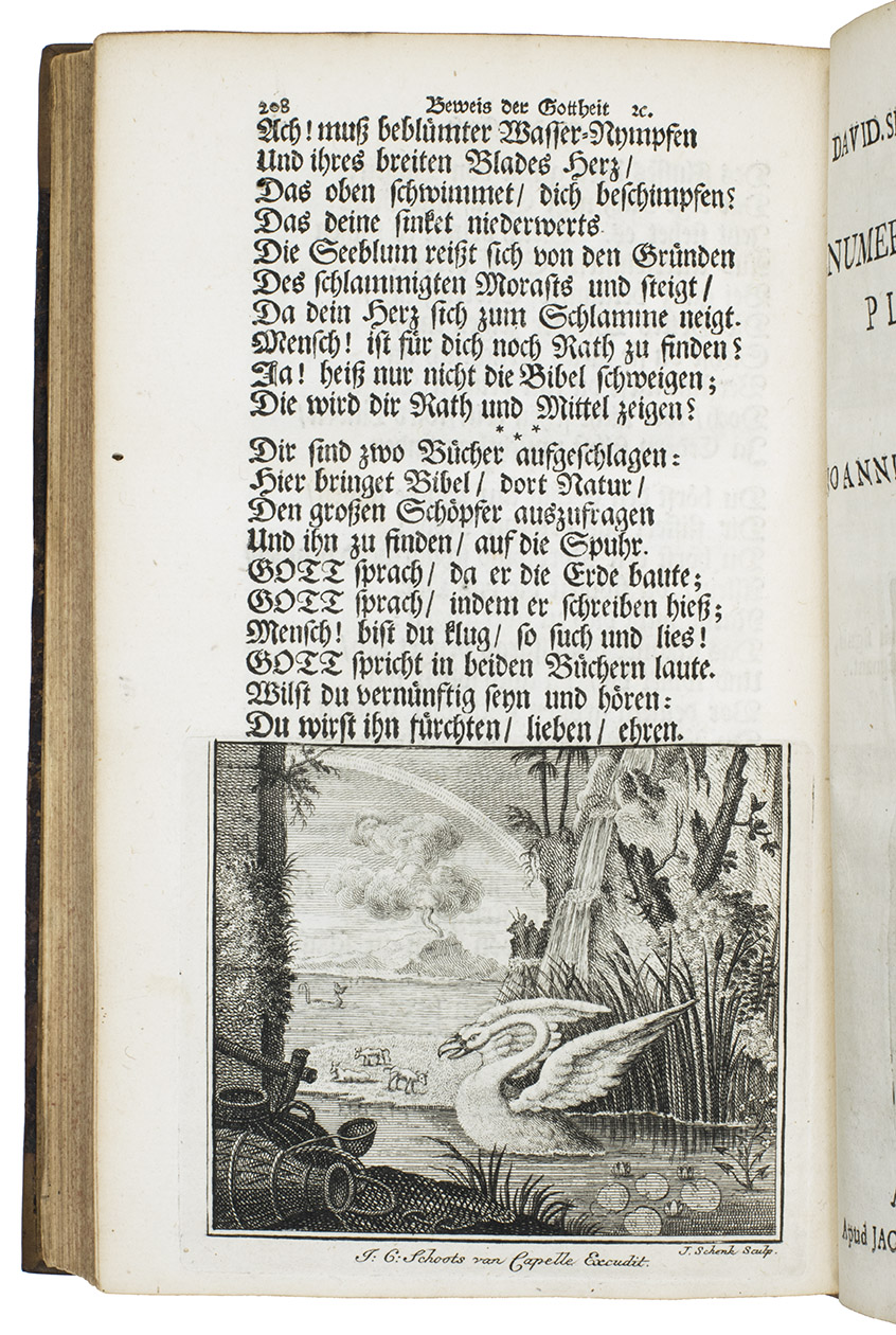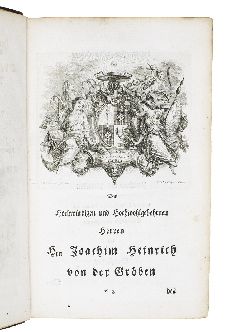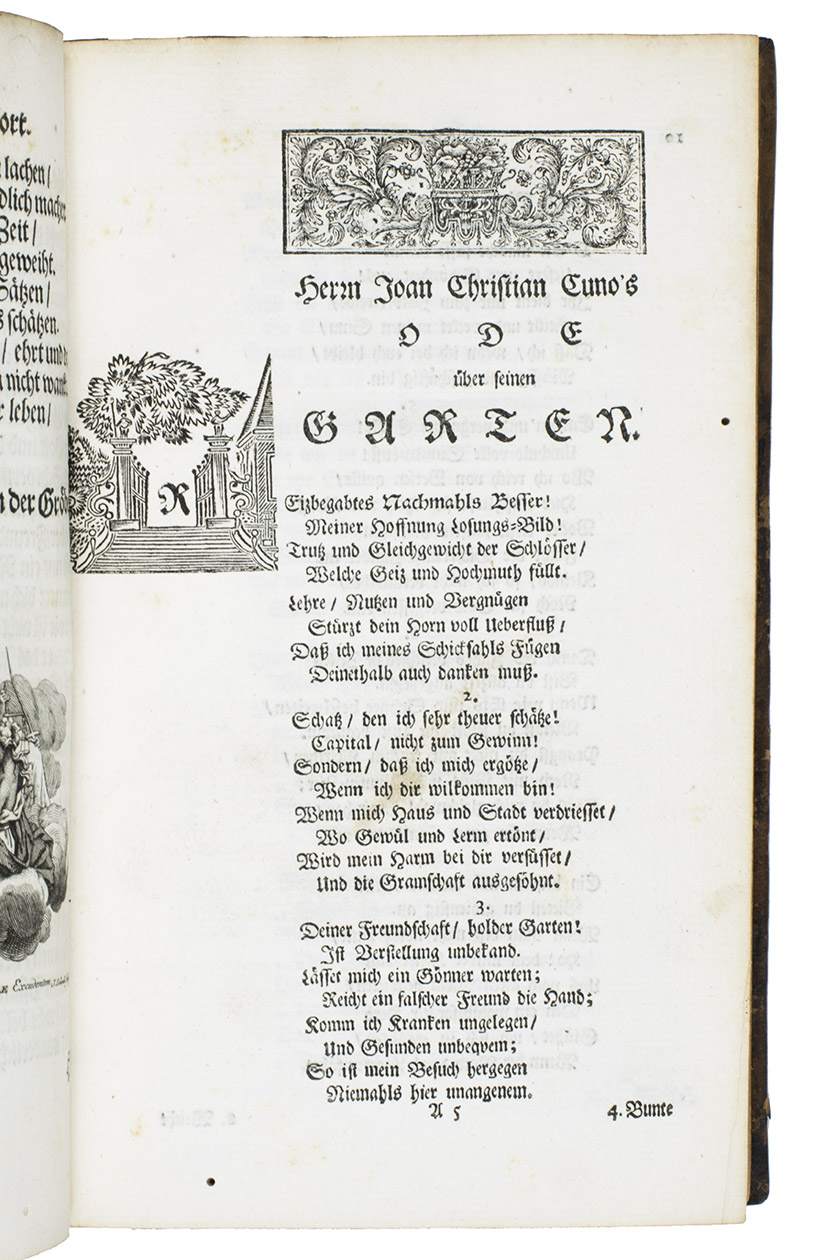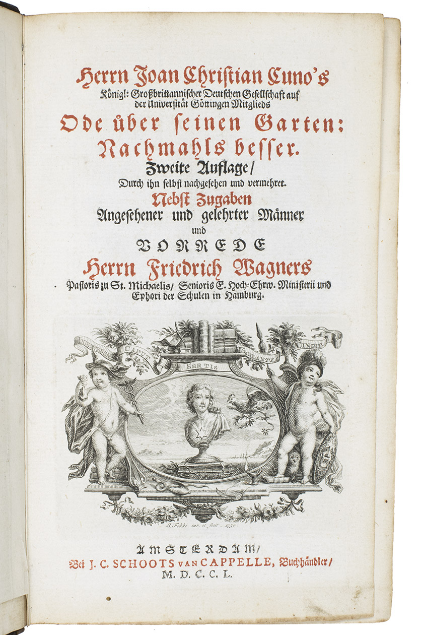 Ode über seinen Garten: Nachmahls Besser. Amsterdam, Jacob Cornelis Schoots van Cappelle, 1750. 8vo. With a folding engraved allegorical title-plate, an engraved printers device on the title-page, an elaborate engraved coat-of-arms on the dedication page and 11 engraved plates (1 folding). Further numerous woodcut allegorical capitals. Contemporary calf. [34], 260 pp.