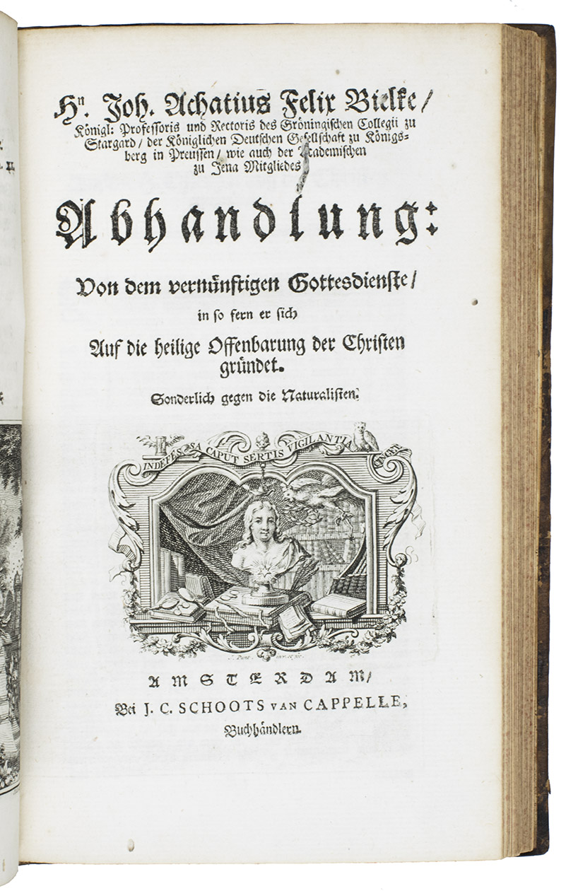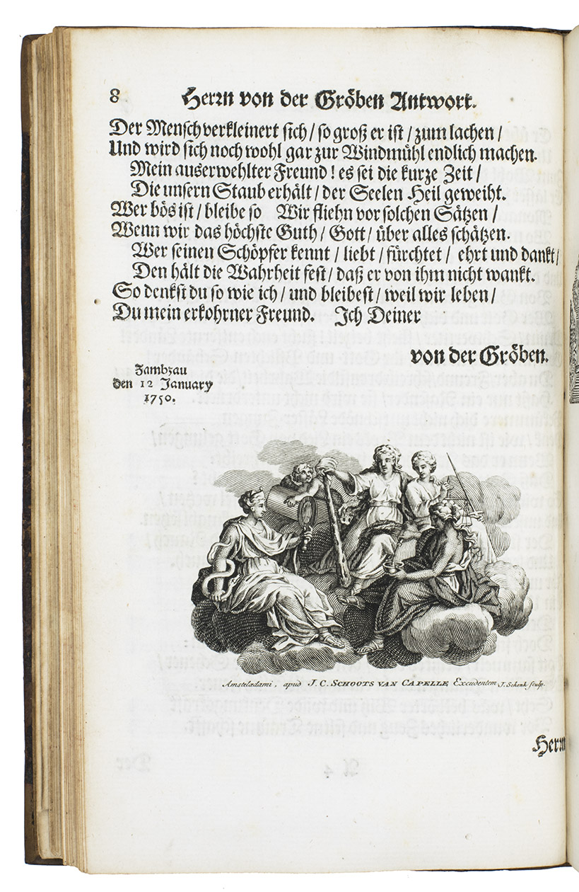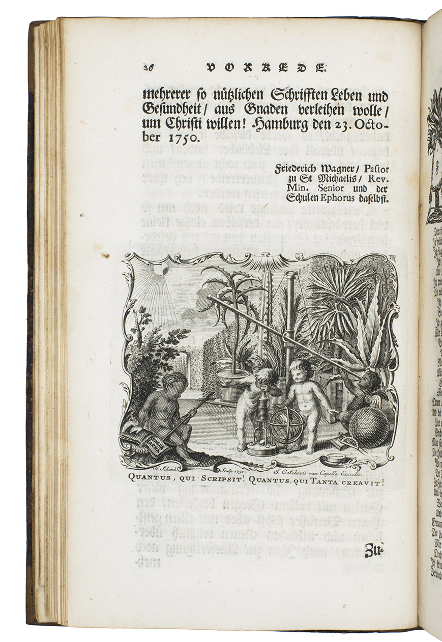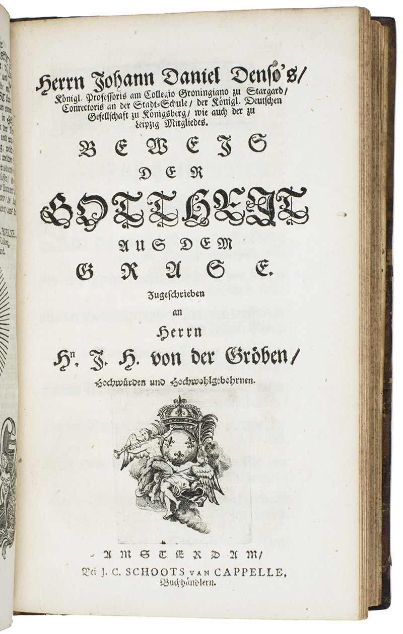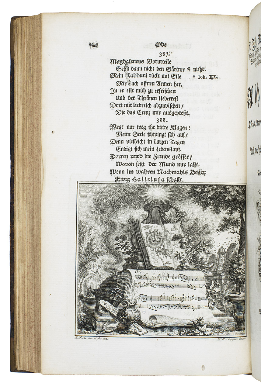Ode über seinen Garten: Nachmahls Besser. Amsterdam, Jacob Cornelis Schoots van Cappelle, 1750. 8vo. With a folding engraved allegorical title-plate, an engraved printers device on the title-page, an elaborate engraved coat-of-arms on the dedication page and 11 engraved plates (1 folding). Further numerous woodcut allegorical capitals. Contemporary calf. [34], 260 pp.