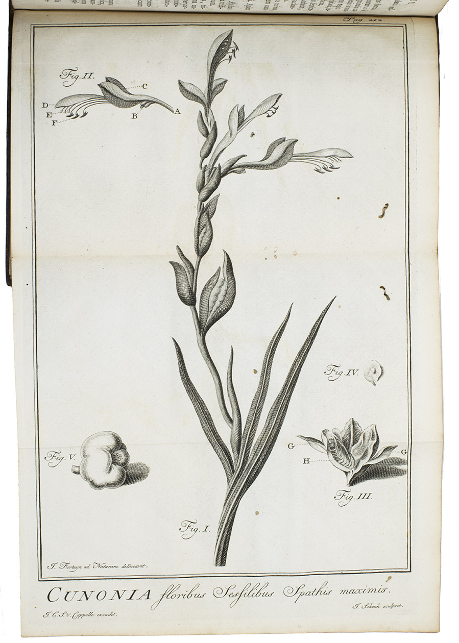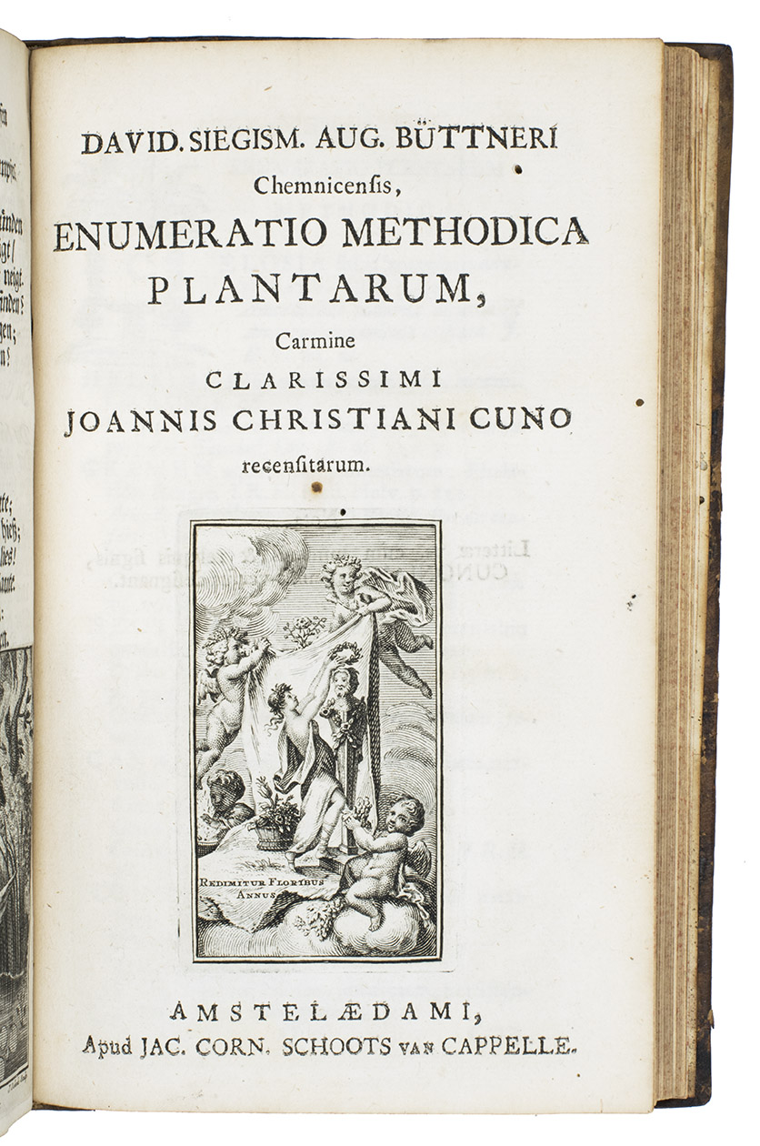 Rare second, enlarged edition of a description of the botanical garden of the author, Johann Christian Cuno (1708-1783). The first edition (1749), also in German, does not include Büttner's botanical commentary. Cuno, born in Berlin, migrated to Amsterdam and made a fortune as a merchant. He spent his spare time in his garden estate near Haarlem and wrote the present work about it. Cuno became an important figure in Amsterdam society, befriending many authors, including Linnaeus, who named a plant family after him: Cunonia. The first edition is extremely rare (not in WorldCat, but the SB Berlin has a copy).