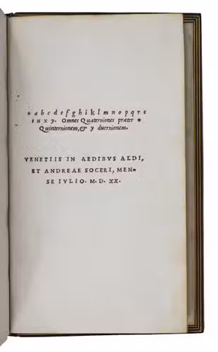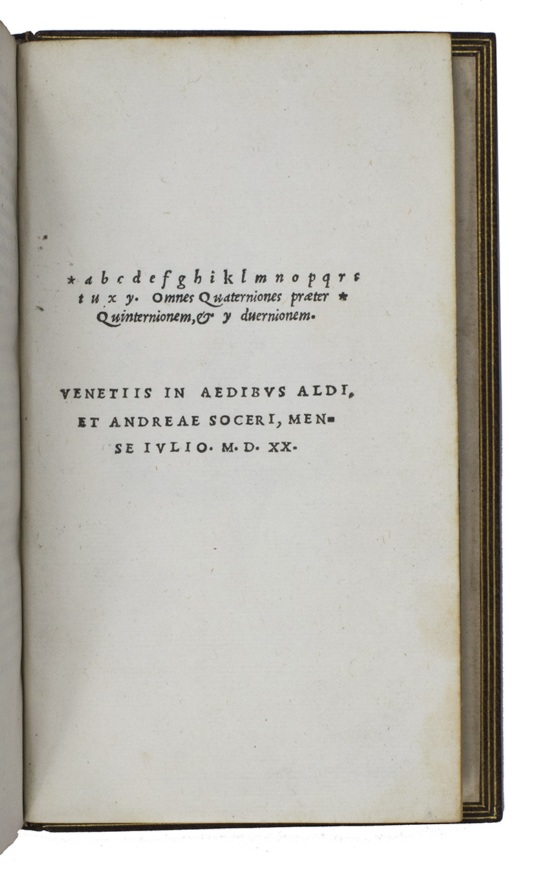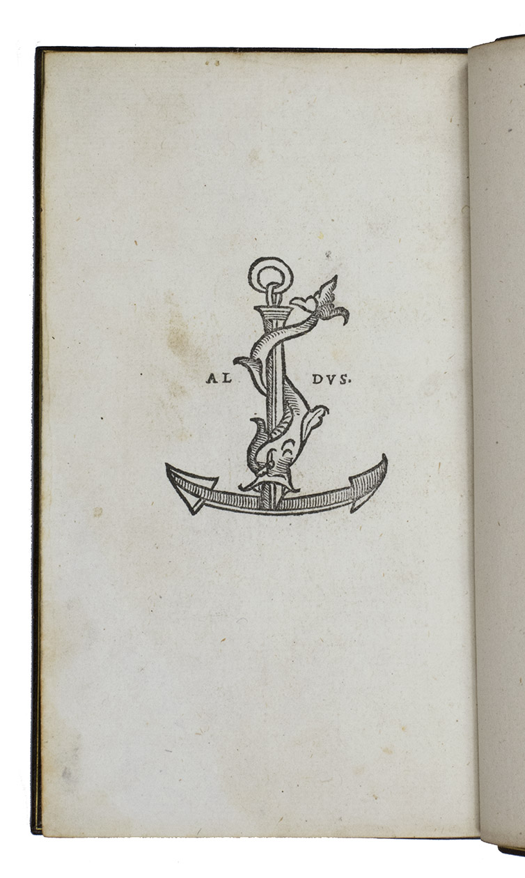 Venice, heirs of Aldo I Manuzio & Andrea I Torresano, July 1520. 8vo. With Aldos woodcut anchor and dolphin device on the title-page, repeated on the verso of the otherwise blank last leaf (each with letterpress "AL ... DUS" flanking the device). Set in Aldos famous italic (with upright capitals), the worlds first italic printing type, first used in 1501. Richly blind-tooled brown goatskin morocco (early 20th-century with the older bookplate moved to the new paste-down?). [8], 170, [2] ll.