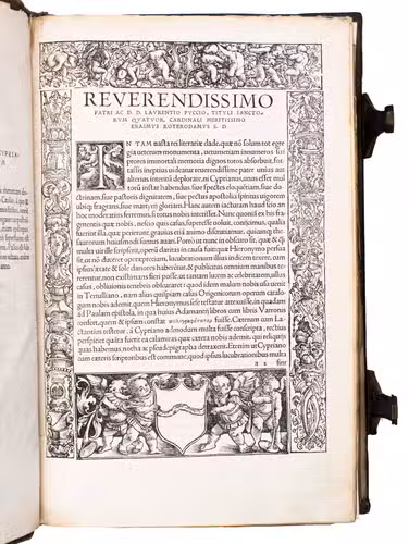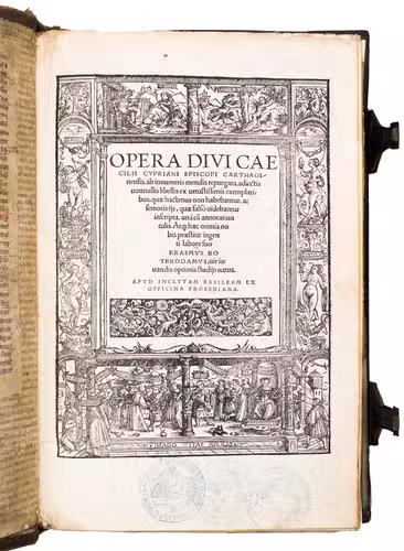 First edition of the works of Thascius Caecilius Cyprianus (Saint Cyprian, ca. 210-258 CE), edited by Erasmus. The present work is a landmark in the history of humanist scholarship and a cornerstone of Erasmuss lifelong effort to restore the authentic voice of the Early Church Fathers. Working in Basel, Erasmus devoted himself to what he regarded as his highest calling: presenting these foundational Christian sources to a wider audience and revealing the truth of the Gospel in its original simplicity.