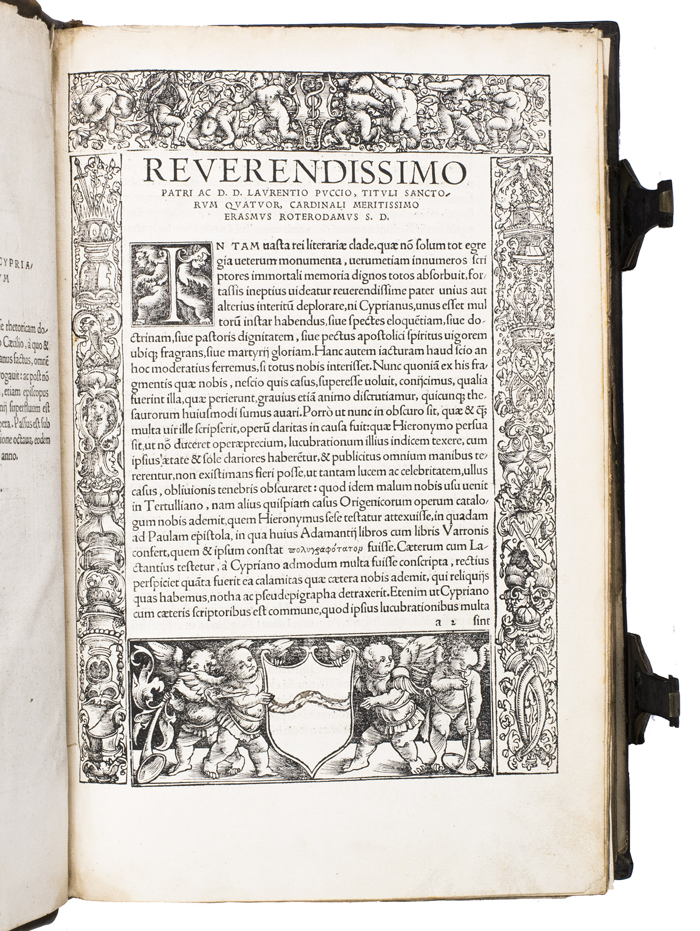 Basel, Johann Froben, 1520. Folio. With an elaborate woodcut border on the title page and on the first page of the dedication. Further with a small woodcut illustration incorporating Frobens device on the verso of the last leaf, numerous woodcut decorated initials by Ambrosius Holbein throughout, and some ornamental woodcut headpieces. Contemporary richly blind-tooled calf over wooden boards, with brass clasps, catch- and anchor plates along the fore-edge and brass edge guards around the corners and on the bottom board edge near the spine, manuscript waste pastedowns, re-backed. [24], 515, [1 blank], [32] pp.