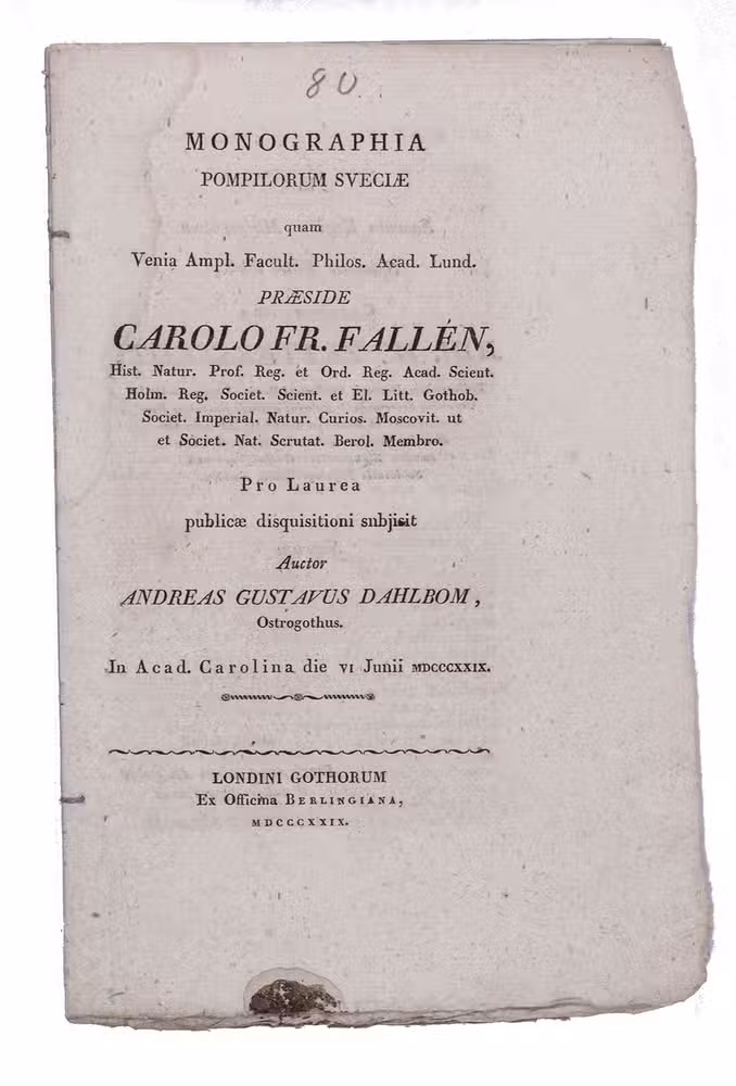 Dissertation by the Swedish entomologist Anders Gustav Dahlbom (1806-1859) on the classification of wasps in Sweden. With Carl Fredrik Fallén (1764-1830) as praeses.