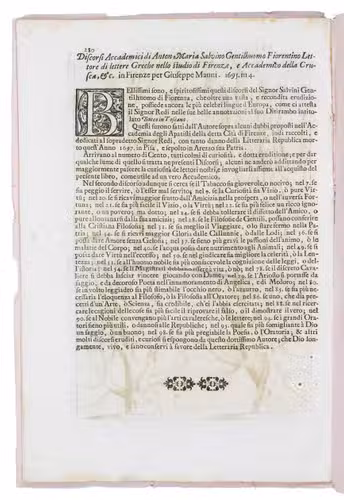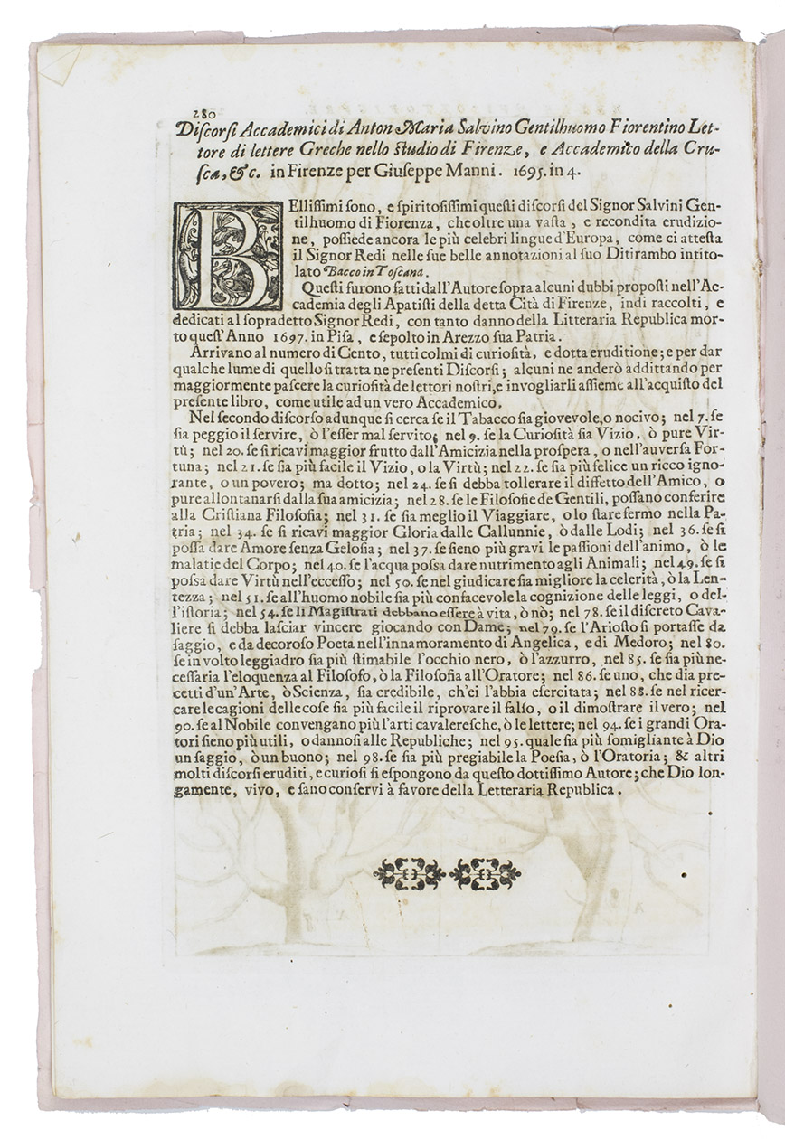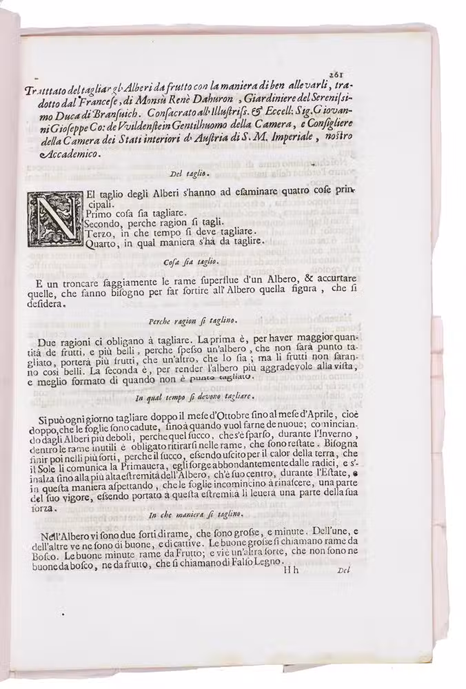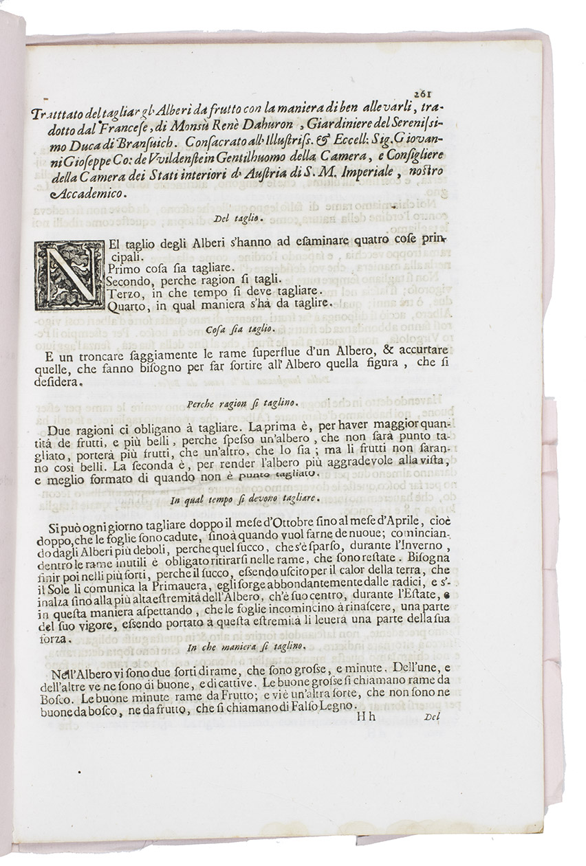 Dahuron was gardener to Georg Wilhelm, Duke of Braunschweig-Lüneburg at Celle from 1690 to 1701 and then to Wilhelm I, King of Prussia at Potsdam. The present Italian translation appeared in 1698 together with an Italian Compendio of Jean de la Quintinye, Instruction pour les Jardins (Paris 1690) as Il Giardiniero Francese, overo Trattato del Tagliare gl'Alberi da Frutto con la Maniera di ben Allevarli (Venice, Girolamo Albrizzi, 1698). The present edition seems to have been published at about the same time, but as the last(?) treatise in a 280-page folio. The treatise collates 2mo: 2H4 2I6 = 10 ll., with a notice on fol. 2I6v of Antonio Maria Salvini, Discorsi Accademici ... (Florence, Giuseppe Manni, 1695): the notice mentions the death of Francesco Redi (1626-1697). The present edition of the treatise therefore seems likely to have been published in 1698, perhaps in the proceedings of one of the Florentine scholarly societies, but we have found no publication in which it seems to fit. The paper bears no discernible watermark.
