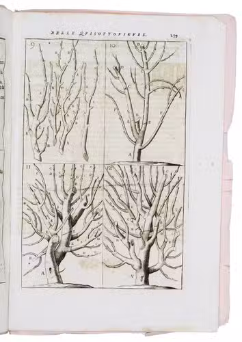 An unrecorded Italian translation of a French treatise on the pruning and grafting of the limbs of fruit trees, first published as Traité de la taille des arbres, & de la maniere de les bien elever (Celle, André Holwein, 1692), with 12 engraved illustrations from 3 copperplates that depict trees and methods how to graft them. The Hunt Library catalogue mistakenly describes the second French edition (Nouveau traité, Paris 1696, illustrated with woodcuts) as the first edition and notes that this is "a rare little work, not listed in any of the larger botanical collections so far as we can find." The present Italian translation after the first edition appears to be even rarer.