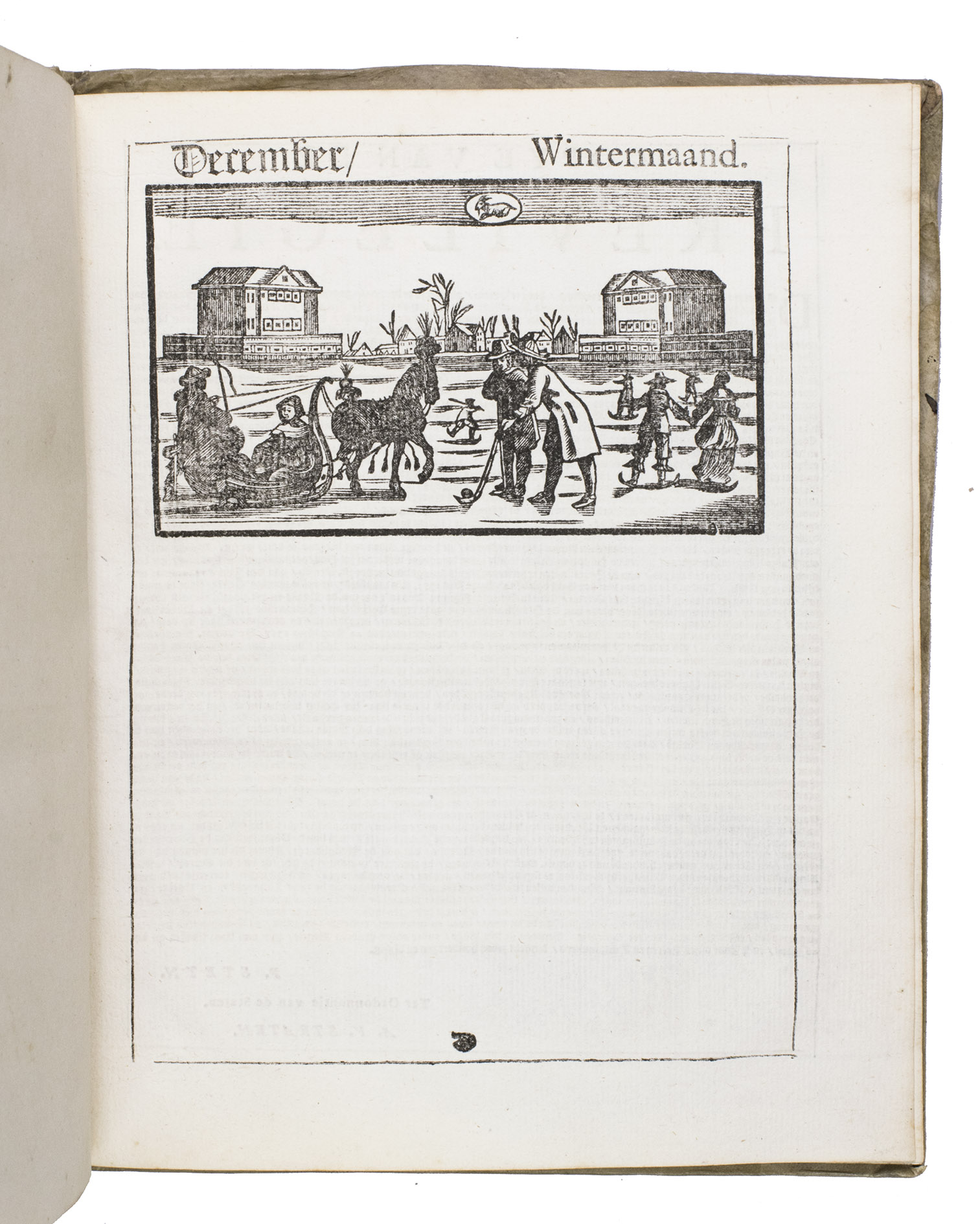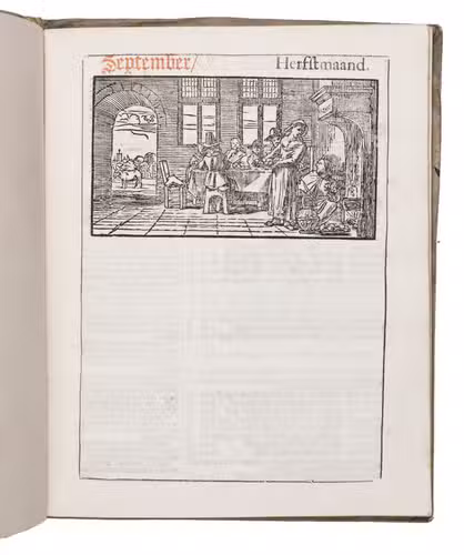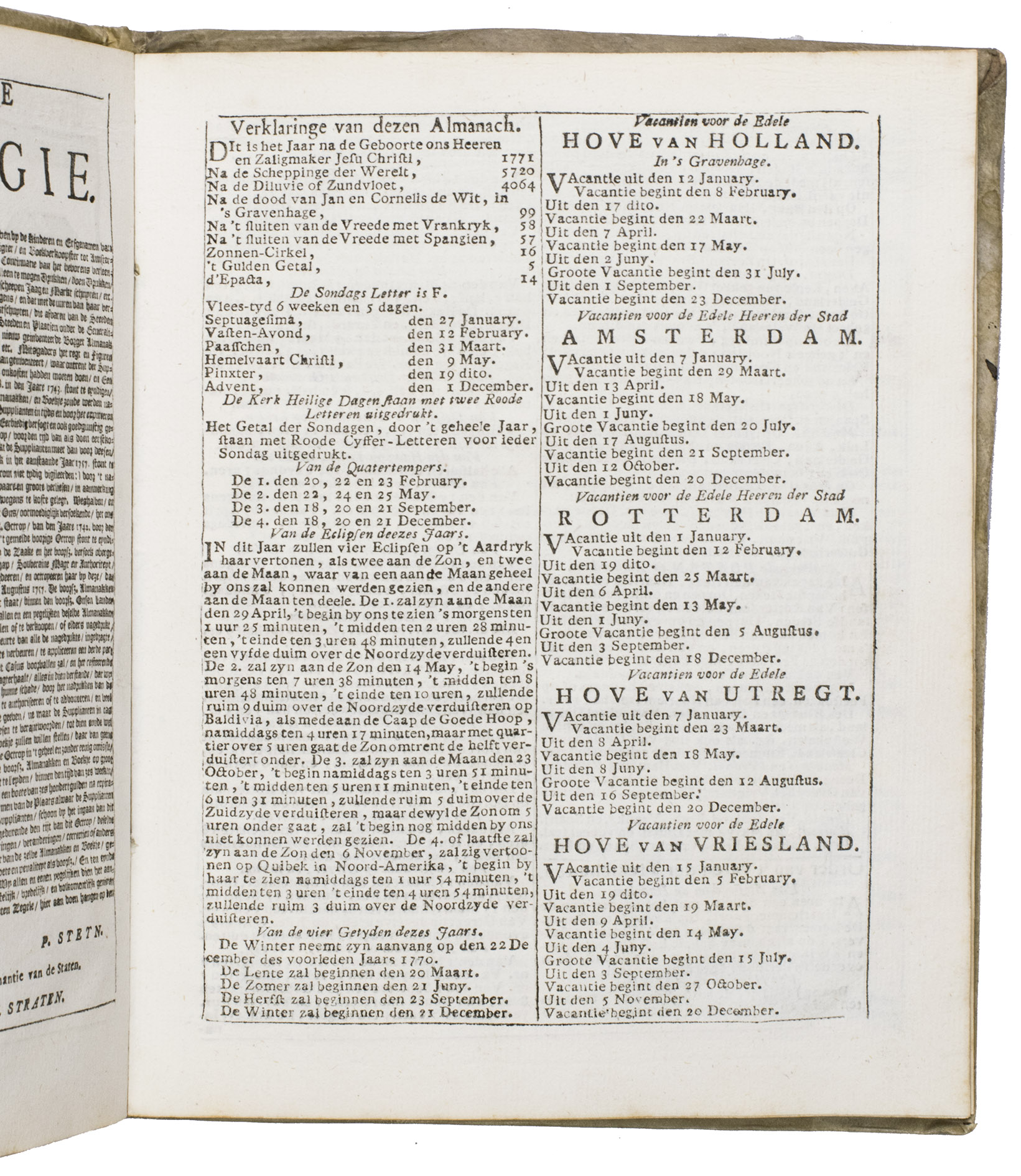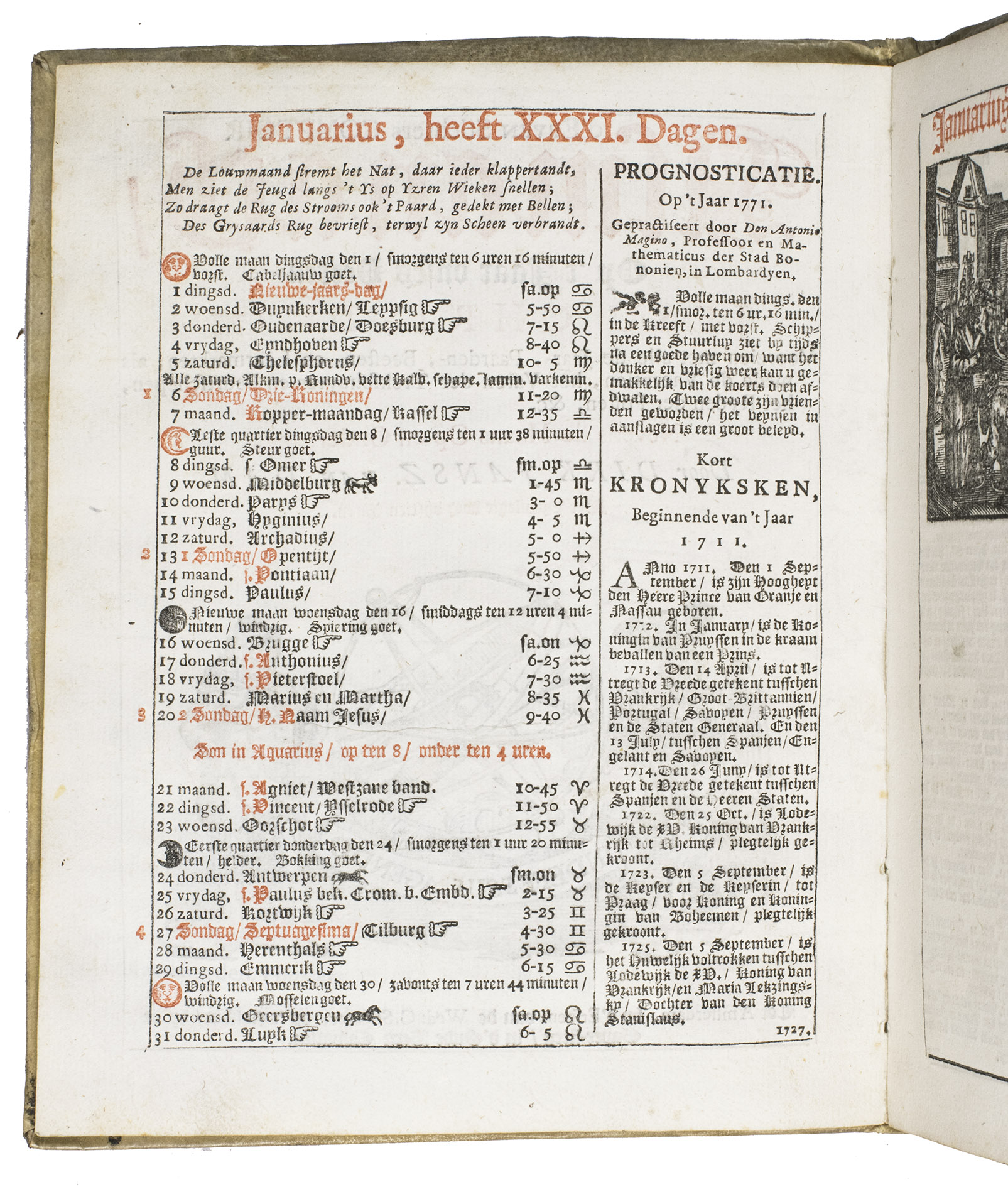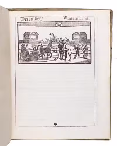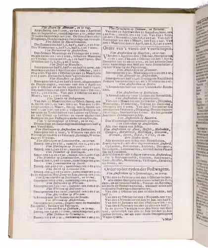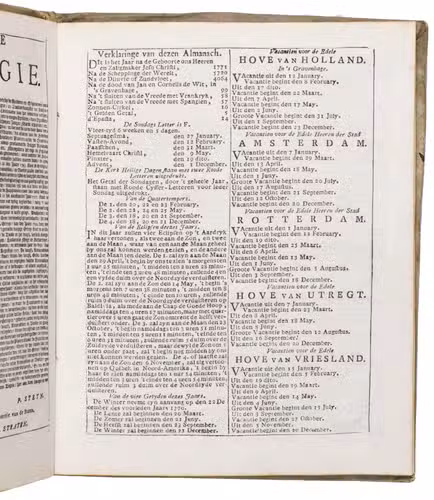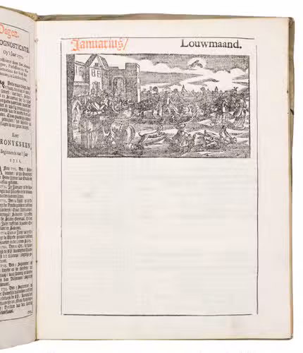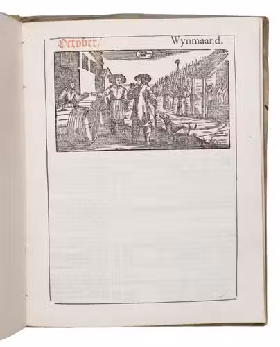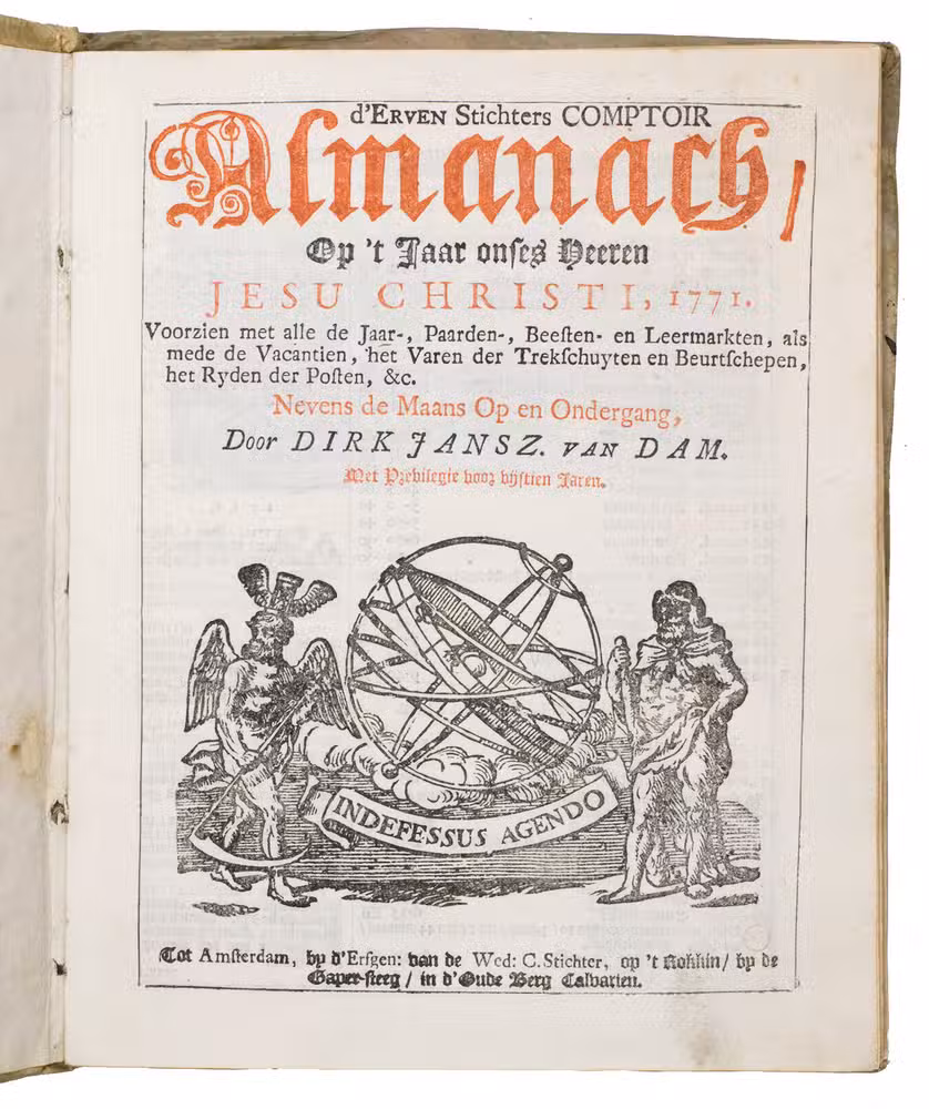 Ad 1: The very popular almanac for the year 1771 published by the heirs of Cornelis Stichter at Amsterdam, in a richly silver-tooled vellum binding, depicting the themes of the work itself with lively baroque ornaments. The "comptoir" or "office" almanac, intended for merchants, business men and office personnel, belonged to the oldest Dutch almanacs. Originally published yearly in various sizes, the present almanac is printed in 4to. The work was composed by Dirk Jansz. van Dam, and consists of an extensive interleaved calendar on 12 leaves containing the days of the month, indicating the phases of the moon, and the dates of the cattle, horse, and leather markets in several places in the country. Each month is illustrated with a half-page woodcut, starts with a poem of four lines, and includes a prognostication and some historical facts which have taken place in that month in previous decades. After the calendar follow the privilege and annual information, including the dates of the official holidays, time-tables for the closing of the city gates, the departure of postal services and passenger coaches and barges, tariff-lists of seals, etc.