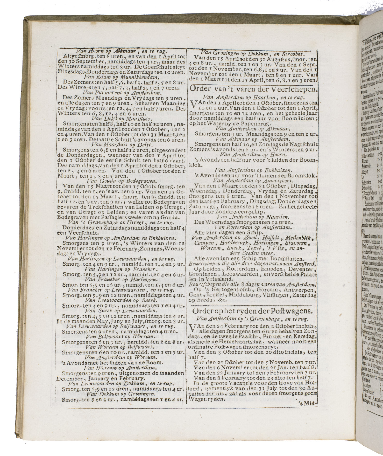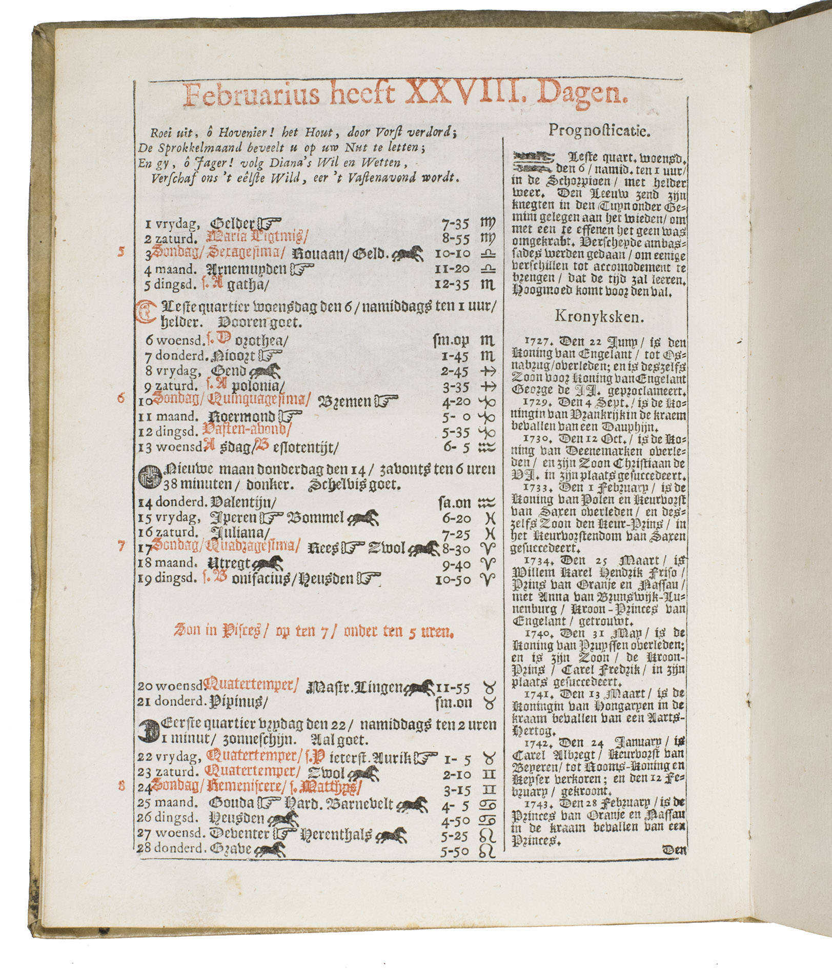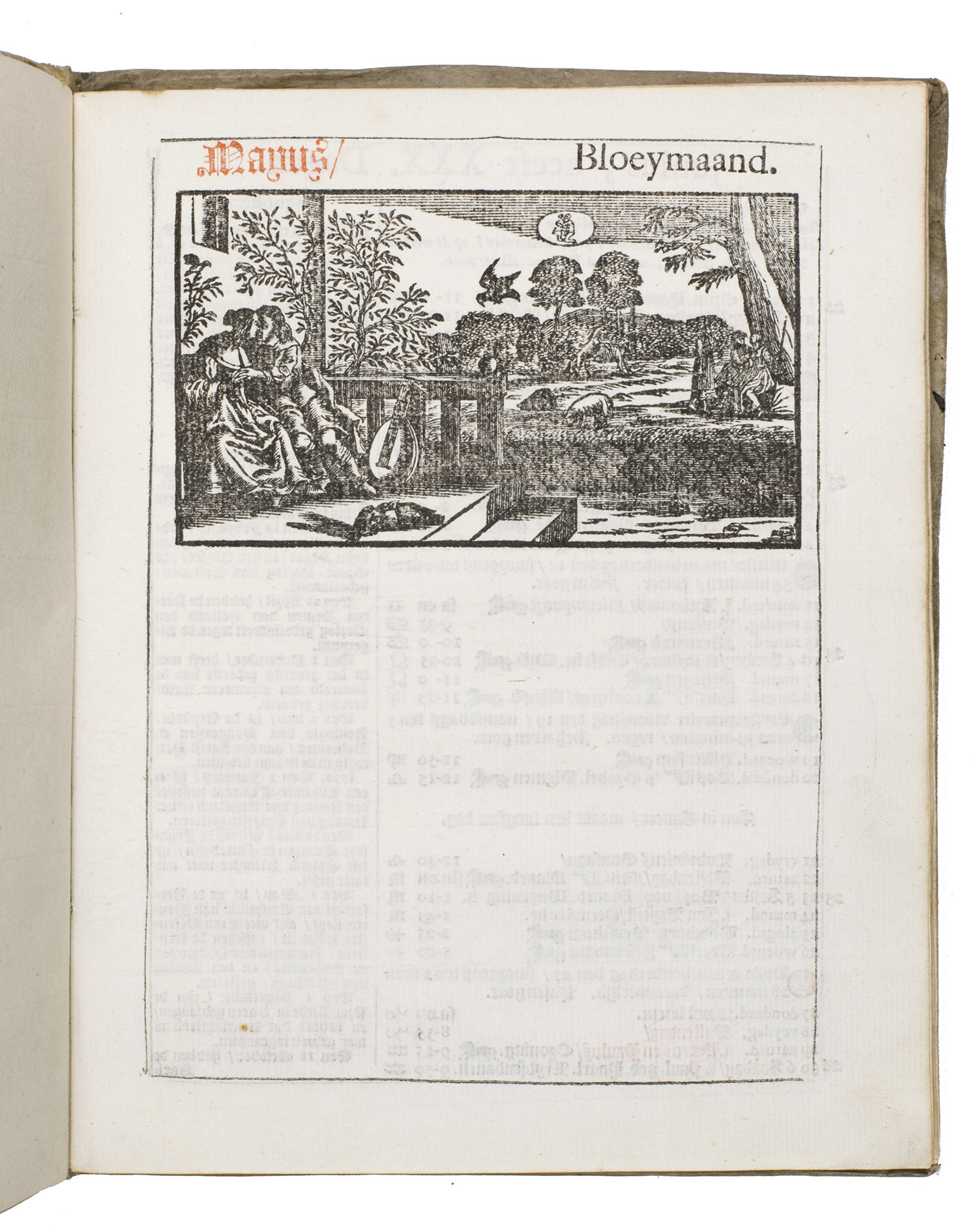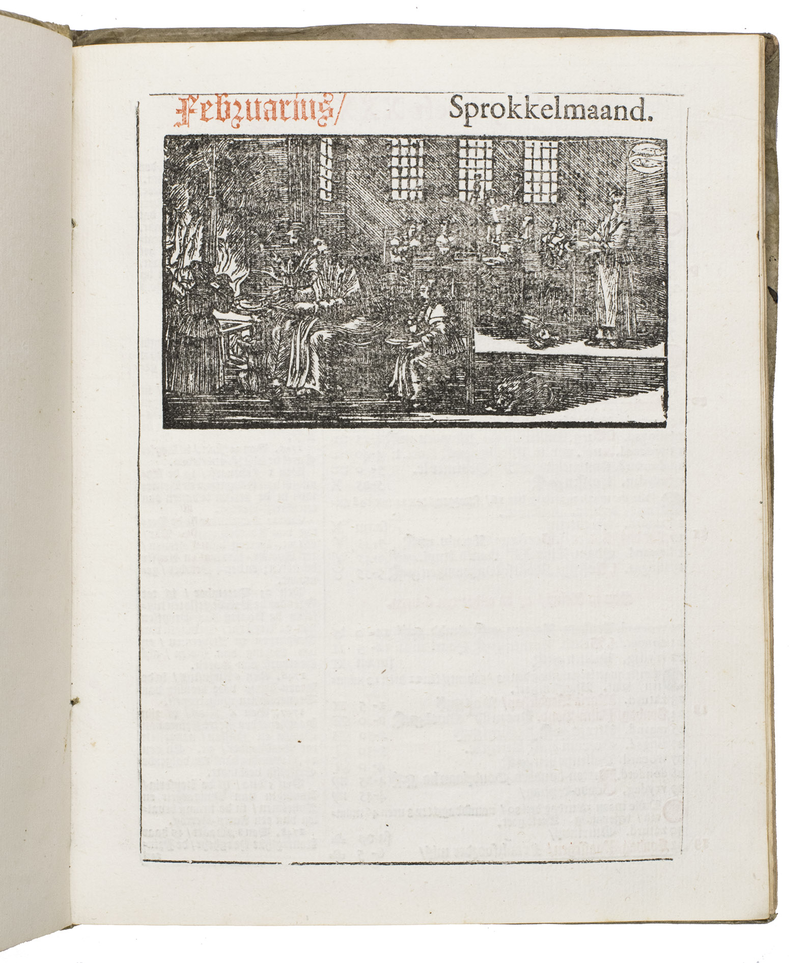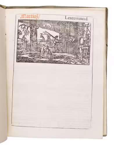 Ad 1: The very popular almanac for the year 1771 published by the heirs of Cornelis Stichter at Amsterdam, in a richly silver-tooled vellum binding, depicting the themes of the work itself with lively baroque ornaments. The "comptoir" or "office" almanac, intended for merchants, business men and office personnel, belonged to the oldest Dutch almanacs. Originally published yearly in various sizes, the present almanac is printed in 4to. The work was composed by Dirk Jansz. van Dam, and consists of an extensive interleaved calendar on 12 leaves containing the days of the month, indicating the phases of the moon, and the dates of the cattle, horse, and leather markets in several places in the country. Each month is illustrated with a half-page woodcut, starts with a poem of four lines, and includes a prognostication and some historical facts which have taken place in that month in previous decades. After the calendar follow the privilege and annual information, including the dates of the official holidays, time-tables for the closing of the city gates, the departure of postal services and passenger coaches and barges, tariff-lists of seals, etc.