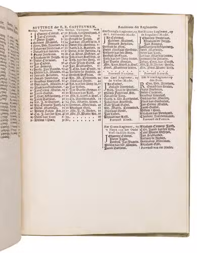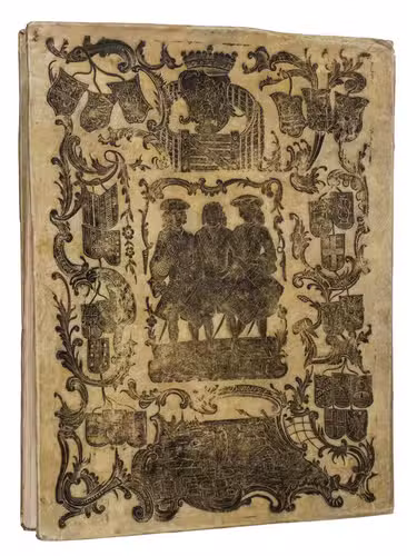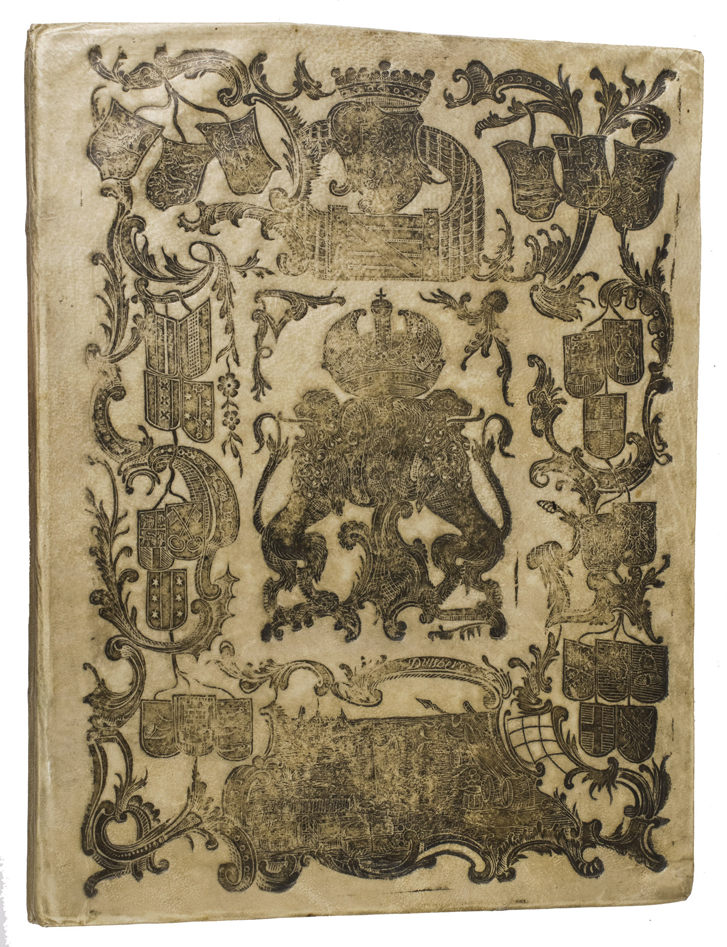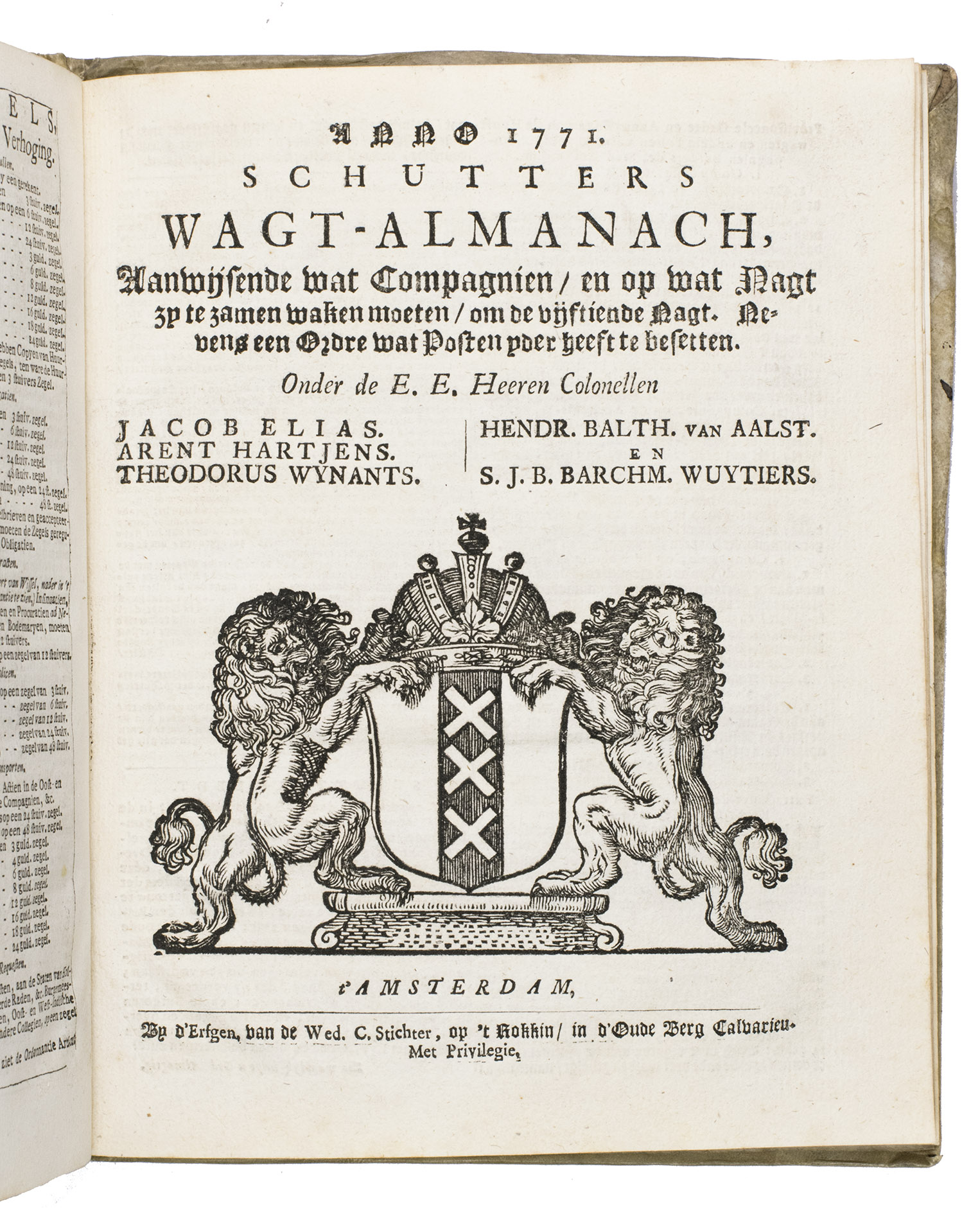 With: [ALMANAC]. Schutters wagt-almanach, anno 1771, aanwijsende wat compagnien, en op wat nagt zy te zamen waken moeten, om de vijftiende nagt. Nevens een ordre wat posten yder heeft te besetten. Onder de E. E. Heeren Colonellen Jacob Elias. Arent Hartjes. Theodorus Wynants. Hendr. Balth. van Aalst. en S. J. B. Barchm. Wuytiers.Amsterdam, the heirs of the widow of Cornelis Stichters, [1770]. 2 works in 1 volume. 4to. With a woodcut printer's device on the title page of ad 1, a large coat of arms of Amsterdam on the title-page of ad 2, and 12 half-page woodcuts, one for each month, printed in red and black in ad 1. Contemporary elaborately silver-tooled vellum, with the coat of arms of Amsterdam in the centre of the front board, and an impression of three drummers on the back, both signed "Duisburg F[ecit]", both boards with a baroque ornamental border, with the coats of arms of each of the seven Dutch provinces at the top (with that of Holland prominently in the middle), the coats of arms of the 20 largest Dutch cities on the sides (Dordrecht, Delft, Amsterdam, Haarlem, Rotterdam, Leiden, Gouda, Hoorn, Alkmaar and Enkhuizen on the left side; Middelburg, Vlissingen, Amersfoort, Arnhem, Nijmegen, Groningen, Leeuwarden, Franeker, Zwolle and Deventer on the right side), and at the bottom an image that probably shows the transfer of goods near a city. [32]; [5], [1 blank] pp.