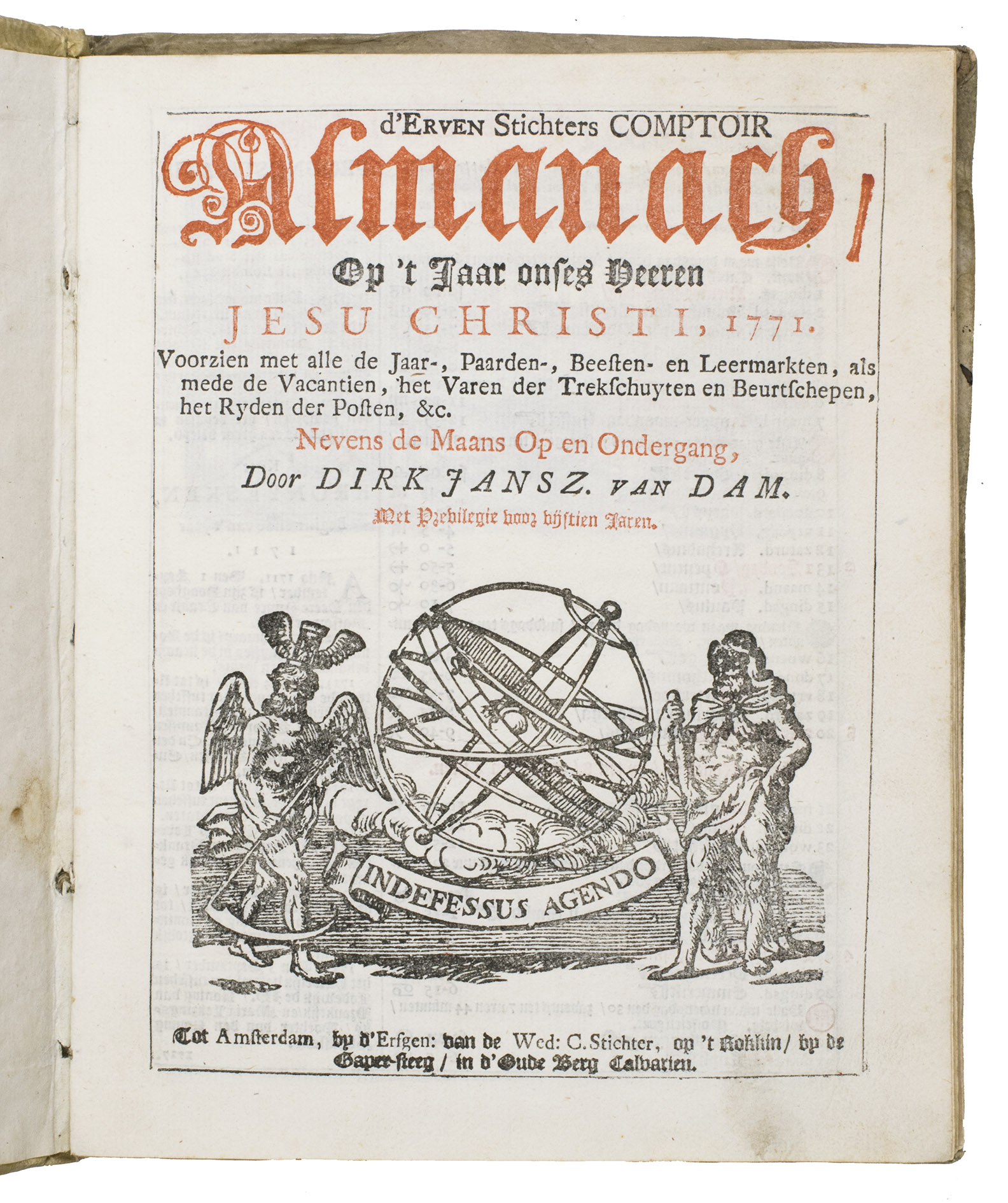 Almanach, d'erven stichters comptoir op 't jaar onses Heeren Jesu Christi, 1771. Voorzien met alle de jaar-, paarden-, beesten- en leermarkten, als mede de vacantien, het varen der trekschuyten en beurtschepen, het ryden der posten, &c. Nevens de maans op en ondergang.