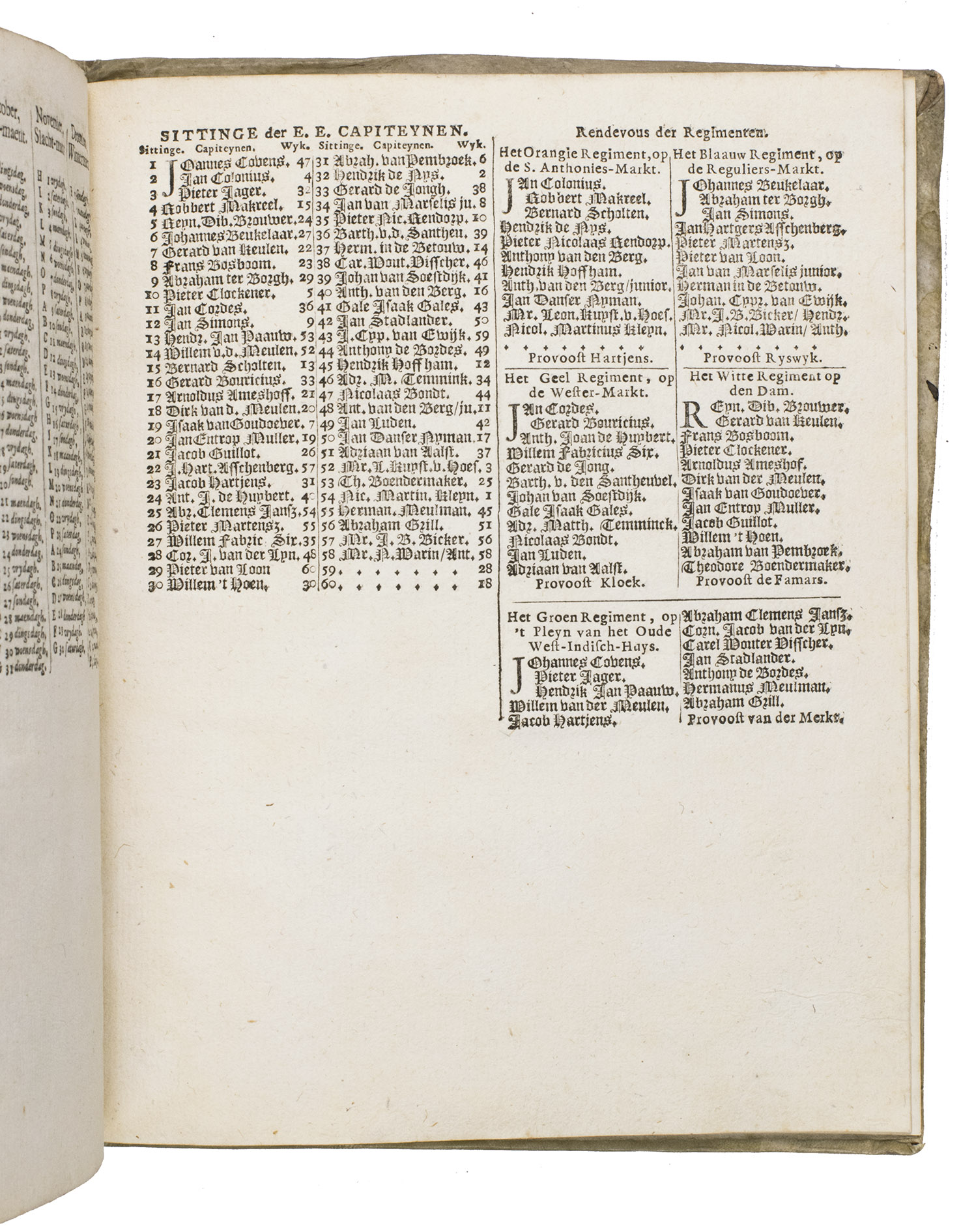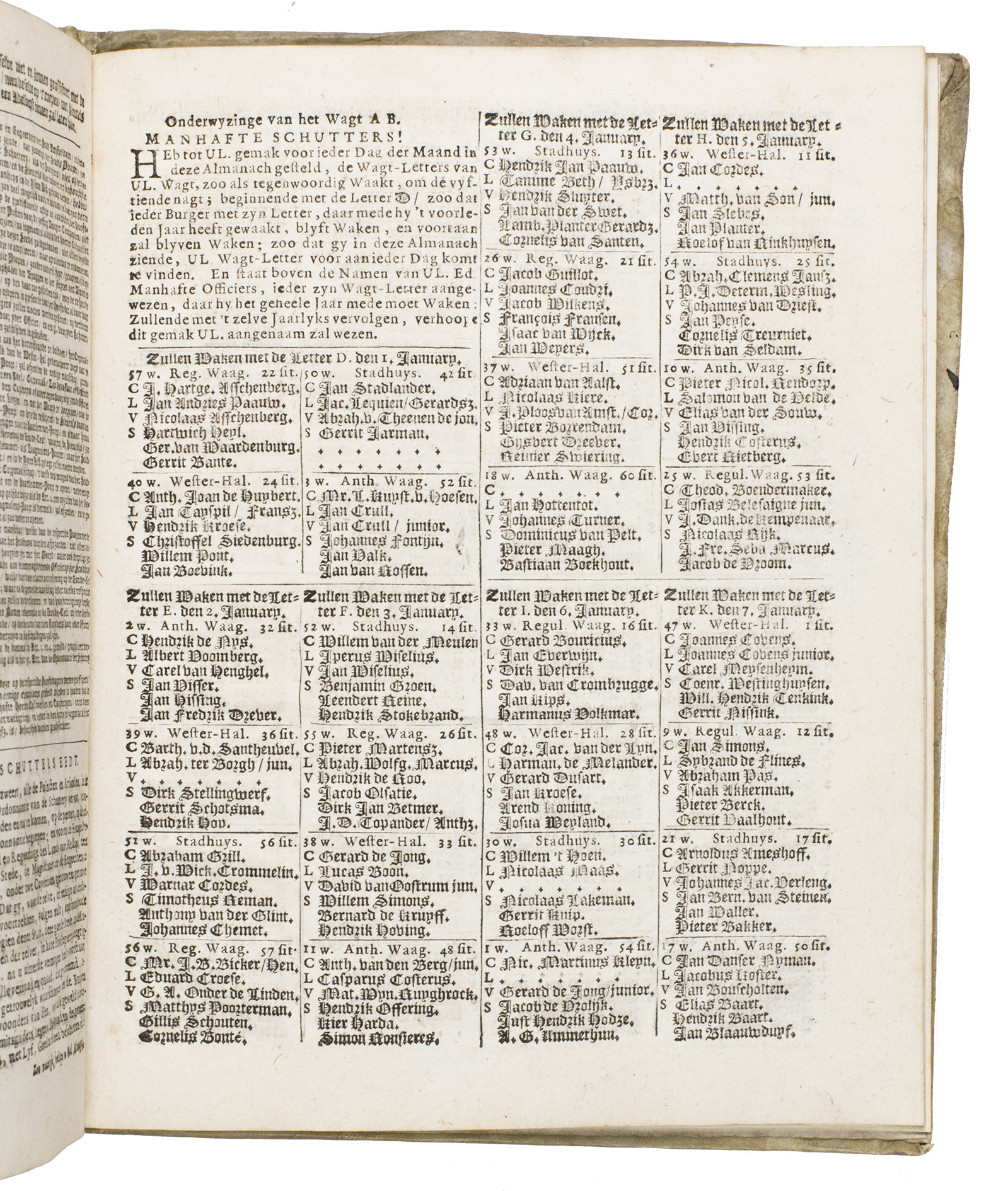 Ad 2: After the calendar follows under a separate title (Anno 1771. Schutters wagt-almanach ...) a quire of four leaves with time-tables and posts for the year 1771 for the sixty companies of the Amsterdam night watchmen, more than a century after Rembrandt completed his Night Watch.Strom van Leeuwen records another copy of the same almanac, for the year 1782, bound in exactly the same vellum with the same silver-tooling as our copy, from an unidentified Amsterdam bindery.