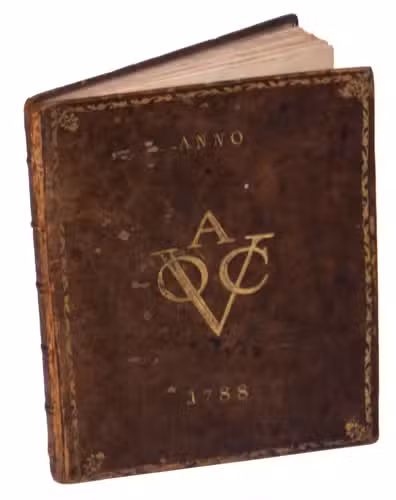 Popular Dutch almanac for the year 1788 in a remarkable contemporary Dutch East India Company (VOC) binding. The work was bound by the so-called Acorn-and-Foliage Tool Bindery (Storm van Leeuwen) and shows the large monogram of the Amsterdam Chamber of the VOC sandwiched between the date "Anno 1788" on both boards. As noted by Storm van Leeuwen, in the 18th-century this VOC A stamp "... was apparently used on almanacs that were given as gifts to persons important to the VOC. Examples form the Acorn-and-Foliage Tool Bindery ... are known, containing almanacs from 1777 and 1784." (p. 175). We are certain that the present binding is by this Acorn-and-Foliage Tool Bindery, as it is practically identical to their 1777 VOC A binding (see Storm van Leeuwen I, p. 614, no. 200). Interestingly, this means that the present binding is the latest Acorn-and-Foliage Tool Bindery now known; Storm van Leeuwen noted that the bindery was active between ca. 1760 and ca. 1784 but it clearly continued for a few years after.