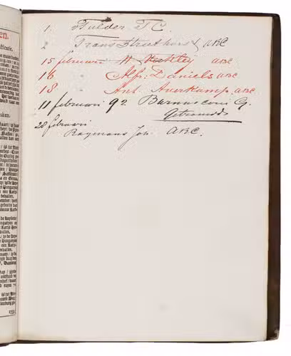 This copy is interleaved with 24 blank leaves (2 leaves between the facing pages of each month) including 12 containing several 19th-century manuscript annotations in black or red ink (a few are crossed out in red ink). These inscriptions detail the birthdays and other personal information, presumably, of relatives and acquaintances of an unidentified owner. Thus, it was more a birthday calendar and notebook than an almanac for one specific year, meaning that the owner(s) could make use of the work in its remarkable binding for years to come. Most of the inscriptions seem to refer to dates of birthdays etc., but only a few include a clear mention of a year; one is "10 juni 1859" and the other is "23 januari - 30 augustus } 1891". This suggests that the 1788 almanac was most heavily used during the second half of the 19th century.