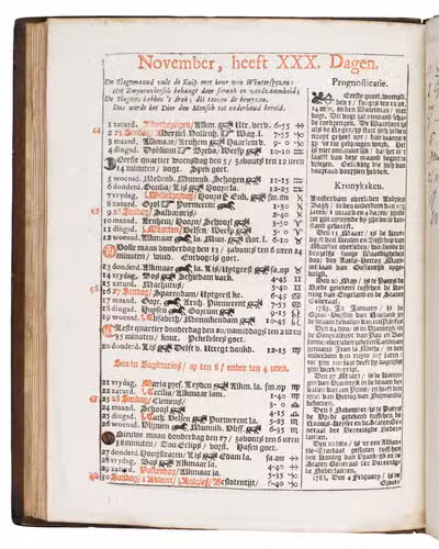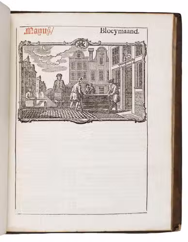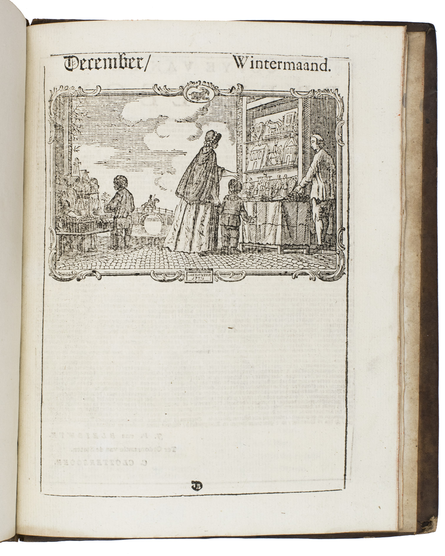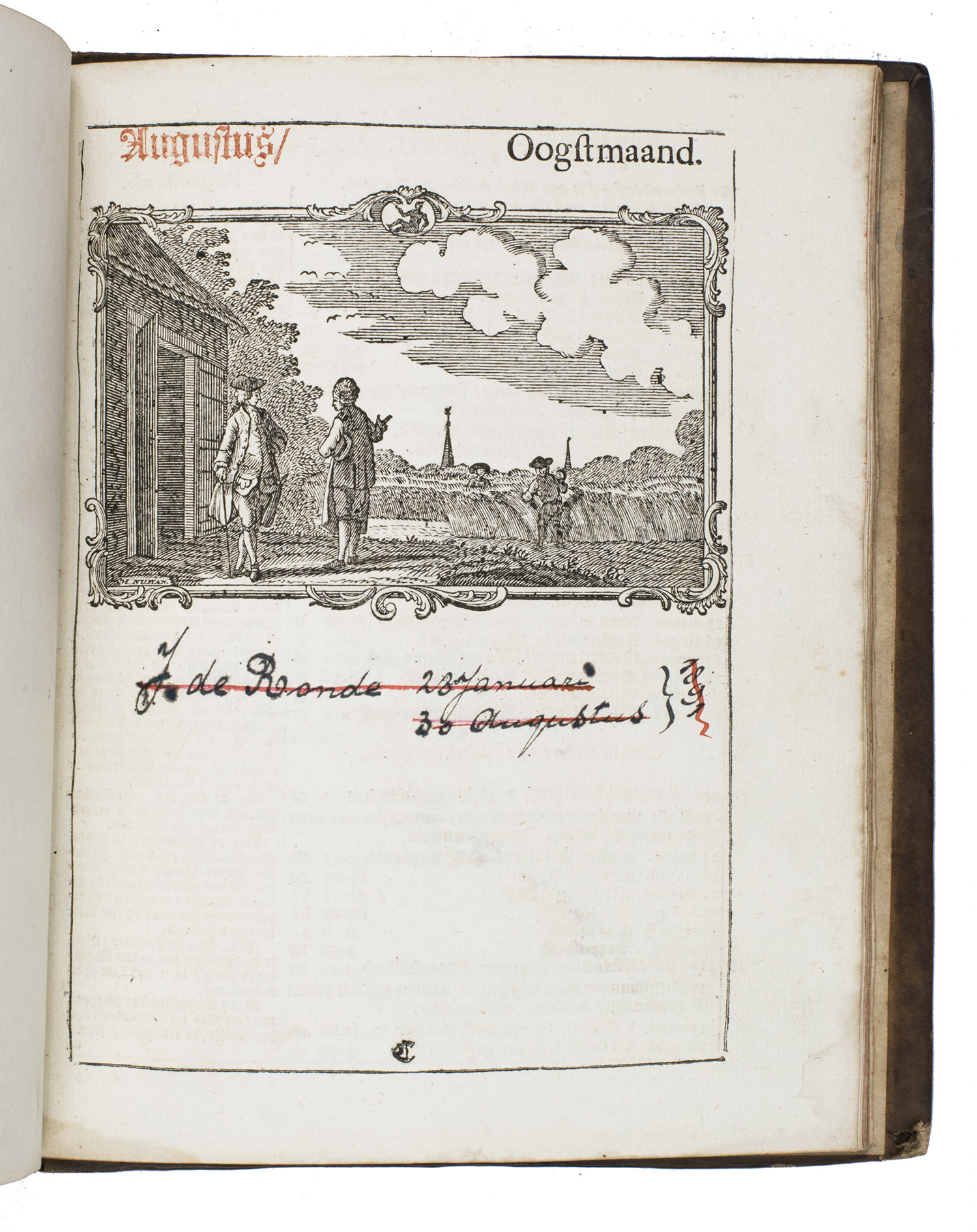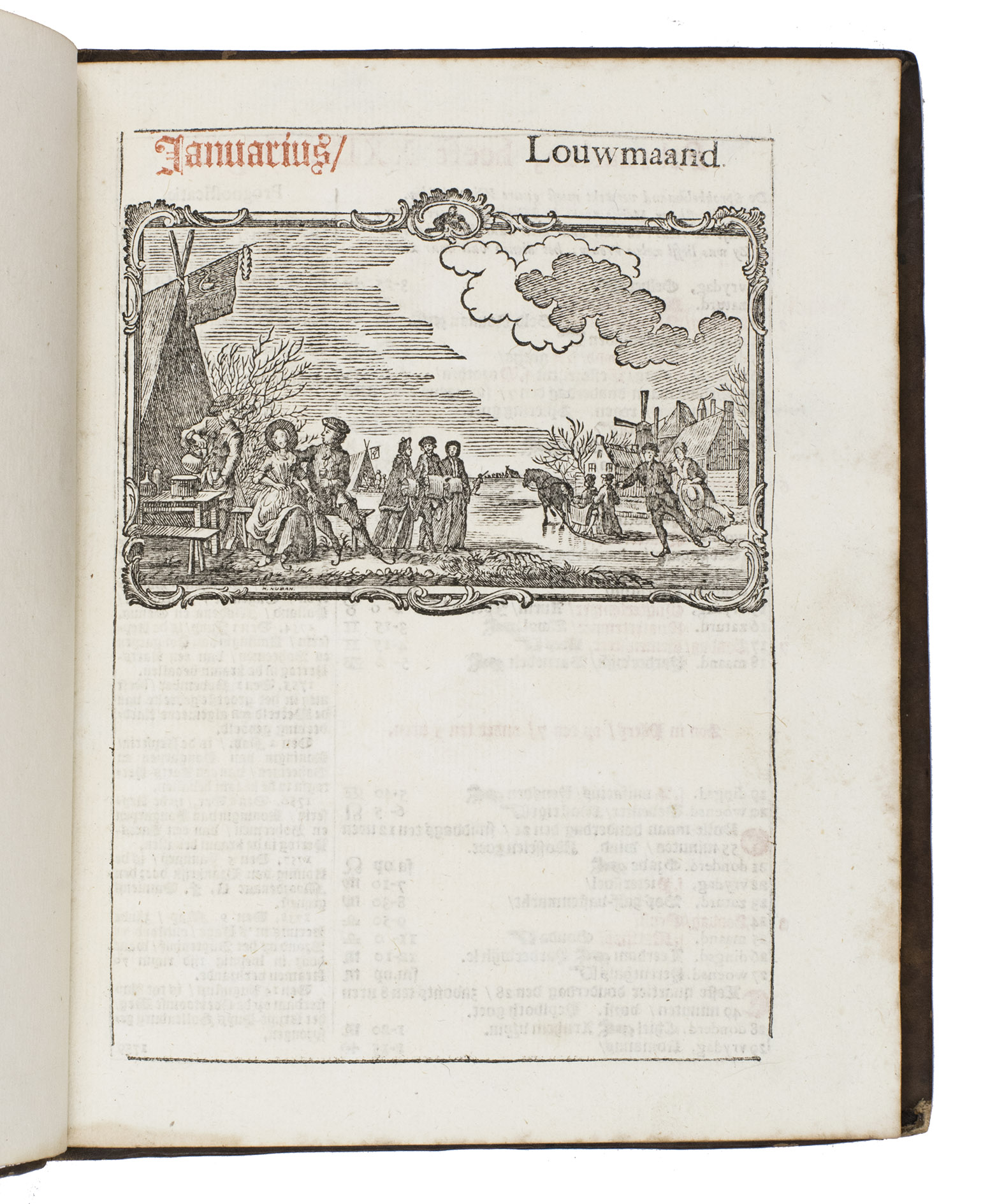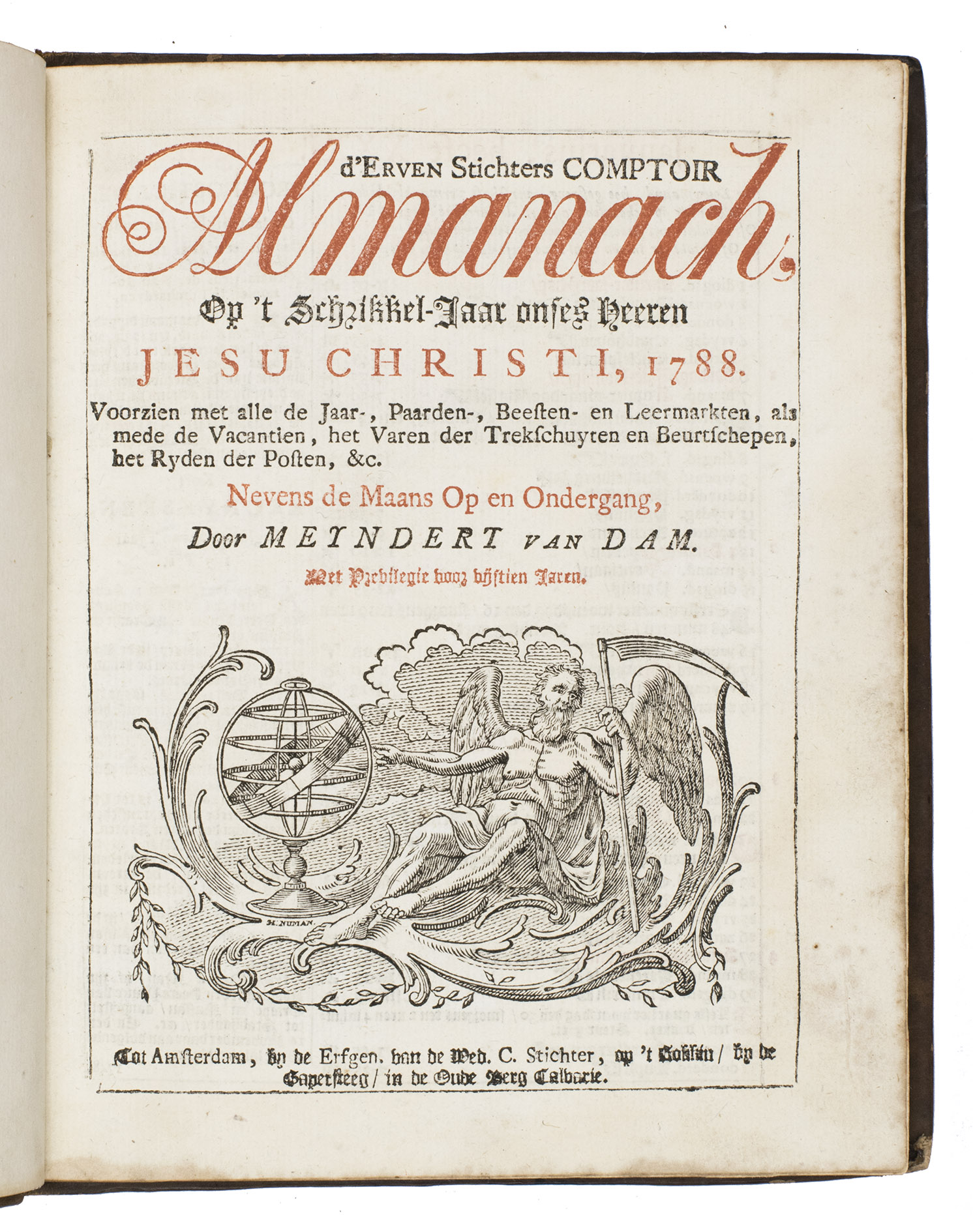 Amsterdam, the heirs of the widow of Cornelis Stichter, [1788]. 4to. With the title page and 23 calendar pages printed in red and black, a half-page woodcut vignette (depicting Father Time pointing at an armillary sphere) by Hendrik Numan on the title page and 12 half-page woodcut illustrations for the 12 months (each ca. 7 x 11 cm) by Hendrik Numan, nearly all signed in the block (including two dated "1779"). Contemporary gold-tooled brown mottled calf, bound by the so-called Acorn-and-Foliage Tool Bindery in Amsterdam (Storm van Leeuwen). Both boards show the large gold-tooled monogram of the Amsterdam chamber of the VOC as a centre piece sandwiched between the gold-tooled date "Anno 1788", all within a gold-tooled floral frame with floral corner pieces in the inside corners. [16] ll. interleaved with 24 blank (except for manuscript annotations) ll.