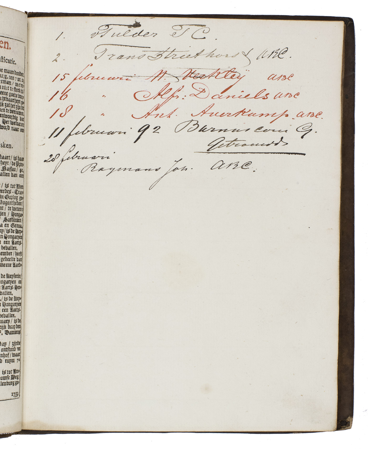 With 19th-century annotations on the interleaved blank leaves and on the recto of the first free flyleaf ( "Verjaardagen etc."). The binding is somewhat rubbed and the hinges show signs of wear, without affecting the integrity of the binding. Internally only very slightly browned along the edges of the margins. Otherwise in very good condition. Landwehr/Van der Krogt, VOC, pp. XXVII-XXVIII; STCN 292197853 (2 copies); Storm van Leeuwen I, pp. 174-176 (for the almanac) and p. 196 (VOC A stamp) and pp. 612-616 (the bindery).