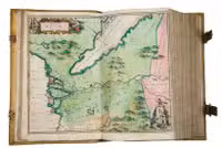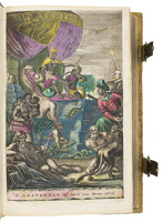 Amsterdam, Jacob van Meurs, 1676. 3 works in 1 volume. Folio (33 x 22 cm). With a richly engraved allegorical frontispiece, a large folding engraved map of Africa (44.5 x 56 cm), 14 double-page engraved maps of parts of Africa and the adjacent islands, 27 double-page and 1 larger folding engraved plates and views, and 55 half-page engraved views, plans, illustrations of costumes, animals, plants, etc. in the text. All illustrations coloured by a contemporary hand. Contemporary vellum at a later date with elaborate blind-tooled decorations, including oriental portraits. With 2 decorated brass clasps, signed B-I. [6], 428, 349, [16]; [1], 121, [4] pp.