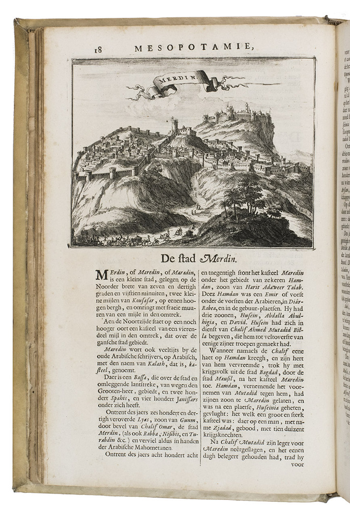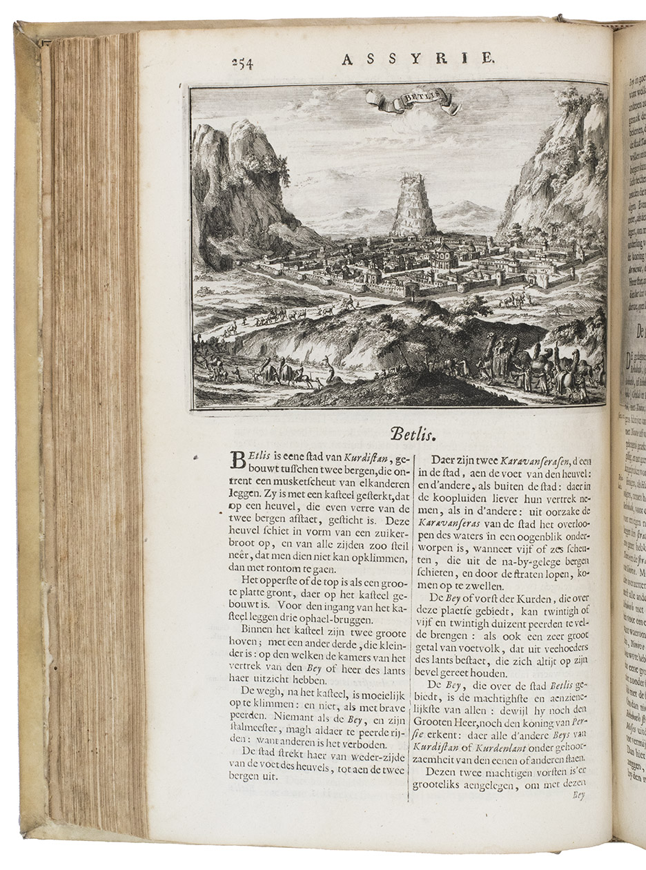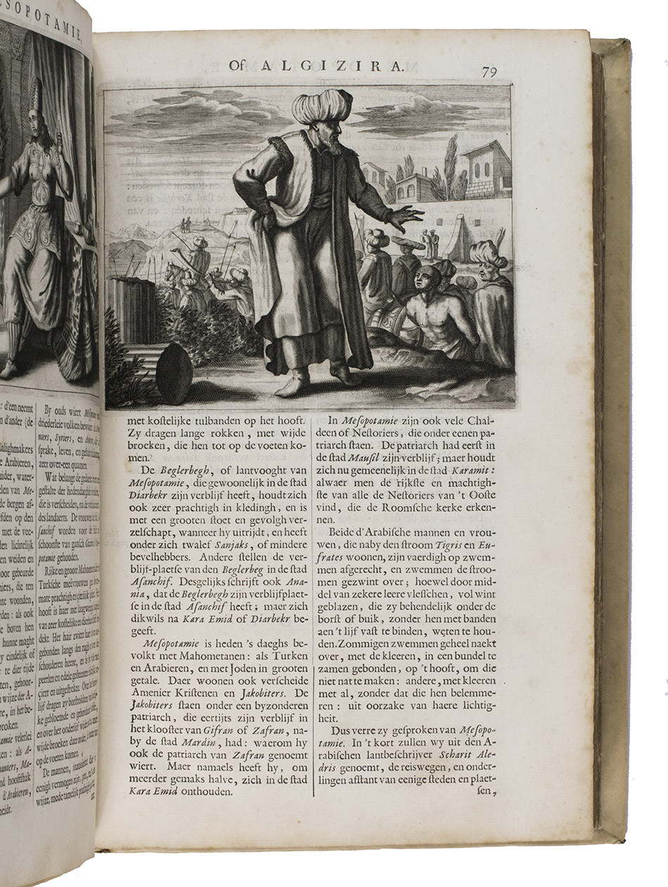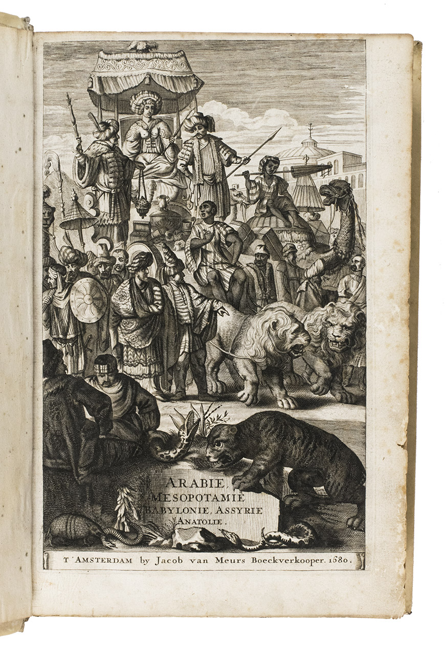 Amsterdam, Jacob van Meurs, 1680. Folio. With engraved frontispiece, 3 double-page maps (of Basra and surroundings, Anatolia and the Arabian Peninsula), 12 double-page or folding views (partly drawn by Charles Vasteau). Near contemporary blind-stamped vellum. [8], 357, [3], 324, [4] pp.