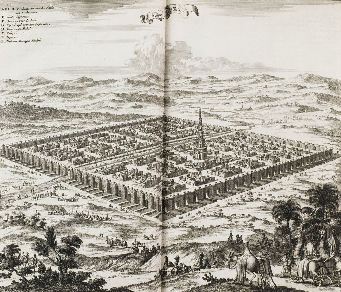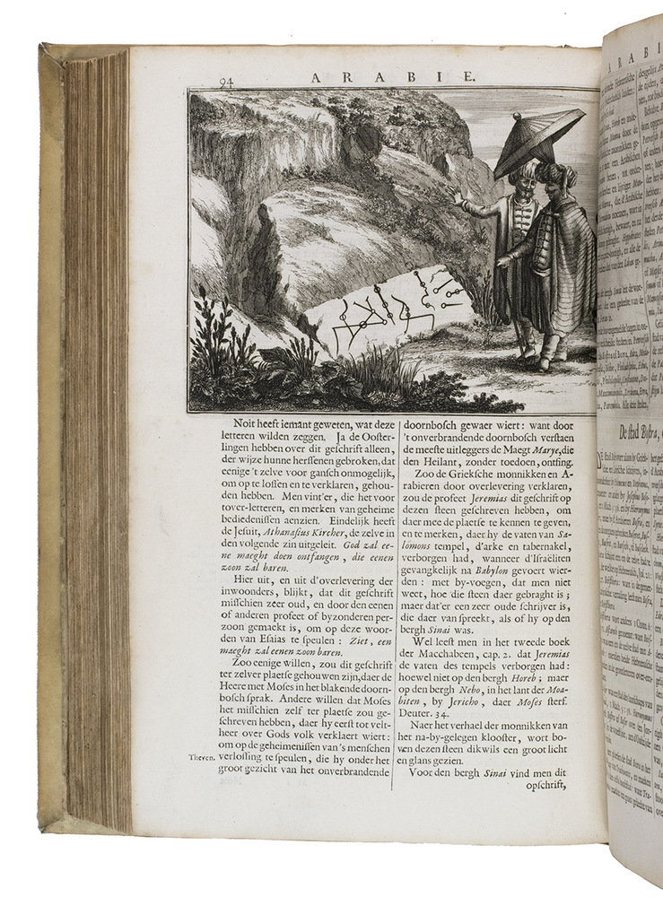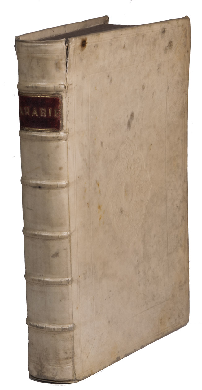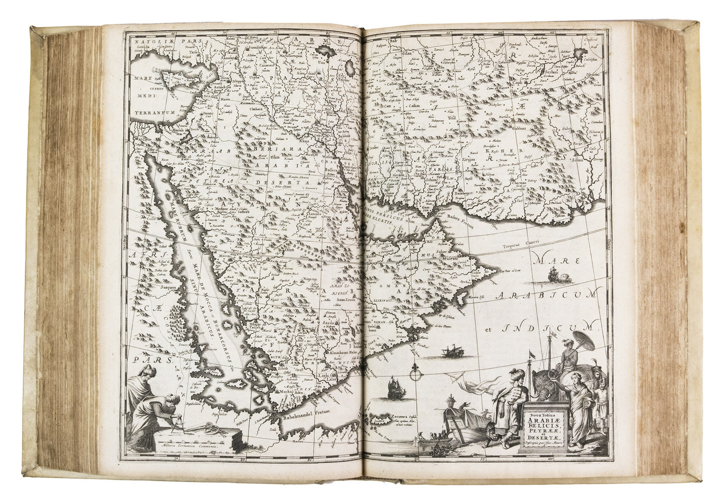 Amsterdam, Jacob van Meurs, 1680. Folio. With engraved frontispiece, 3 double-page maps (of Basra and surroundings, Anatolia and the Arabian Peninsula), 12 double-page or folding views (partly drawn by Charles Vasteau). Near contemporary blind-stamped vellum. [8], 357, [3], 324, [4] pp.